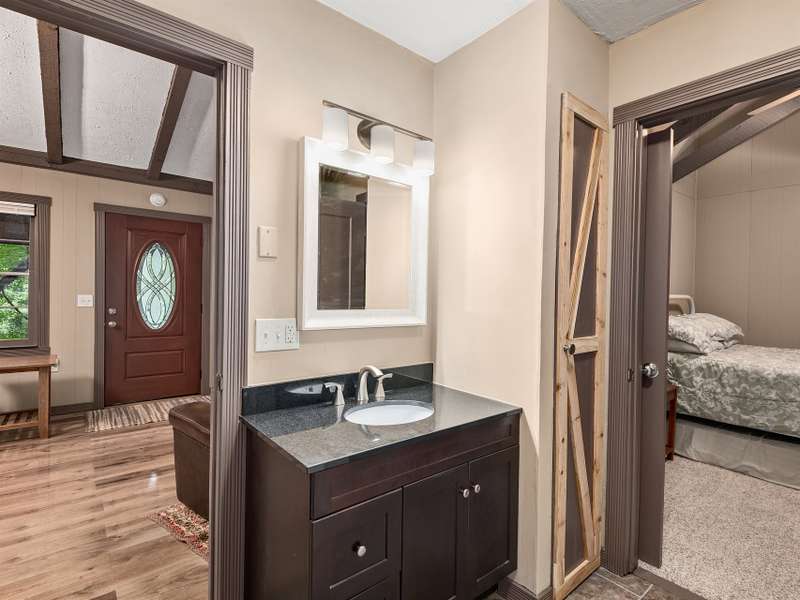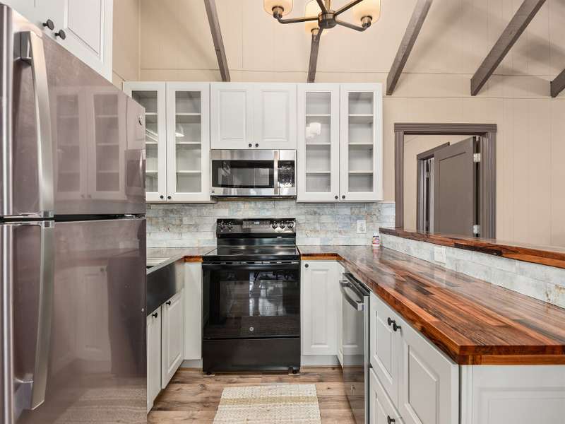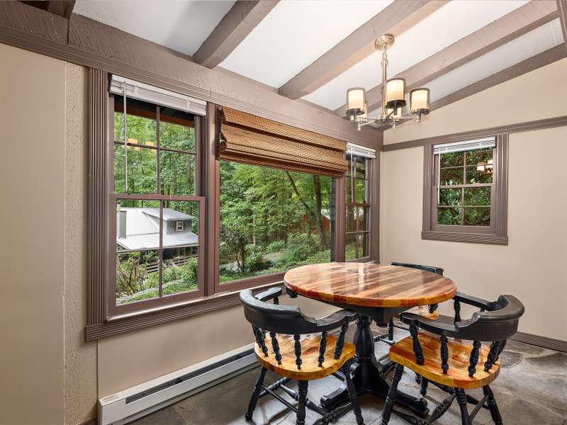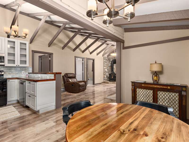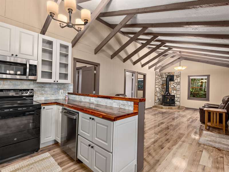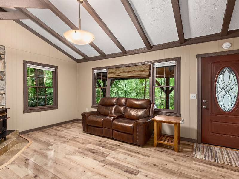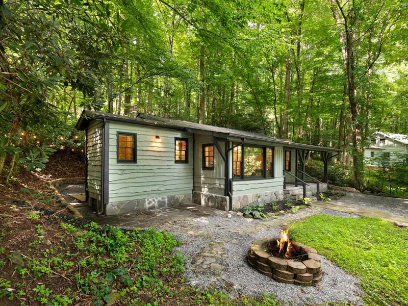 Tucked beneath a canopy of trees in the heart of Maggie Valley, this updated mountain cottage is fullof charm and ready for full-time living or use as a vacation rental. Vaulted ceilings with exposedbeams, a cozy wood stove, and luxury vinyl plank flooring create a warm, inviting feel. The kitchenfeatures butcher block counters, stainless steel appliances, glass-front cabinetry, and a farmhousesink. Two bedrooms and a full bath offer comfortable accommodations. Recent updates include a newductless mini split for efficient heating and cooling. Relax on the covered front porch or under thebackyard string lights. Stone paths, a gravel drive, and a peaceful wooded setting complete thepicture. Just minutes to dining, shopping, and year-round mountain adventure!