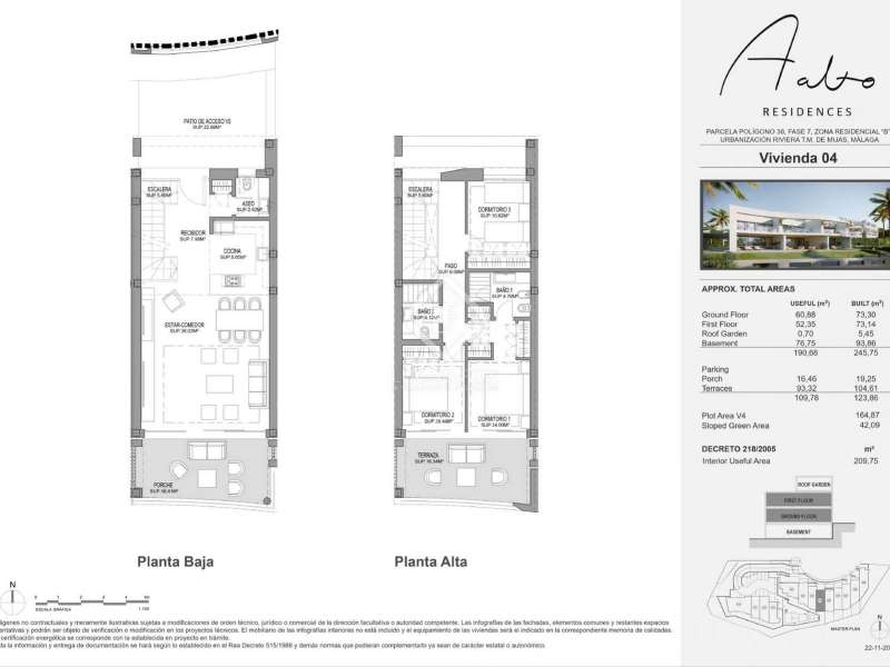 Aalto Residences is a brand-new development offering 13 unique townhouses just minutes away from Marbella. The name, Aalto, is Finnish for "wave" and was inspired by the elegant Scandinavian design which blends harmoniously with the surrounding nature and the stylish curved façade of the buildings. This south-facing, energy-efficient home enjoys panoramic sea views and breathtaking sunsets from the rooftop terrace and is situated next to a green area with beautiful trees and a little park where you can walk and enjoy the fresh sea breeze. The house measures 245 m² and boasts an additional 114 m² of outdoor space, between the porches, and terraces. Stepping inside this 3-bedroom home, we are immediately aware that the highest quality materials have been used. The living area is bright and serene, while the minimalist design, straight line "open" kitchen with laminated finishes, Dica cabinetry and Siemens appliances is a delight to cook in. Sleek, contemporary bathrooms feature Duravit sanitaryware, Hansgrohe taps and elegant shower screens and finishes. An aerothermal system is installed in the homes for underfloor water heat system, hot water and air conditioning, along with a general home automation system, and all windows and sliding doors in dark grey/black lacquered aluminium. The delightful communal garden has a shared pool to cool off in during the summer, and the owner of each new townhouse may opt for a private jacuzzi pool on the rooftop terrace if they wish. All the houses have a lower ground floor that can be designed for any use the client wishes (gym, sauna, bar, cinema, etc). The properties come with a parking space included in the price, with the option to purchase further spaces if required (various options: sheltered car park space for €15,000 underground car park space with storage room €25,000; this underground car park has a lift) Please contact us for further information.