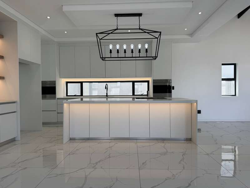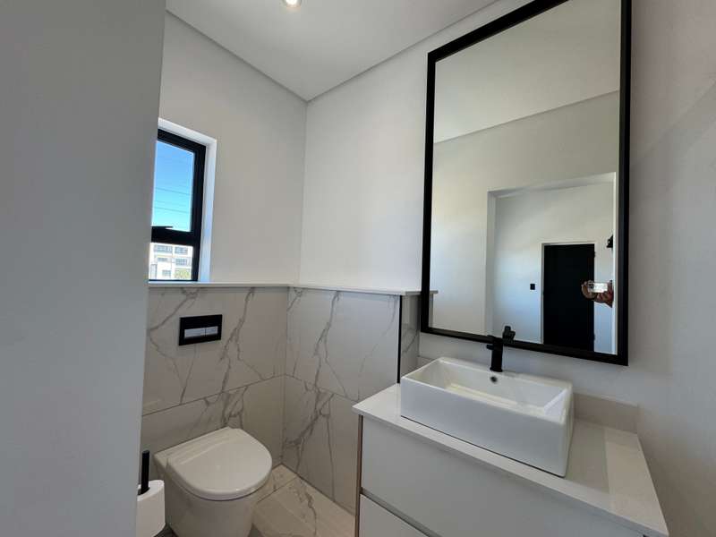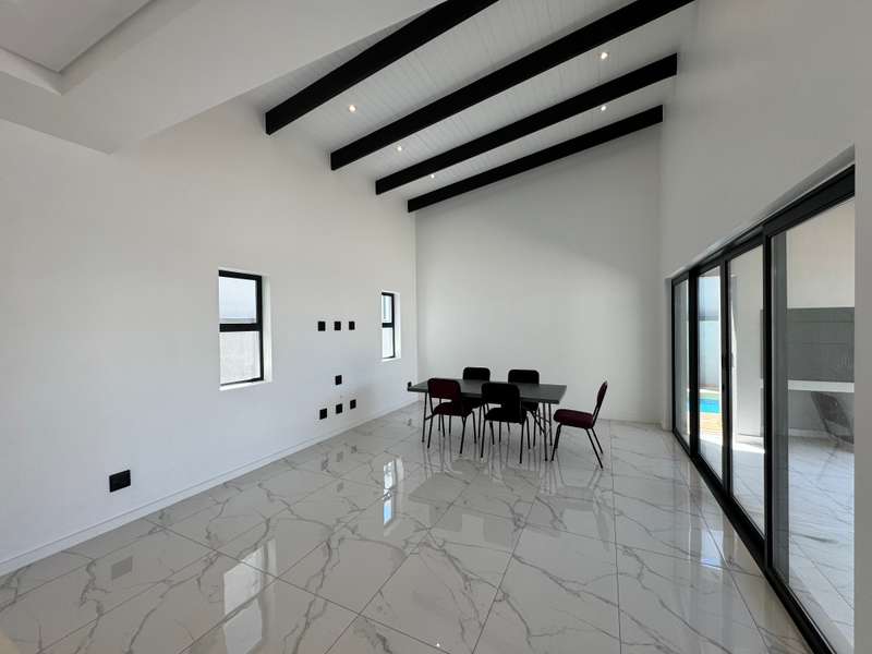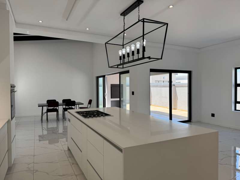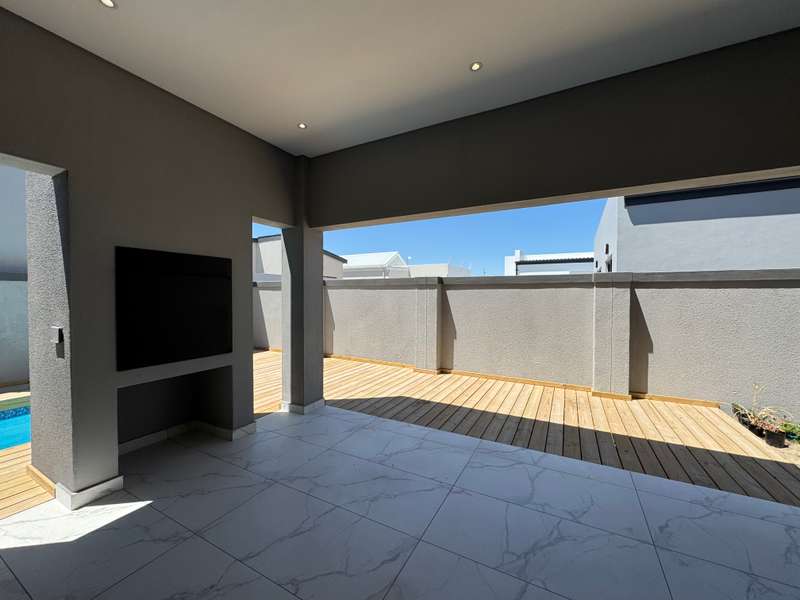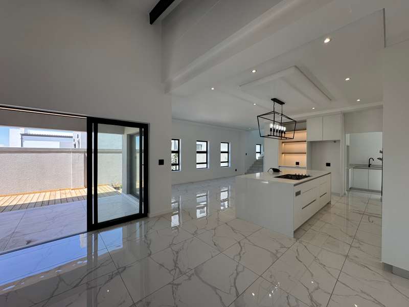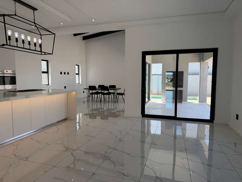 This brand-new home in the latest phase of the sought-after Sandown Lifestyle Estate is designed to impress even the most discerning buyers. Offering the pinnacle of luxury living, it provides an unparalleled lifestyle. The property boasts three generously sized bedrooms, each with its own en-suite bathroom, ensuring comfort and privacy. The stunning kitchen is a chef’s dream, featuring a spacious center island, sleek engineered stone countertops, ample top-to-bottom cabinetry, and a hidden scullery equipped for all appliances. Expansive living areas seamlessly flow from the lounge and dining room to a sheltered, wind-free braai patio, overlooking a sparkling blue pool—perfect for entertaining. The double automated garage offers direct access to the home for added convenience. With no transfer duty payable and immediate availability for occupation, this is an opportunity you don’t want to miss. Call us today—you’ll be glad you did! Contact agent for street address.