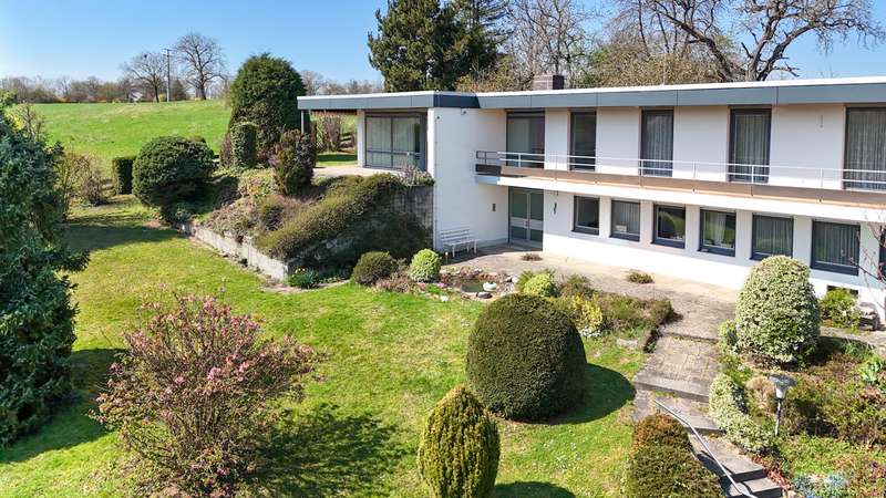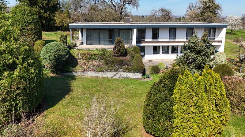 This spacious detached house with granny apartment was built in 1966 in the bungalow style and is characterized by its impressive architecture. The house, designed by architect Riehle, has a living space of around 309 m² and extends over 2 spacious floors. The spacious plot with an area of approx. 1432 m² is situated in a fantastic location on the outskirts of the village with far-reaching views. The property is in a quiet location, nestled in a spacious garden. The house has a total of 11 rooms. These are distributed over the main apartment on the entire upper floor and offices on the first floor. There are 5 bedrooms, a large living room with huge windows, a kitchen with adjoining dining room and a bathroom. From the balcony you can enjoy the view over the whole of Reutlingen as far as the Swabian Alb. There is a spacious granny apartment on the first floor, which can be used as an office, a separate apartment or you can combine it with the upper apartment. The property includes a balcony and an outdoor seating area, which serve as inviting retreats on sunny days. These offer a variety of opportunities for outdoor activities or simply relaxing. The offer is rounded off by an over-height double garage, ideal for the company fleet or for parking motorhomes. The house is heated by an oil-fired central heating system. The quiet yet well-connected location of this property makes it particularly appealing to buyers who value a combination of retreat and urban proximity. The location also offers excellent public transport connections and various shopping facilities.