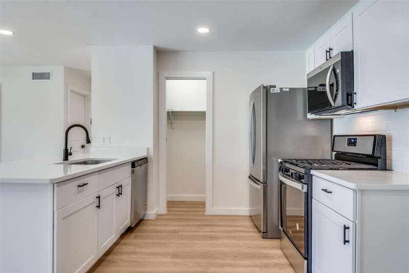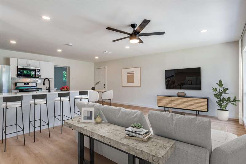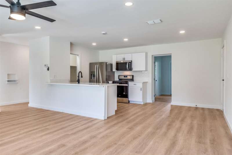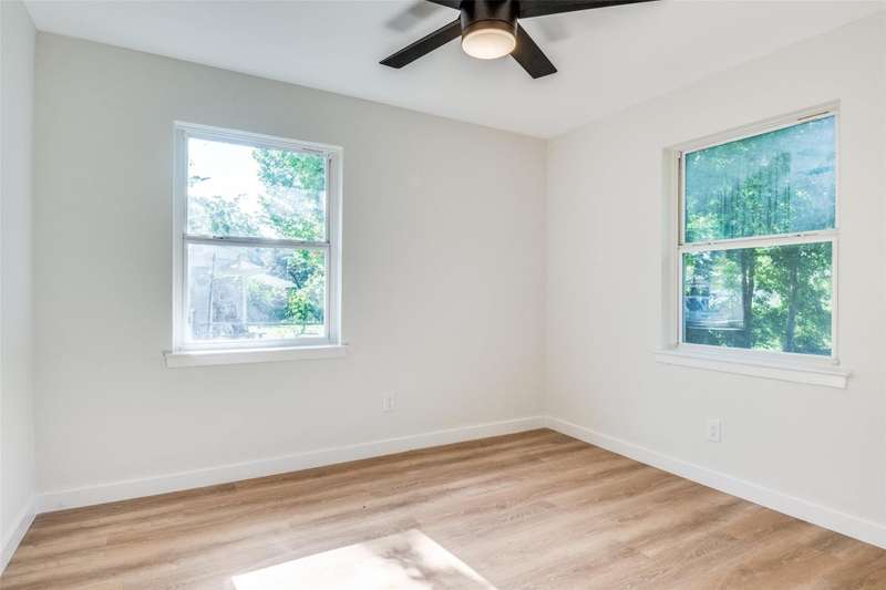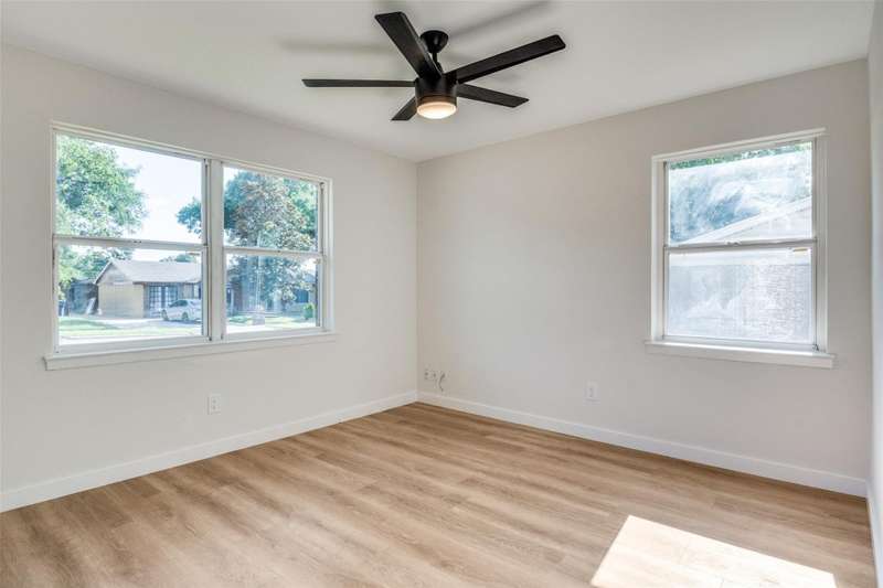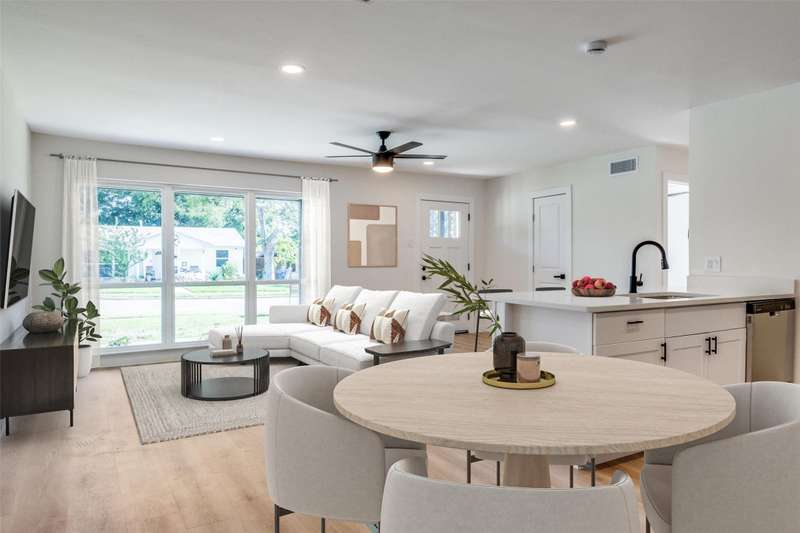 This fully renovated single-story blends timeless curb appeal with todays modern design. White siding with black accents and original brickwork create a polished, inviting exterior. Inside, the open-concept layout showcases wood-look floors, neutral finishes, matte black fixtures, and recessed lighting giving the home a bright, turnkey feel.The kitchen anchors the living area with crisp white cabinetry, sleek hardware, and a streamlined design, while oversized windows in the dining space bring in natural light and warmth. Four bedrooms offer flexibility for family, guests, or a home office, and two updated bathrooms feature spa-inspired tilework and contemporary finishes.Step outside to a spacious fenced yard shaded by mature trees, perfect for relaxing, gardening, or entertaining. An attached garage provides added convenience and storage.Located near Garlands Firewheel area, the home is just minutes from Firewheel Town Center, parks, golf, and quick access to President George Bush Turnpike for easy commuting throughout DFW.Preferred lender is featuring a special financing program for this home see listing documents for details.