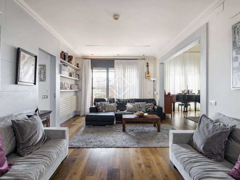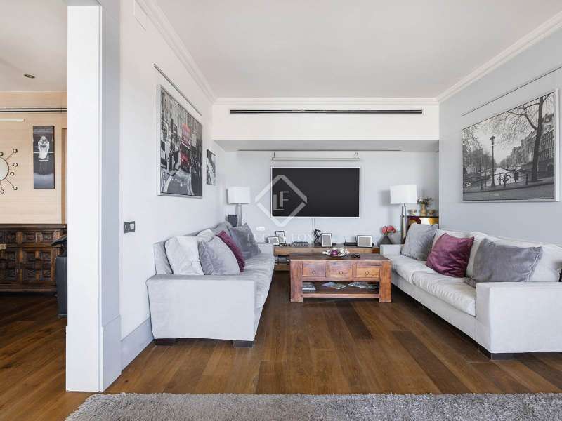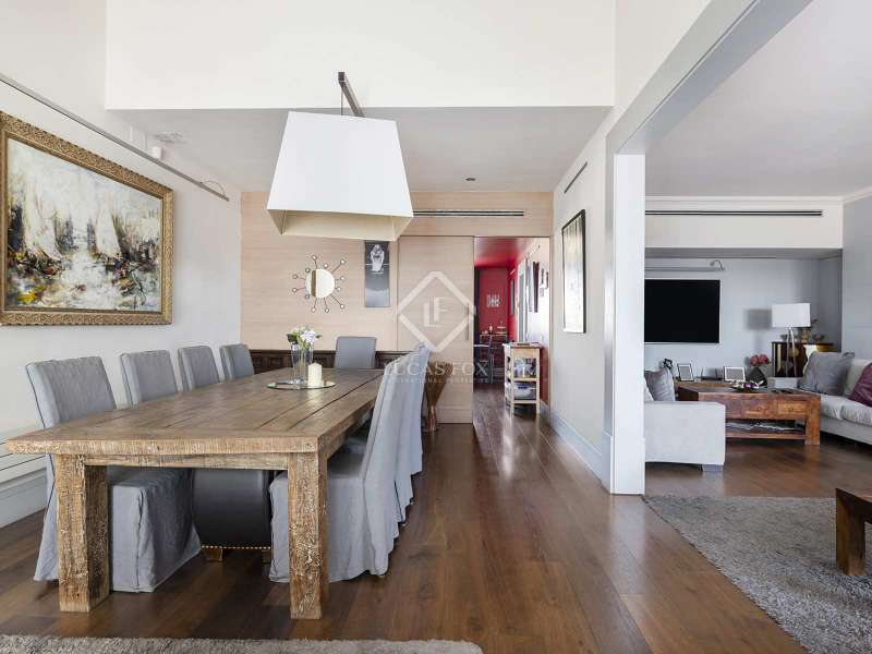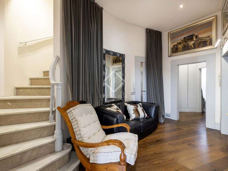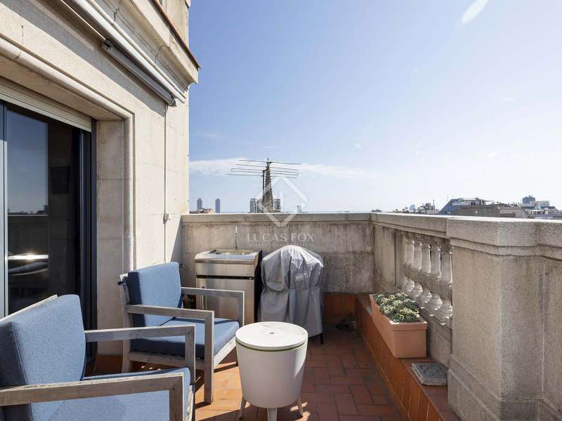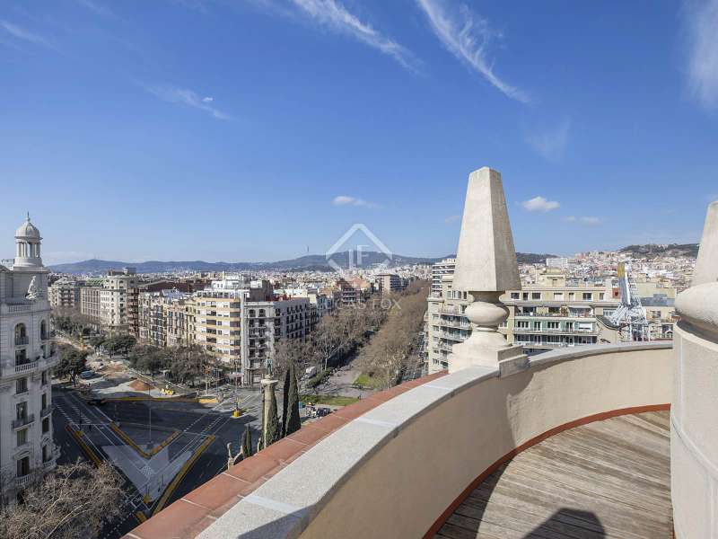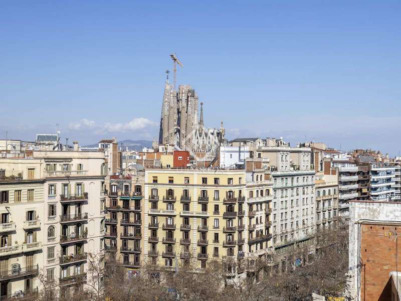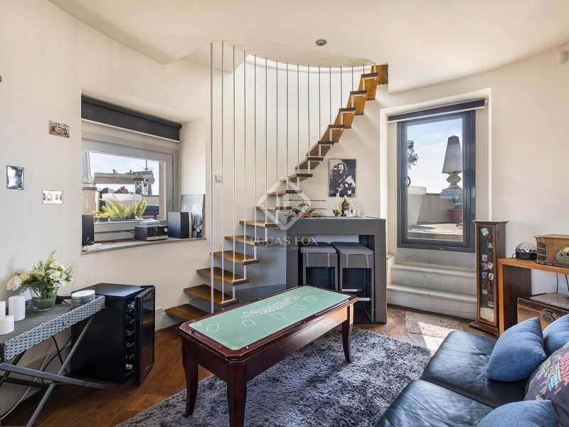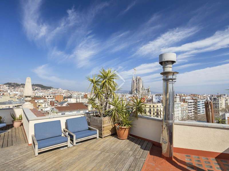 This stunning penthouse hosts 269 m2 distributed across two floors and a turret with 360º exposures. With straight access from the main lift, we walk through a hall that leads to a large central space composed by the living area and a dining room and an access to a terrace at the same level. A full equipped and red lacquered kitchen, is directly connected to the dining room and features a large window framing Gaudi’s masterpiece, Sagrada Familia. On the same floor there are three bedrooms, one en-suite and two double bedrooms with their own bathroom. All the rooms are exterior facing and are surrounded by terraces. Moreover, oversize windows allow for abundant light to stream across the interiors with high-ceilings. On the upper floor we find a room with access to 200 m2 of terraces hosting chill-out areas, a swimming pool and a jacuzzi. In addition, an interior spiral staircase on the same floor, leads to a turret on a third level spanning 360º views over Barcelona. The penthouse is well preserved with high quality finishes, air conditioning and heating, but it also offers the opportunity have the interiors renovated to contemporary standards, to convert it into one-of-a-kind piece in Barcelona city. Contact us for more information or to arrange a viewing.