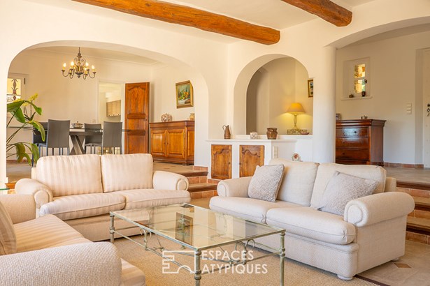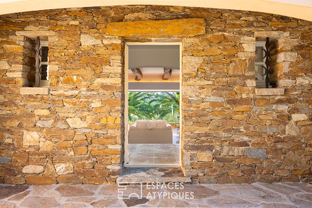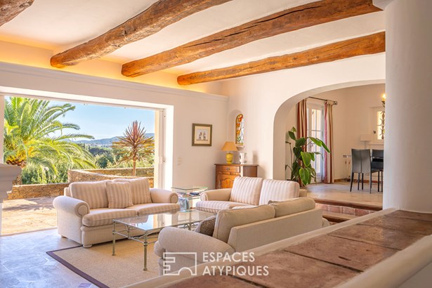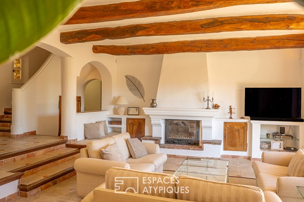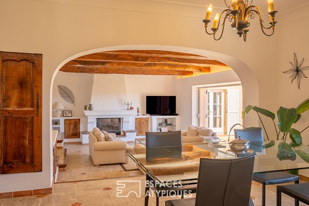 This reception area flows seamlessly onto the terrace overlooking the swimming pool and its local stone deck, offering a magical panorama.