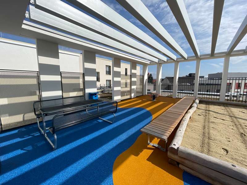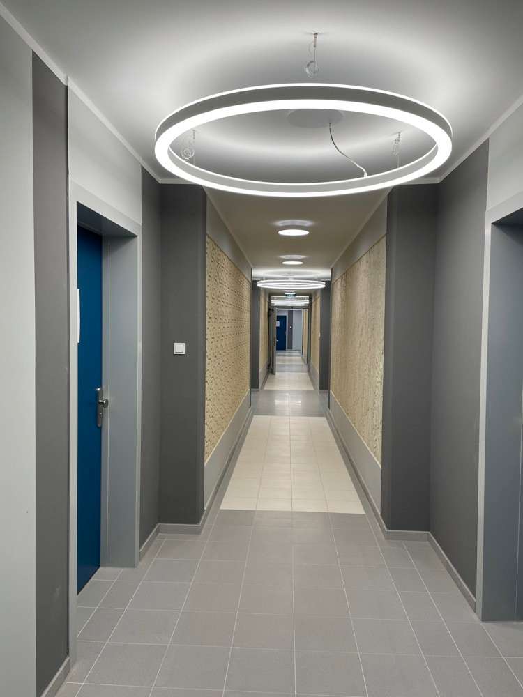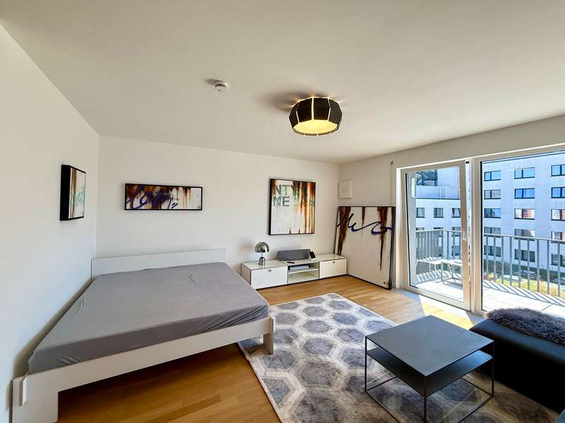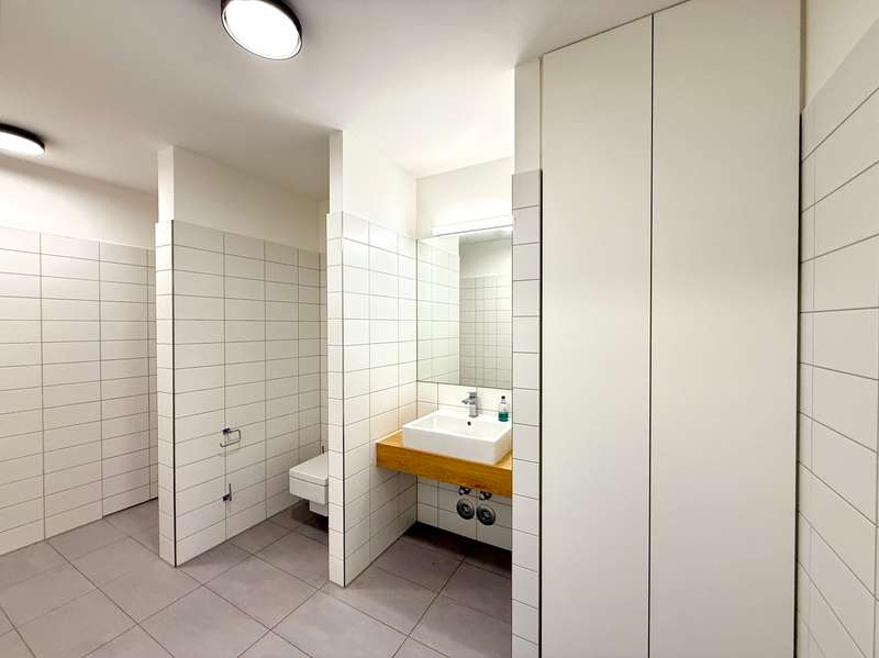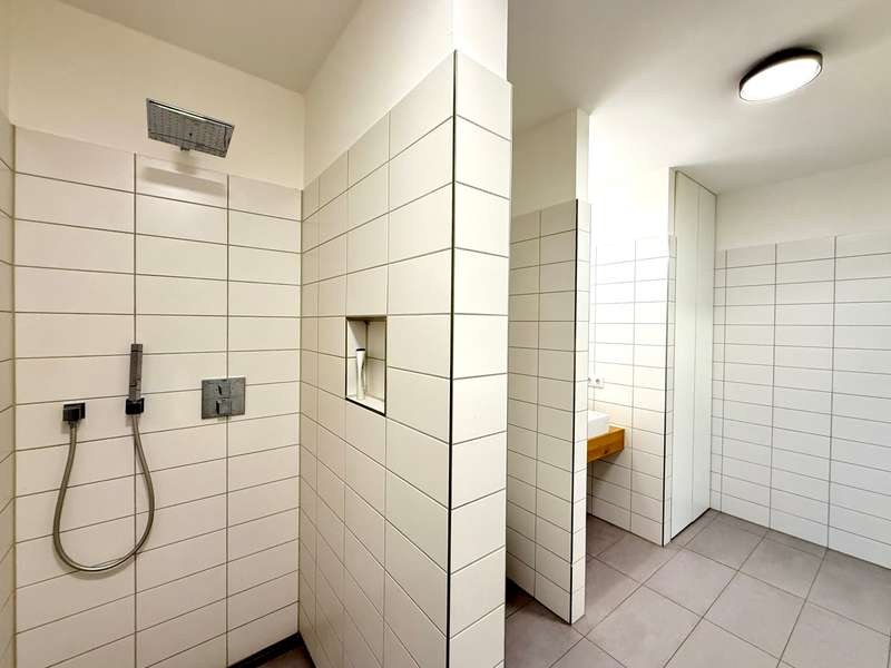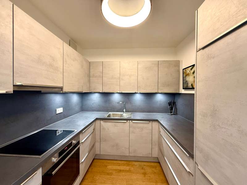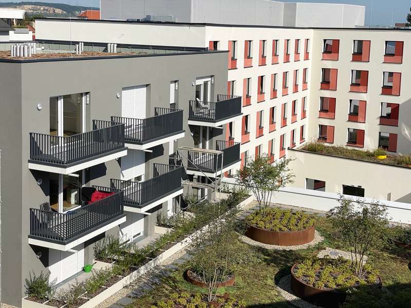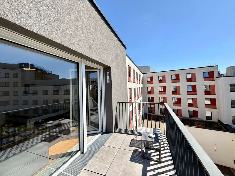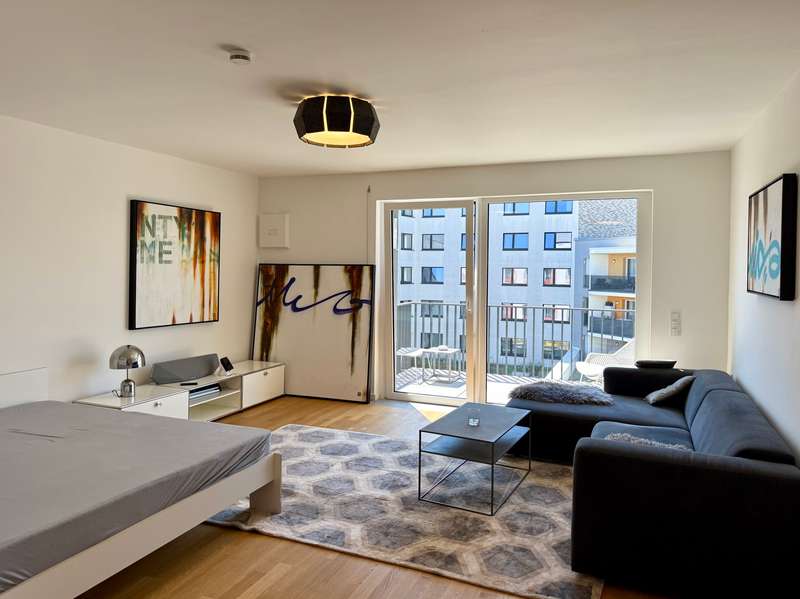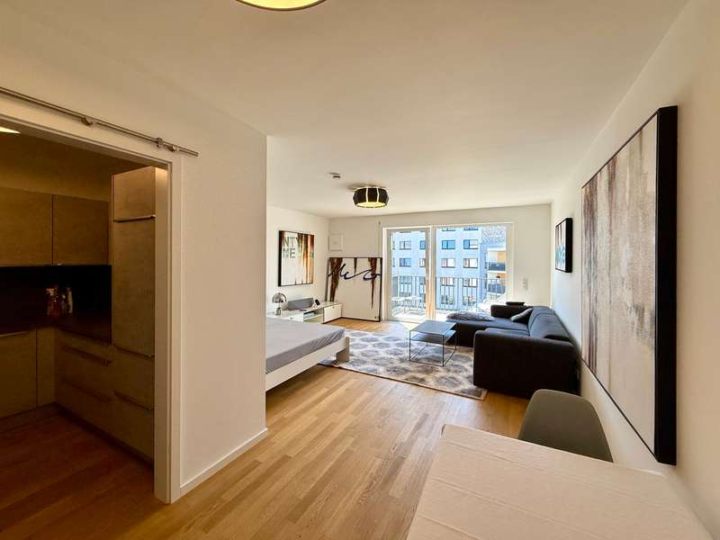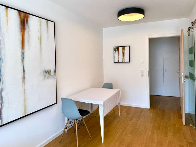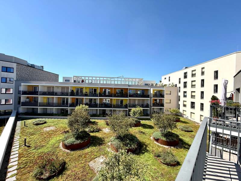You can feel the special atmosphere as soon as you enter the apartment: the light-flooded room concept, combined with high-quality materials, creates a home to arrive in and feel at home in. The modern staircase with elevator provides barrier-free access to the apartment. A spacious hallway connects all the rooms in a harmonious way. The centerpiece is the open-plan living and dining area, which is fitted with high-quality real wood parquet flooring. This is where design meets function: the exclusive fitted kitchen in concrete decor blends in seamlessly and offers everything that makes the heart of ambitious chefs beat faster - including an induction hob, fridge and dishwasher. Large, floor-to-ceiling windows create a bright, friendly ambience and open up a view of the quiet garden area inside the complex. The directly adjoining, sunny, south-facing balcony invites you to spend relaxing hours outdoors. The spacious bathroom impresses with its modern design, a comfortable shower area and a practical washing machine connection. High-quality fittings and stylish tiles underline the exclusive standard of the apartment. Equipment highlights at a glance: Like first occupancy with warranty guarantee - everything is new and of high quality Sunny south-facing balcony with a view of the spacious, green garden area Modern designer fitted kitchen with induction hob, fridge & dishwasher High-quality furnishings with stylish built-in wardrobes Underfloor heating throughout the apartment Real wood parquet flooring for a natural living feeling Decentralized ventilation system with heat recovery Large bathroom with bathtub and washing machine connection Designer staircases with stylish architecture (concrete matrices) Large single parking space (no duplex) in the underground garage (26,000 euros) Large communal roof terrace with awning and playground for shared use Energy efficiency class A thanks to sustainable energy concept