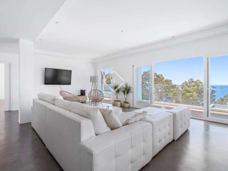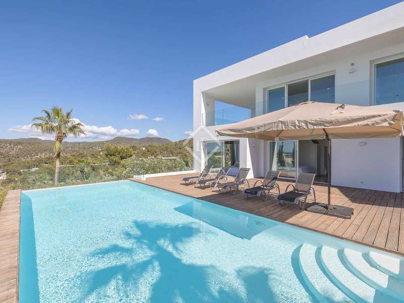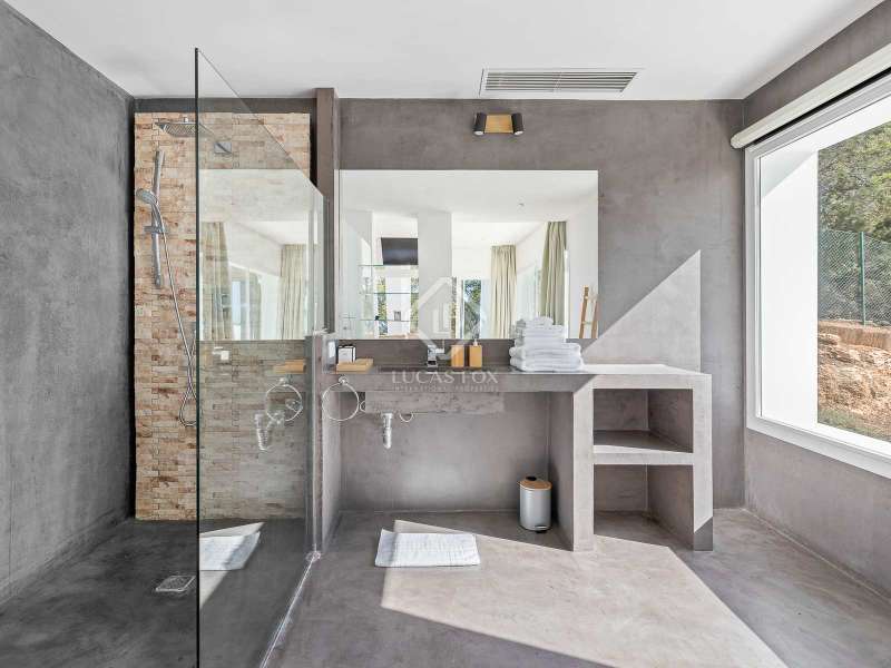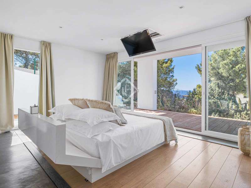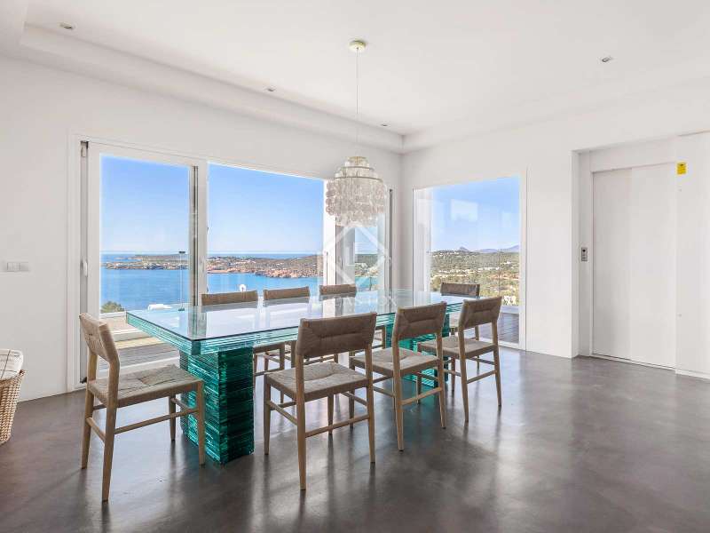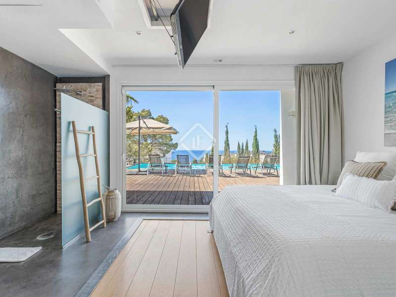 Discover these breathtaking minimalist villas nestled in an extraordinary hilltop location, where uncompromising luxury harmoniously merges with awe-inspiring views of the sea and mountains. As you enter through the automatic gates, a shared entrance welcomes you, gradually unveiling the panoramic vistas as you ascend the winding drive. These villas have been thoughtfully designed to embrace the Mediterranean lifestyle and offer an idyllic backdrop for experiencing the charms of the White Isle. Villa A spans an impressive 650 m², while Villa B encompasses 450 m². Both villas boast two generously proportioned floors, featuring four remarkable bedroom suites and exquisitely designed living areas that exude a cool and open ambiance. Floor-to-ceiling windows frame the captivating views, while the seamlessly integrated terraces effortlessly blend indoor and outdoor spaces. Expansive wooden decks and inviting pools create the perfect ambiance for relaxation and entertainment. Equipped with jacuzzis, they provide a serene spot for sipping cocktails as the sun sets on the horizon. Adding to its allure, Villa A features a remarkable roof terrace, complete with a Jacuzzi, loungers, parasols, a bar, a kitchen, and astonishing vistas that encompass the picturesque beach of Cala Tarida. Surrounded by enchanting gardens adorned with vibrant flowers and graceful palm trees, these villas offer a haven of tranquility. Both properties are equipped with modern conveniences, including a lift, air conditioning, Wi-Fi, an alarm system, video intercom, and a two-car garage with additional parking space for two more vehicles. Indulge in the epitome of luxury living with these remarkable villas, where every detail has been meticulously crafted to provide an extraordinary experience. Contact us today for further information and to arrange a viewing of these exceptional properties.