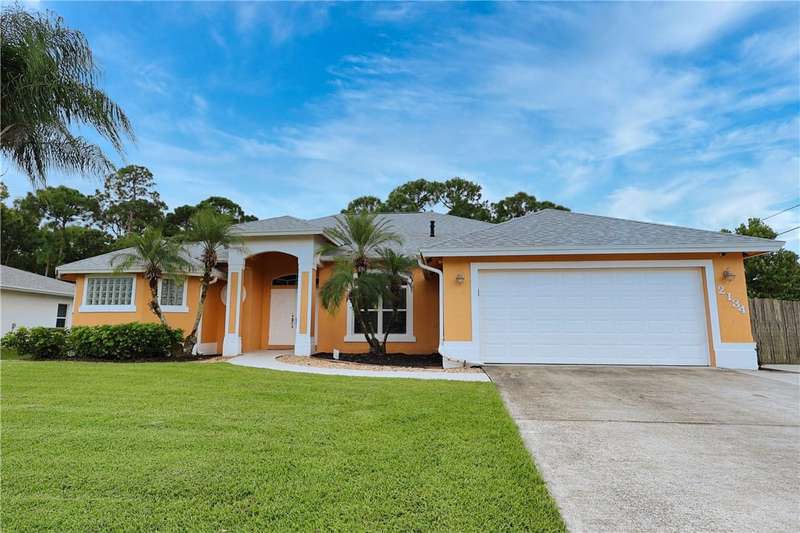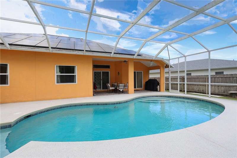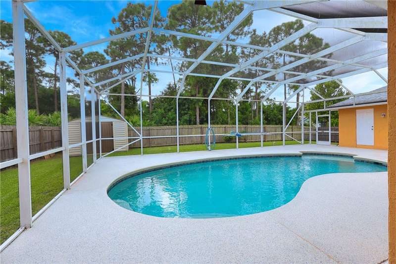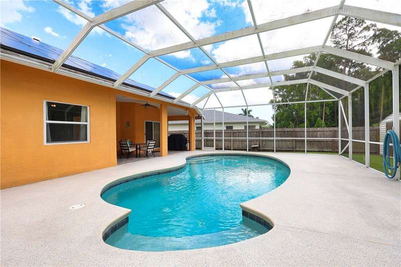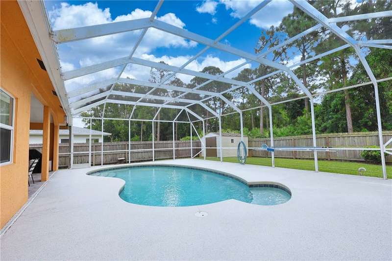 Pool home on a corner lot with 2,246 sq ft, 4 beds, 3 baths, and a fully fenced yard. 2-car garage & 1010 shed. 2022 roof, solar, impact windows/doors and whole-home generator, are just a few features this immaculate home offers. Split floor plan with spacious rooms and dual primary suites. Open kitchen with propane stove & stainless appliances, perfect for gatherings. The home also has a Tankless water heater and irrigation. Sliders lead to screened patio & sparkling pool providing privacy and enjoyment. No HOA, near I-95, shopping & dining! RMSZAPPR/SUB2ERR.