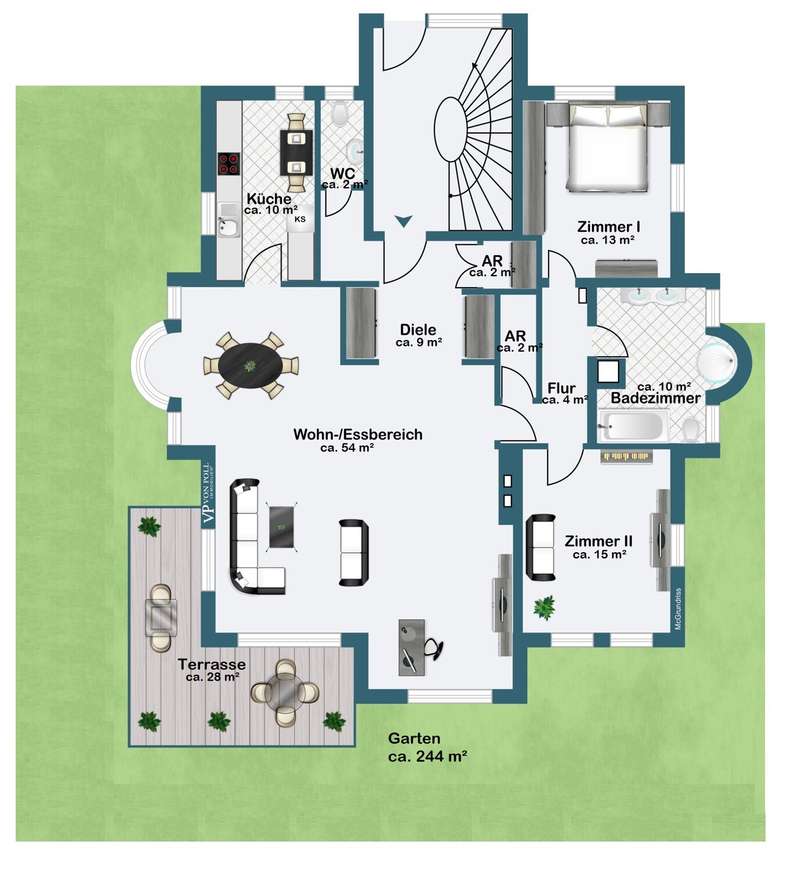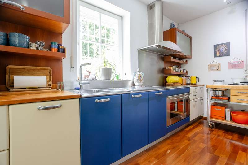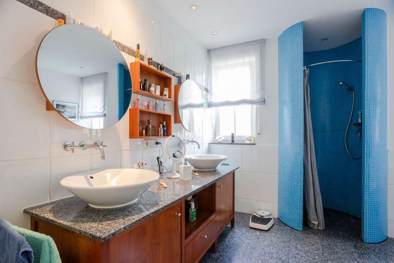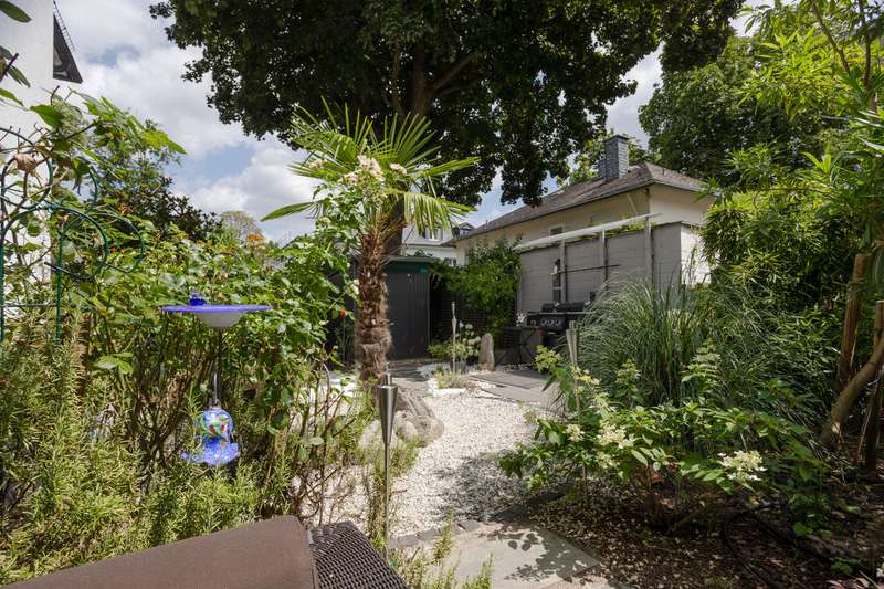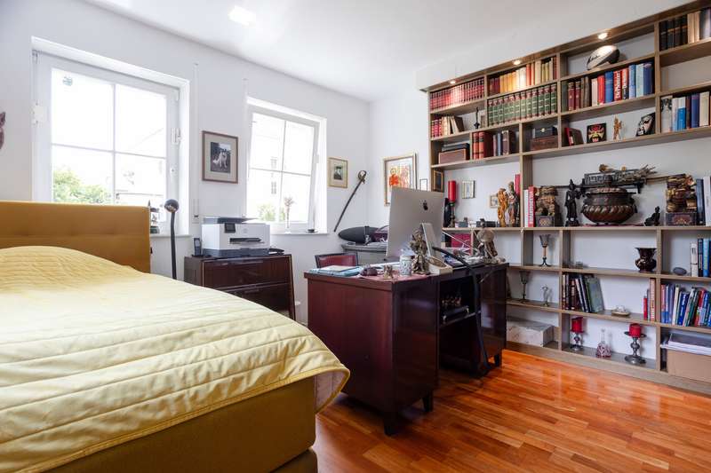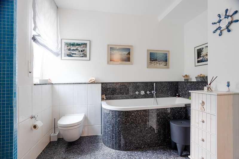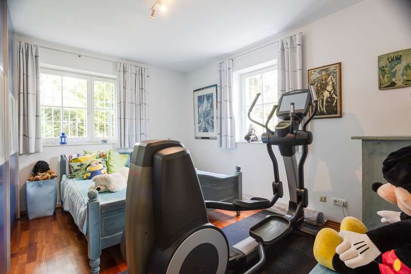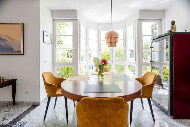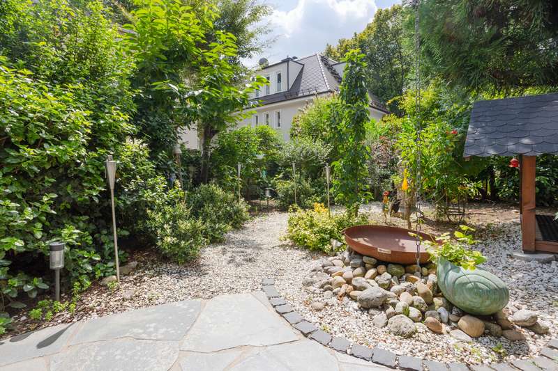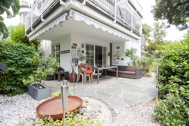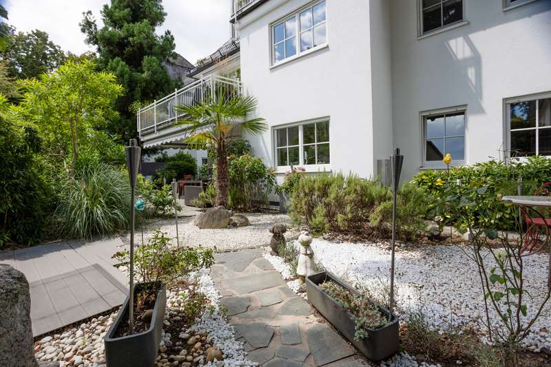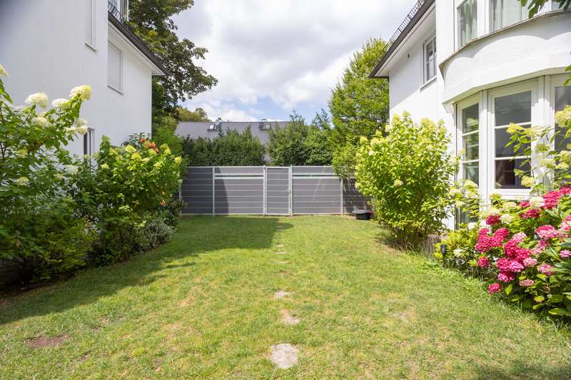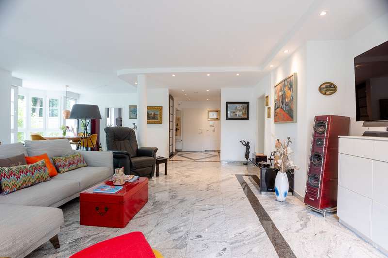 This exclusive three-bedroom garden apartment is located in a luxurious villa built in 1998 and offers a high-quality and spacious living ambience on approximately 138 m² of living space. The open-plan living/dining area is fitted with elegant marble flooring and impresses with floor-to-ceiling windows that create a bright, friendly atmosphere. From here, you have direct access to the terrace and the spacious, well-kept garden of around 300 m² - an ideal place to relax or socialize outdoors. The apartment has a comfortable bedroom and a further room that can be used flexibly as a children's room or office. The stylish daylight bathroom is equipped with a double washbasin, a bathtub and a separate shower; there is also a guest WC. A fitted kitchen is available and blends harmoniously into the elegant living concept. Two practical storage rooms within the apartment offer additional storage space. The apartment also has two underground parking spaces. The entire property is located in a quiet, upmarket residential area and combines privacy with stylish living at a high level. Two cellar rooms round off this offer. This garden apartment is the perfect choice for anyone looking for an exclusive home with generous space and high-quality fixtures and fittings in a quiet location.