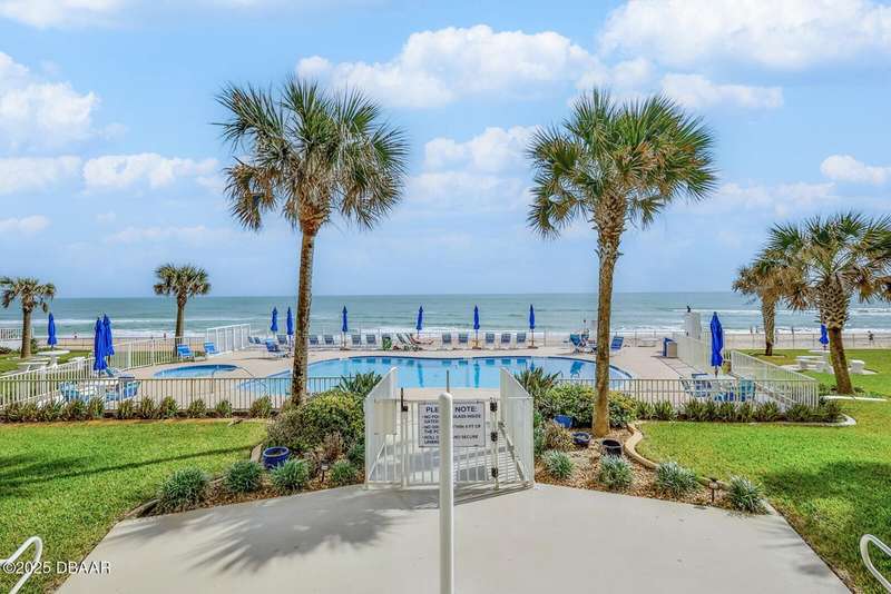Turn-Key direct ocean front beauty on no-drive beach. This unit has had a complete renovation and concrete restoration was completed on the building in '24. No assessments! Amazing ocean views from the stunning opened kitchen with granite counters, 42'' cabinets with soft-close drawers, recessed lighting, stainless fridge & range, Bosch dishwasher, and under-cabinet LED lighting. Luxury vinyl plank flooring (except carpet in 2nd bedroom), impact glass, light dimmers, marble window sills, and on-sight management. This unit comes beautifully furnished down to linens and dishes for your convenience. Balconies & railings recently redone as well. Building offers a community pool and club room. Located close to shopping and restaurants. All information recorded in the MLS is intended to be accurate, but cannot be guaranteed.
