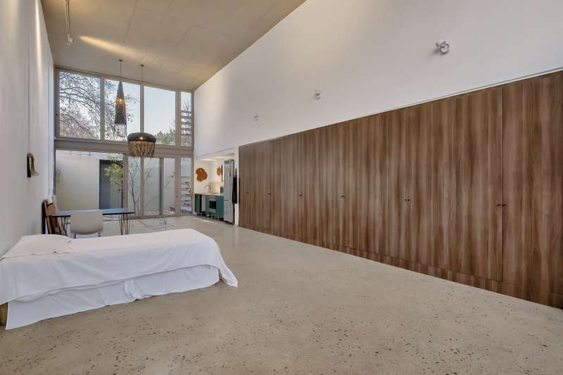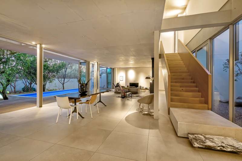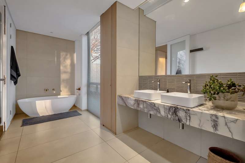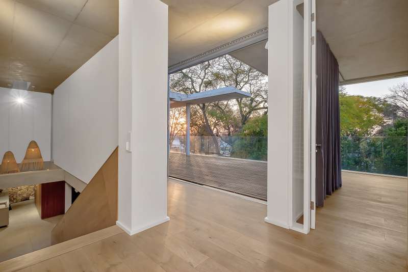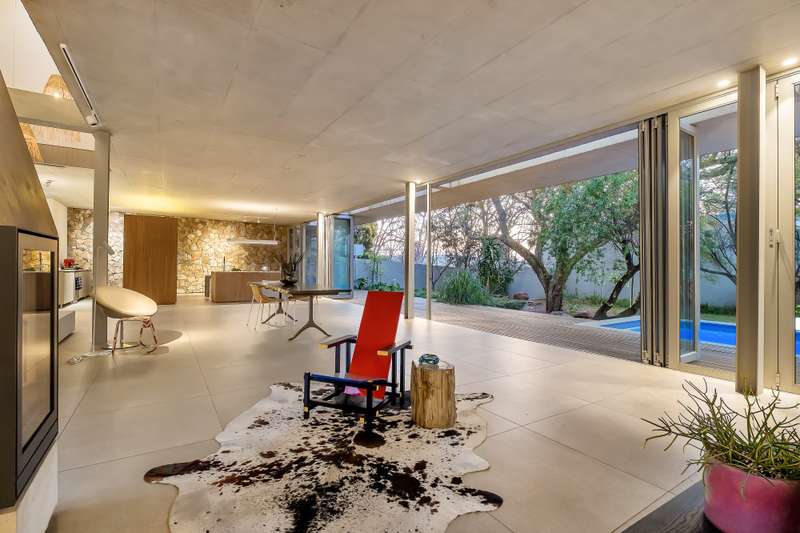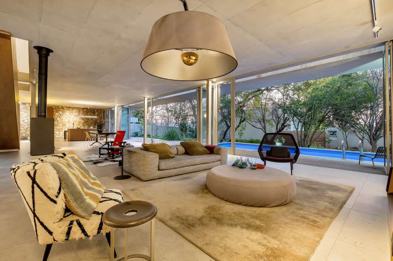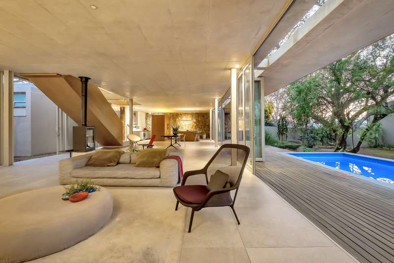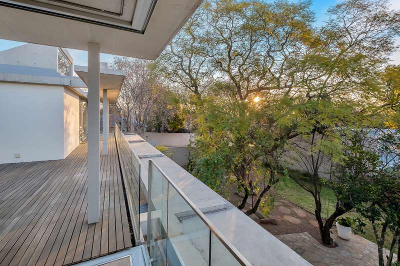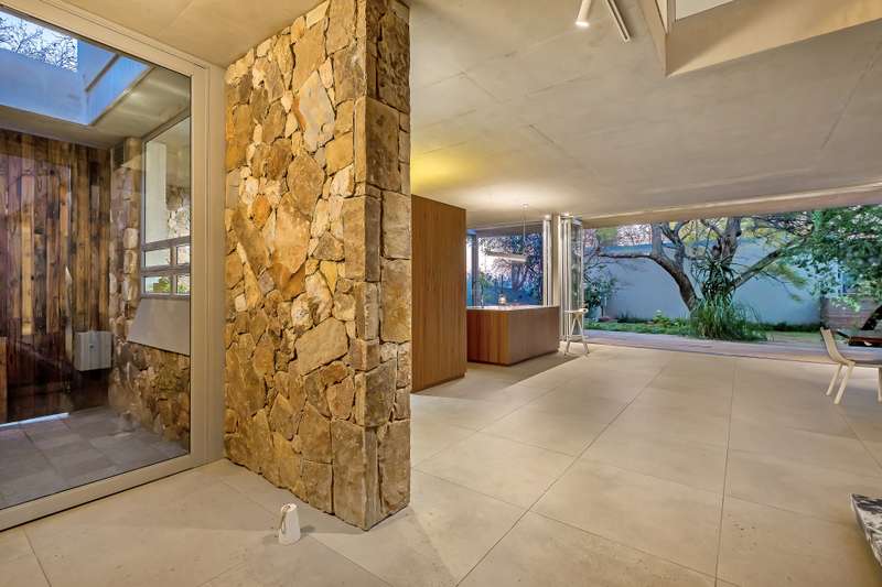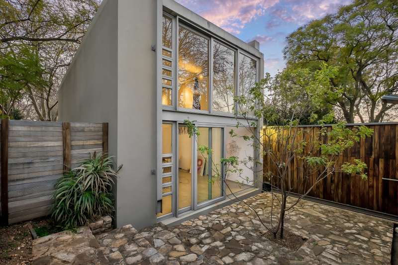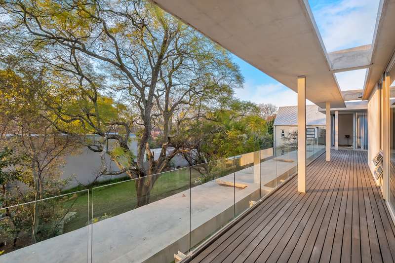 This architectural masterpiece out of the pages of a glossy magazine, combines cutting-edge glamour with a minimalist aesthetic, brimming with sunshine and energy. An inspired blend of floor to ceiling fenestration, bespoke cabinetry, and detailed finishes throughout, are a happy mix. Courtyards, expansive tree-top views, ideal north facing aspects and seamless integration between the indoors and outdoors, set the tone of this urban retreat measuring 513sqm, with welcoming entrance and free-flowing spaces from the kitchen, a family centre that lets the soul of the house shine through, dining and living areas, opening to the elevated pool and terraced treed garden – a total entertainer’s lifestyle. Generous stacking doors open this home to light, air, and structured garden views. There is a private guest wing comprising of spacious bedroom, bespoke bathroom, and private courtyard access. Currently this section is being utilised as a study. Guest cloakroom. The feature-cladded staircase takes you to the accommodation on the upper level of the home, with tree-top views over the suburb. There are 4 bedrooms and 3 bathrooms finished to exacting standards (2 en suite). Both the master suite and second bedroom suite are superbly integrated with the outdoors and the expansive treed garden below. The master suite offers a sun filled dressing room with clerestory windows and beautifully detailed full bathroom. A stand-alone, light filled, double volume, open plan studio/cottage of 126sqm, with private entrance and double garage, enclosed courtyards, open plan kitchen, living and bedroom spaces and gorgeous bathroom offers multiple options – ideal for extended family living, additional income generating cottage, Air BnB, or home office environment. The double volume spaces allow for a mezzanine level to be created for additional living or accommodation. In addition, excellent staff suite with direct access to the main house, additional double automated garage, and storeroom/laundry. Features include piped gas connection for geysers & hobs, SMEG appliances & sinks, swivel wood burning fireplace in the living area and alarm system in the cottage. Do not miss out on this opportunity in the stylish suburb of Parkview, where access to local coffee shops, eateries, the retail strip on Tyrone Avenue, and both private and public schools, is just a stone’s throw away. Distinctive architecture plus a prestige neighbourhood. One look will do!