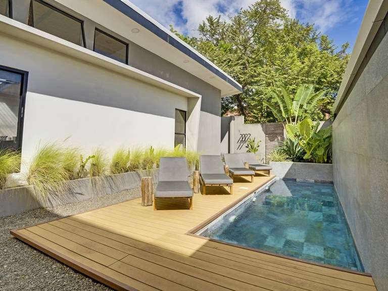 One of the defining features of Villa Resplandor is its private outdoor sanctuary. Each home includes a sparkling swimming pool set within a tropical landscape, perfect for unwinding under the Costa Rican sun, hosting poolside gatherings with friends, or enjoying quiet evenings in the fresh ocean breeze. This intimate outdoor living space enhances the natural connection between the home and its surroundings, making it a true haven of relaxation.