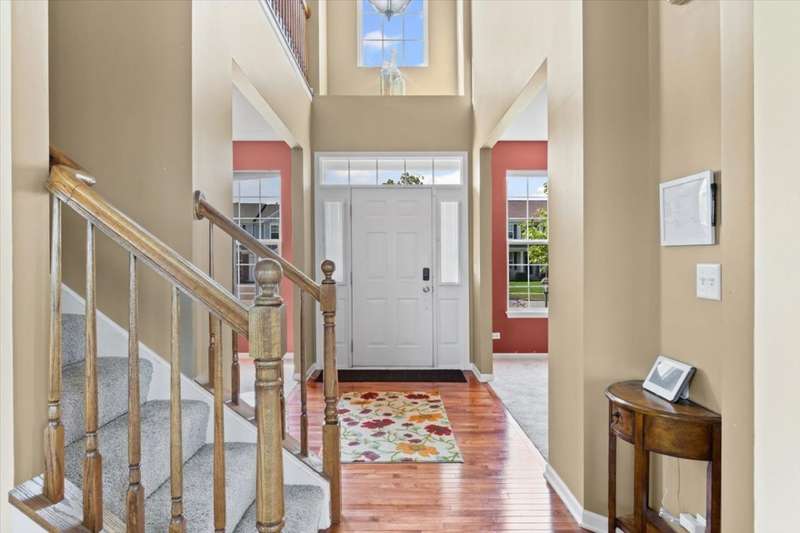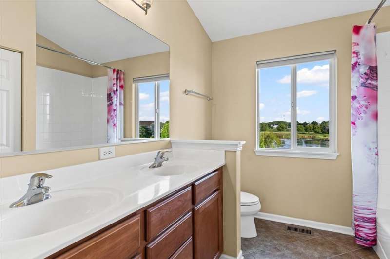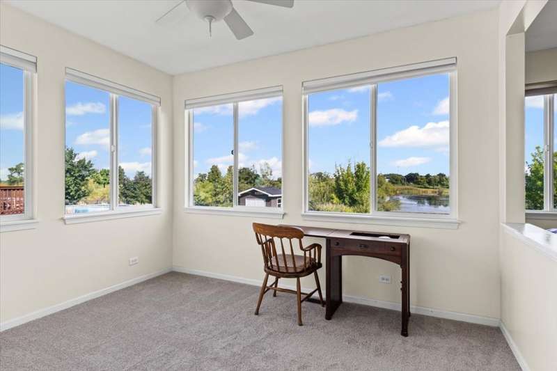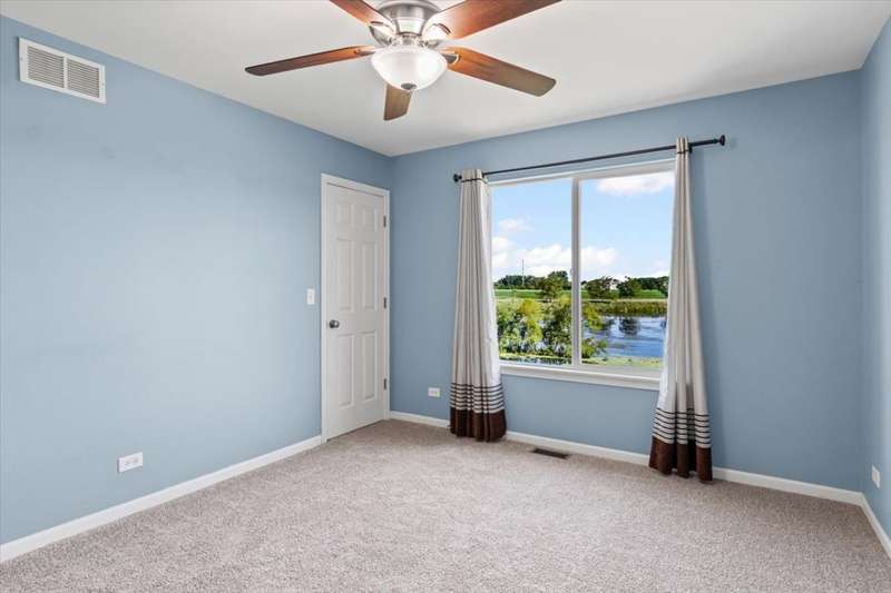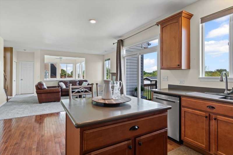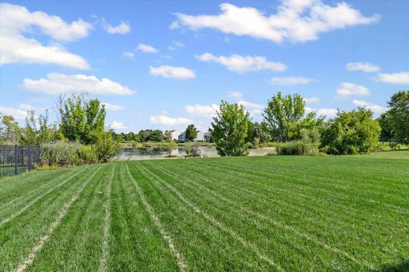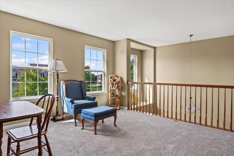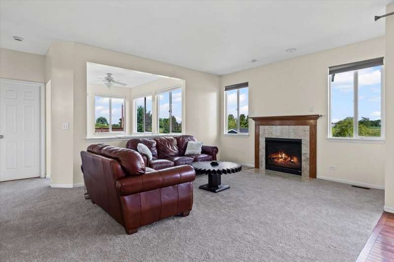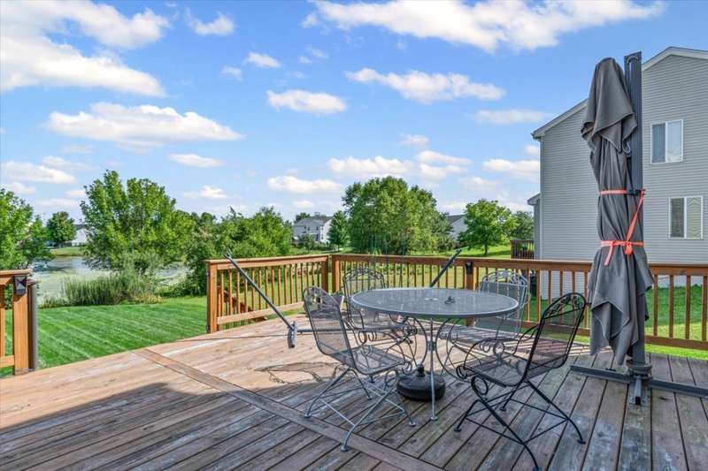 4 bedroom, 2.5 bathroom home in Whispering Meadows with breathtaking natural surroundings and serene lake views. This home offers the rare combination of everyday comfort and a backyard that feels like a private nature preserve. Overlooking a stocked 7-acre lake, you can enjoy fishing, skating, or ice fishing in the winter without the upkeep, since the HOA manages the lake. The shallow shoreline, small nesting islands, and annual conservation efforts create a haven for wildlife. Watch eagles, osprey, herons, and ducks soar overhead, or spot migratory birds that pause here each spring and fall. Perennial gardens add seasonal color, while the south-facing driveway helps snow melt away quickly in winter. Inside, a welcoming two-story foyer opens to flexible living and dining spaces. The bright island kitchen features 42 cabinets and stainless steel appliances (newer stove and dishwasher) and flows into the family room with fireplace. A sunroom with expansive windows overlooks the lake and is the perfect spot to enjoy bird watching or peaceful views. Upstairs, the primary suite offers vaulted ceiling, walk-in closet, and private bath. The finished lookout basement also captures the water and wildlife views, with space for recreation, office, or fitness. First-floor laundry adds convenience. Roof and siding were replaced in 2019, and new carpet has just been installed. Relax on the deck with panoramic water and tree views, or enjoy community amenities including clubhouse, pool, fitness room, playgrounds, and walking paths. A perfect setting for anyone who loves nature.