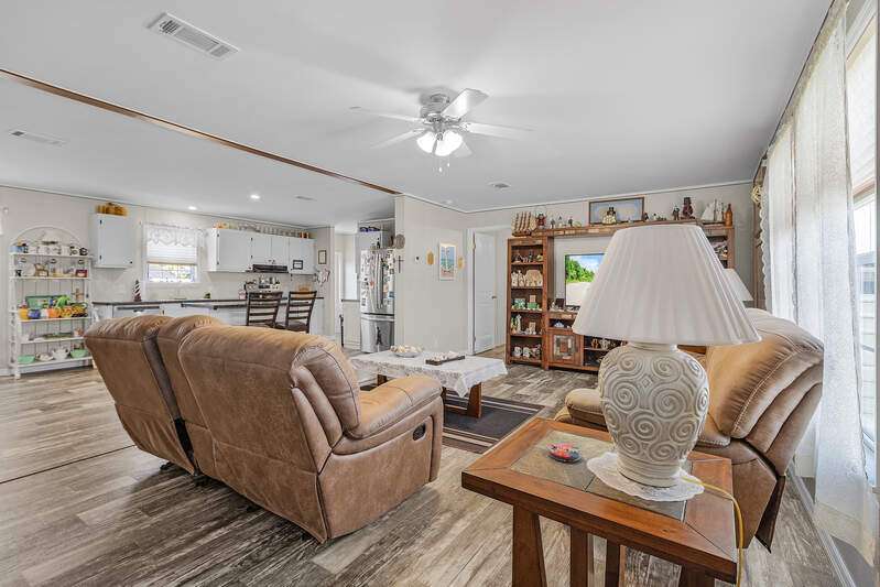 Spacious 2023 mobile on a corner lot in Pine Island Cove. Oversized one car garage. Lots of parking, everything new, generator hook up, split floor plan, and inside laundry with extra storage. The great room makes this the perfect home for entertaining. Drive around in your golf cart and enjoy the clubhouse, pool, bocce ball, and pickleball courts. Or just visit with the neighbors. Community boat ramp for your use. Plus boat storage is available for $50 a year. This home has it all. Make your appointment to see it today.