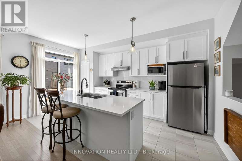 Welcome to this beautifully maintained 2-storey townhouse in the sought-after community of Half Moon Bay, Barrhaven. Featuring 3 spacious bedrooms, 2 full bathrooms, and 2 powder rooms, this home blends modern comfort with timeless style.Step inside to an open-concept main floor with hardwood flooring, neutral designer tones, and an abundance of natural light. The spacious white kitchen with large island boasts quartz countertops, plenty of cabinet space, and a seamless flow into the dining and living areas perfect for entertaining or everyday living.Upstairs, you'll find three well-sized bedrooms, including a serene primary suite with an ensuite bath and generous closet space. The finished basement offers a versatile recreation area complete with a cozy gas fireplace, ideal for movie nights or a home office. Additional highlights include an extra-deep garage for ample storage, a modern layout, and a clean, classic design throughout.Located in a family-friendly neighbourhood, you'll enjoy proximity to top-rated schools, parks, trails, shopping, and transit. 24 hour irrevocable on all offers (id:6509)