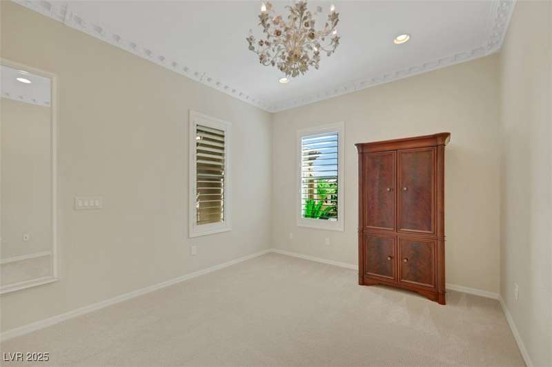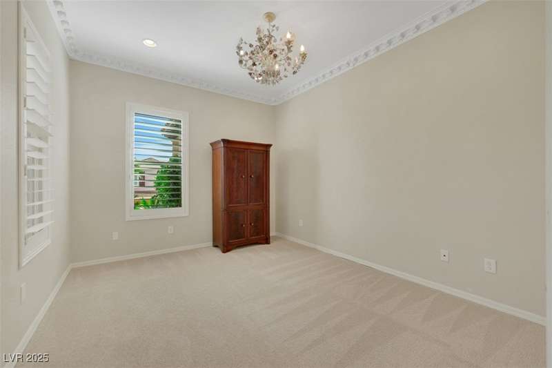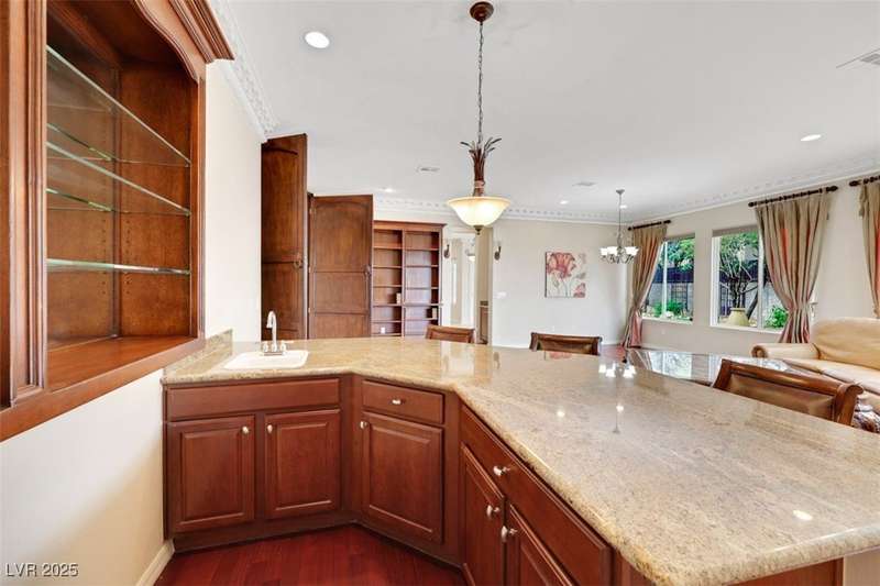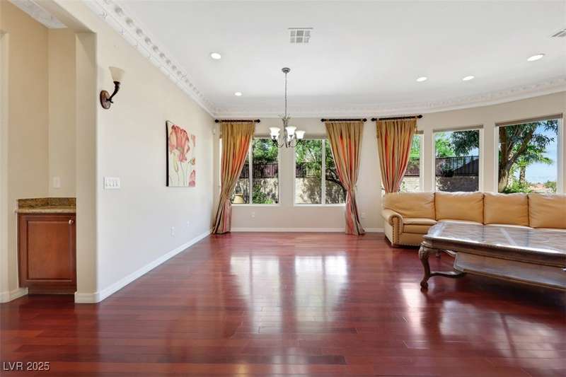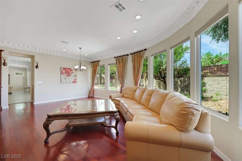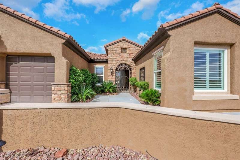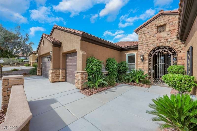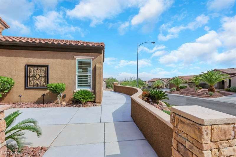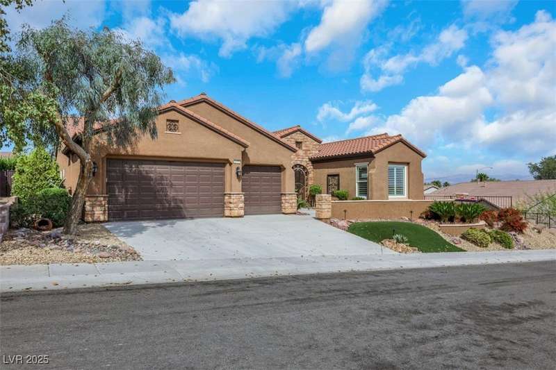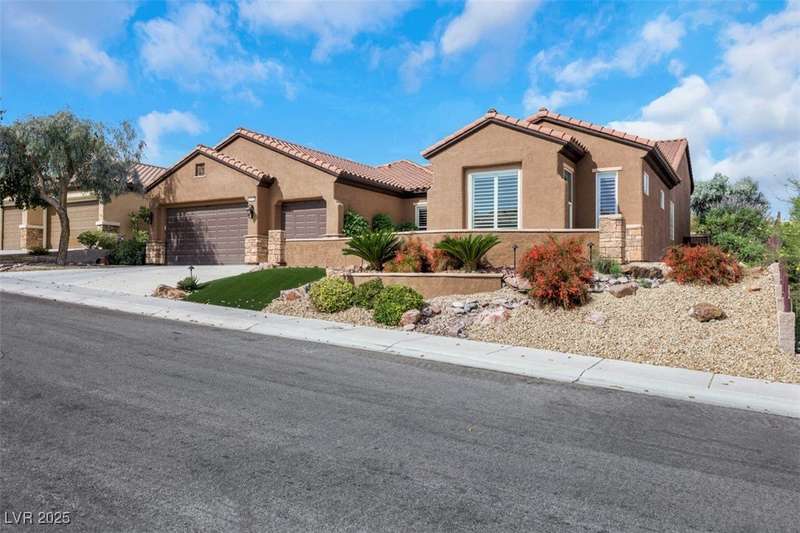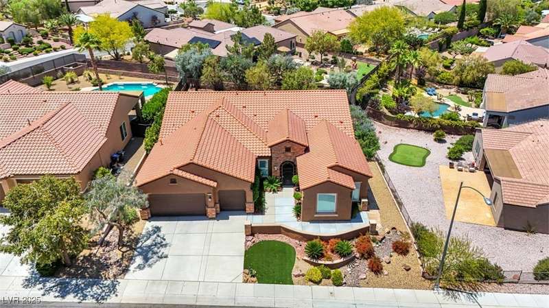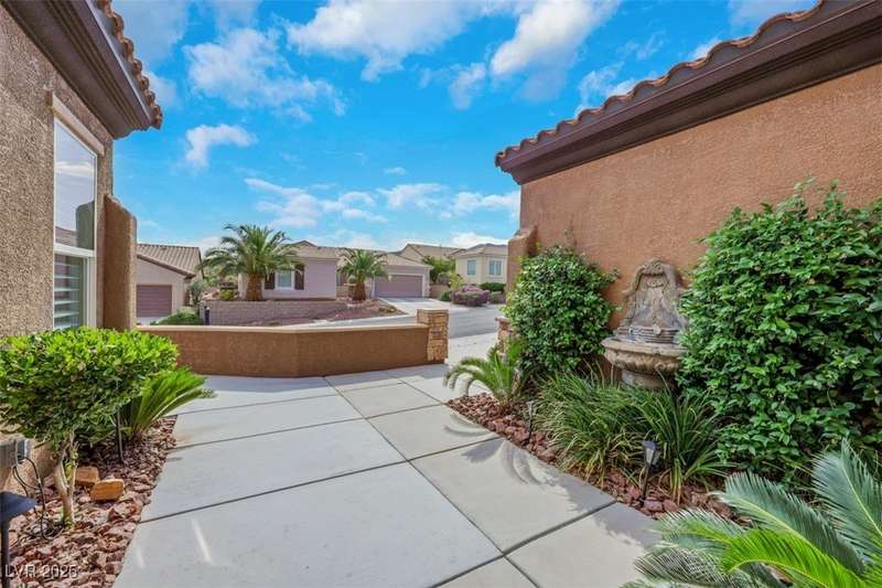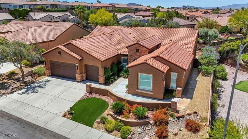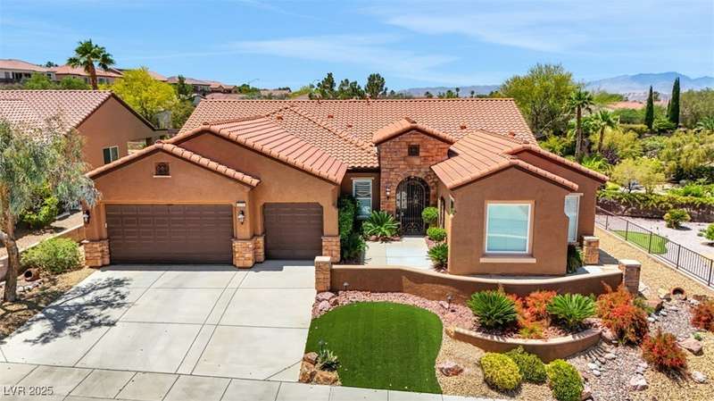 Stunning 2 Bd + Den, 2.5 Ba (3172 sq ft) Charleston model on a quiet interior street in the heart of Sun City Anthem (55+) just blocks away from both Community Centers. Perched on a 9000+ sq ft lot, this home has been beautifully maintained inside & out. Curb appeals starts w/turf & desert landscapes, new exterior paint, front courtyard w/Strip views, water feature, custom glass entry doors & iron security gate. Interior features lots of relaxation, entertainment & dining options w/many designer touches. 10 ft ceilings, custom wooden doors, new paint, built-in bookcases, lighted crown moulding, high-end window coverings, rock & tile backsplash kitchen features, upgraded light/plumbing/fan fixtures, custom closets, SS appliances, custom mirrors. 2nd bedroom has in-suite full bath. Large interior laundry room leads to large 3-car garage. Rear yard is peaceful, private & well shaded w/large patio areas & mature landscaping. Home is completely move-in ready & has low taxes & low HOA fees.