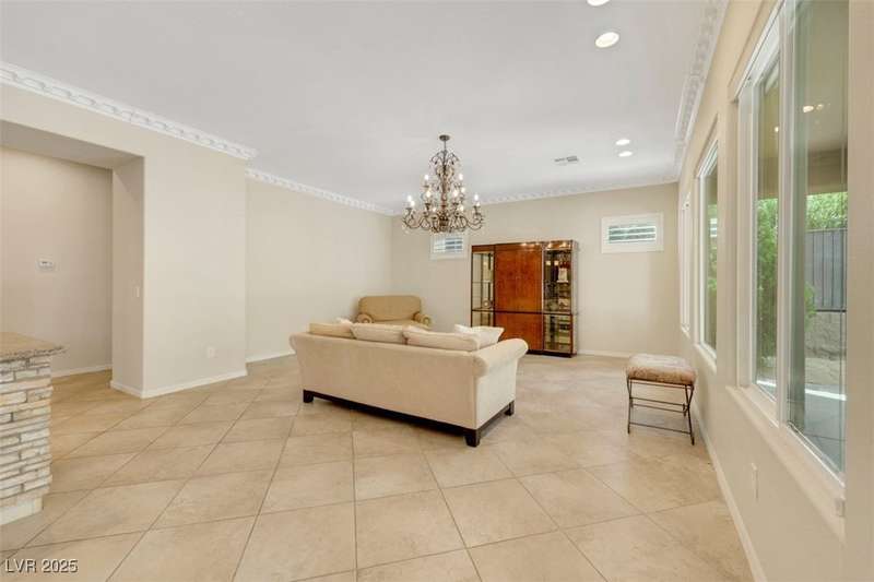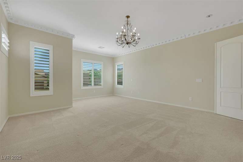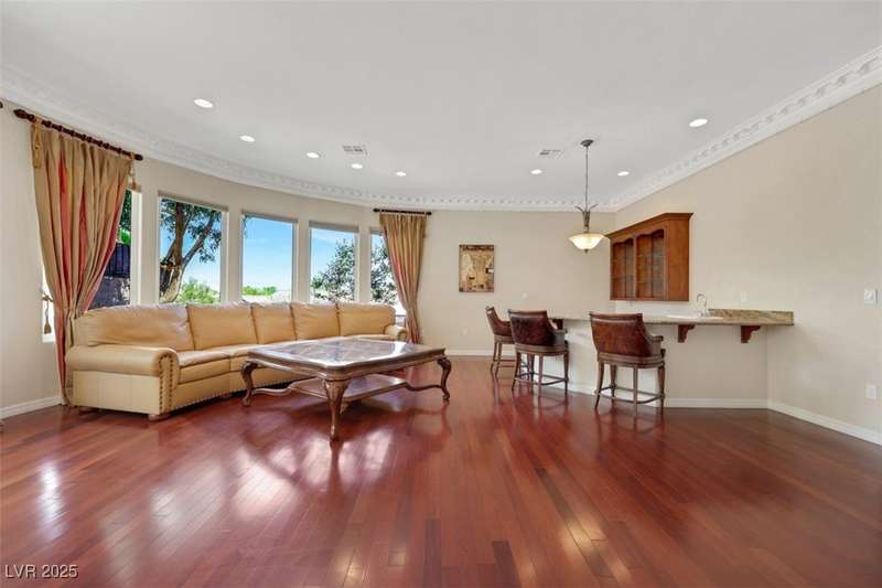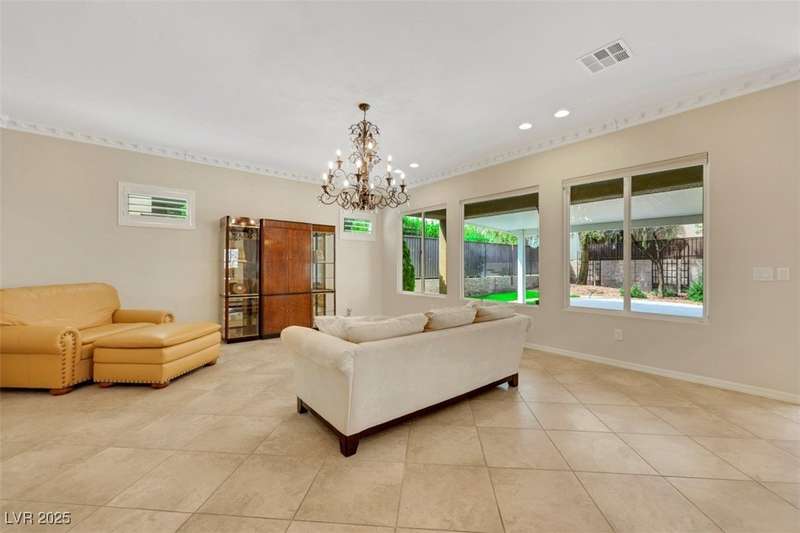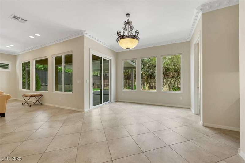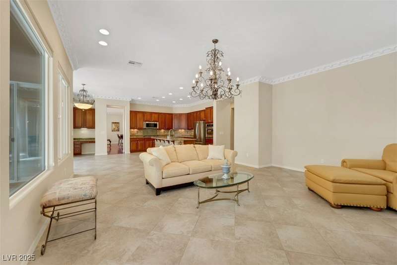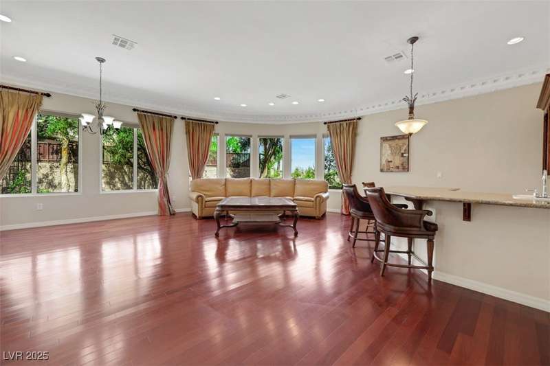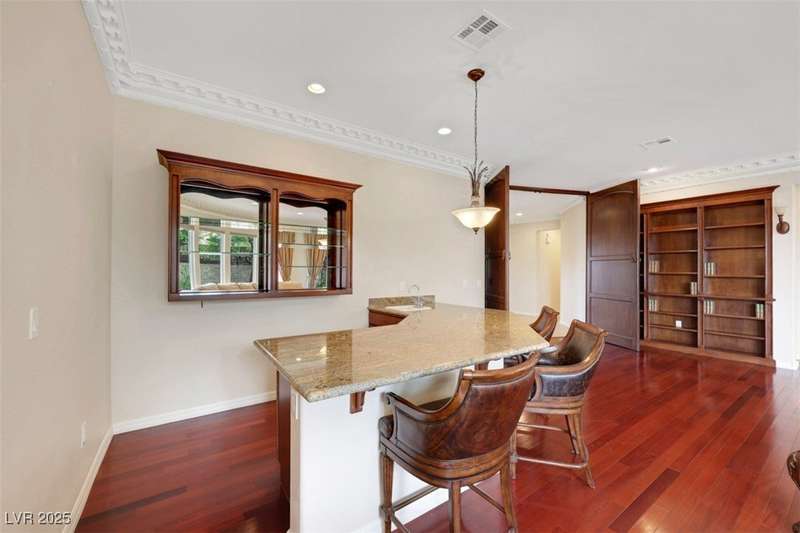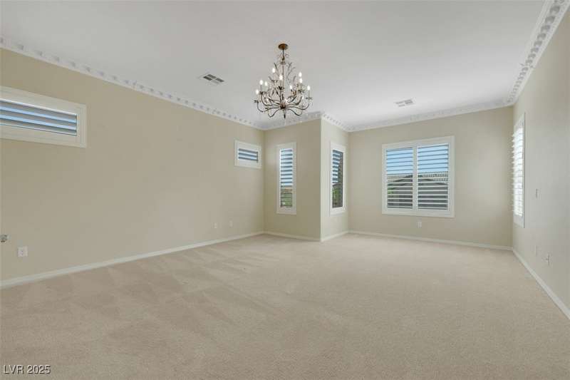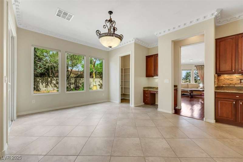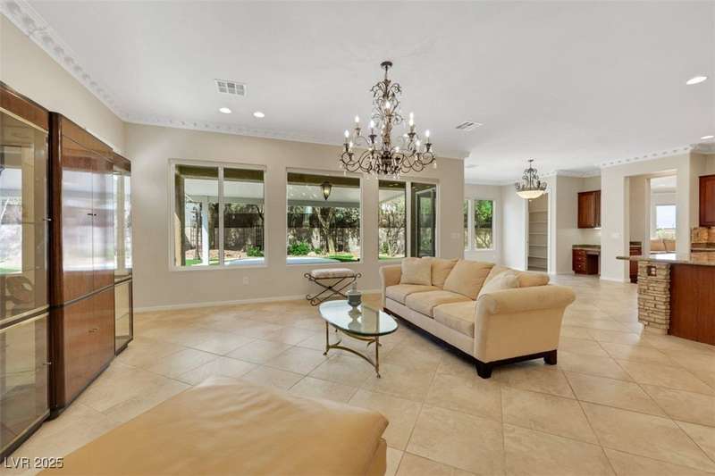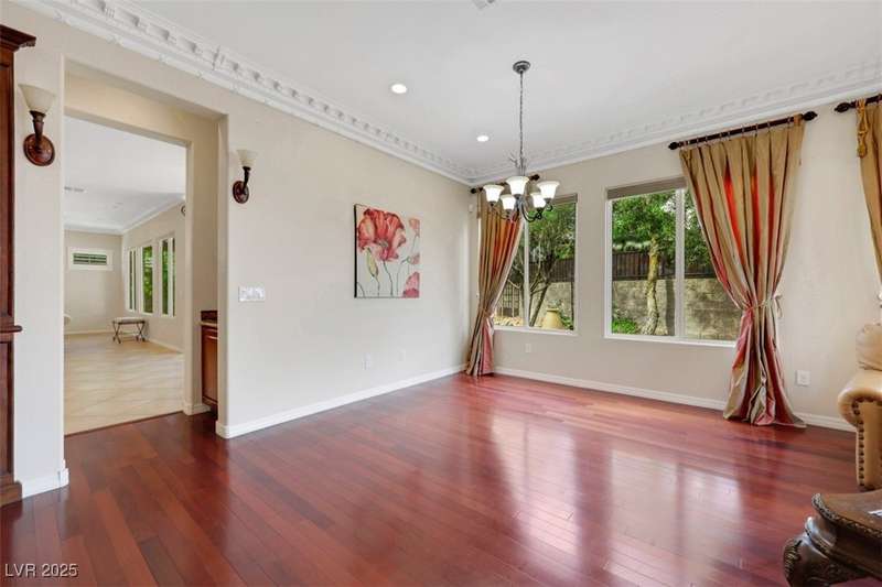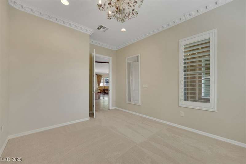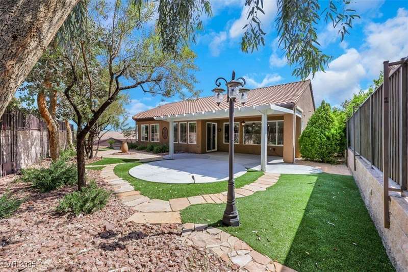 Stunning 2 Bd + Den, 2.5 Ba (3172 sq ft) Charleston model on a quiet interior street in the heart of Sun City Anthem (55+) just blocks away from both Community Centers. Perched on a 9000+ sq ft lot, this home has been beautifully maintained inside & out. Curb appeals starts w/turf & desert landscapes, new exterior paint, front courtyard w/Strip views, water feature, custom glass entry doors & iron security gate. Interior features lots of relaxation, entertainment & dining options w/many designer touches. 10 ft ceilings, custom wooden doors, new paint, built-in bookcases, lighted crown moulding, high-end window coverings, rock & tile backsplash kitchen features, upgraded light/plumbing/fan fixtures, custom closets, SS appliances, custom mirrors. 2nd bedroom has in-suite full bath. Large interior laundry room leads to large 3-car garage. Rear yard is peaceful, private & well shaded w/large patio areas & mature landscaping. Home is completely move-in ready & has low taxes & low HOA fees.