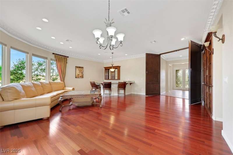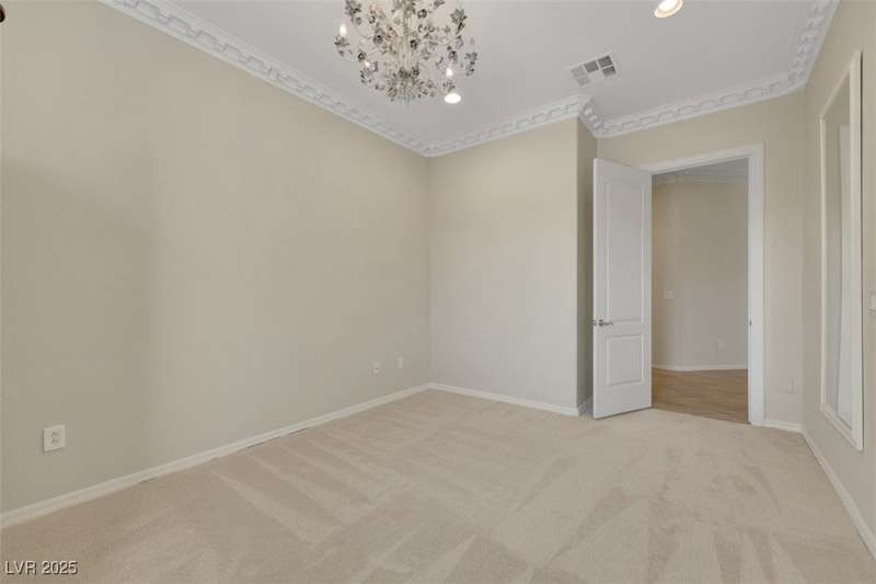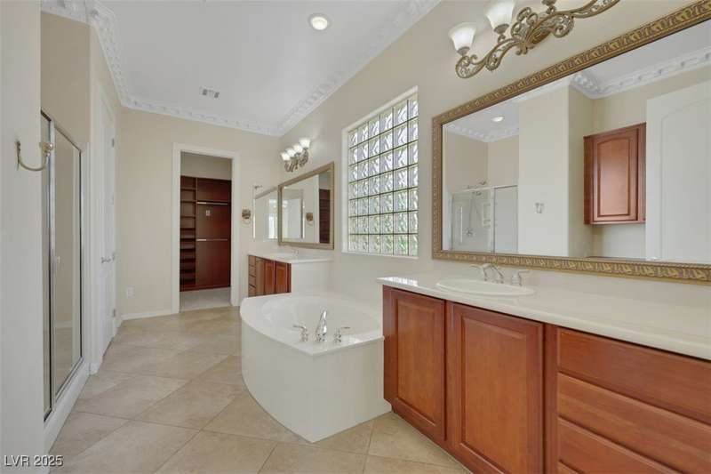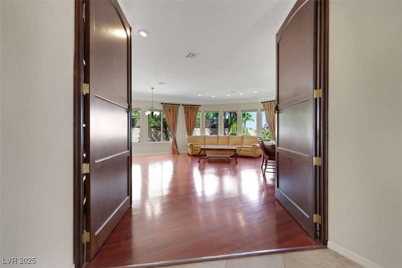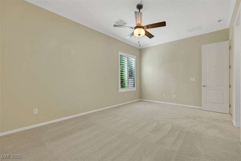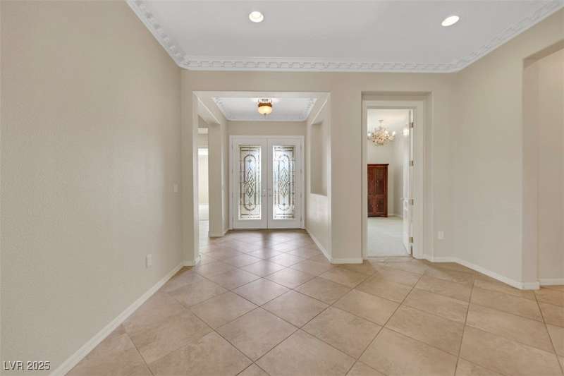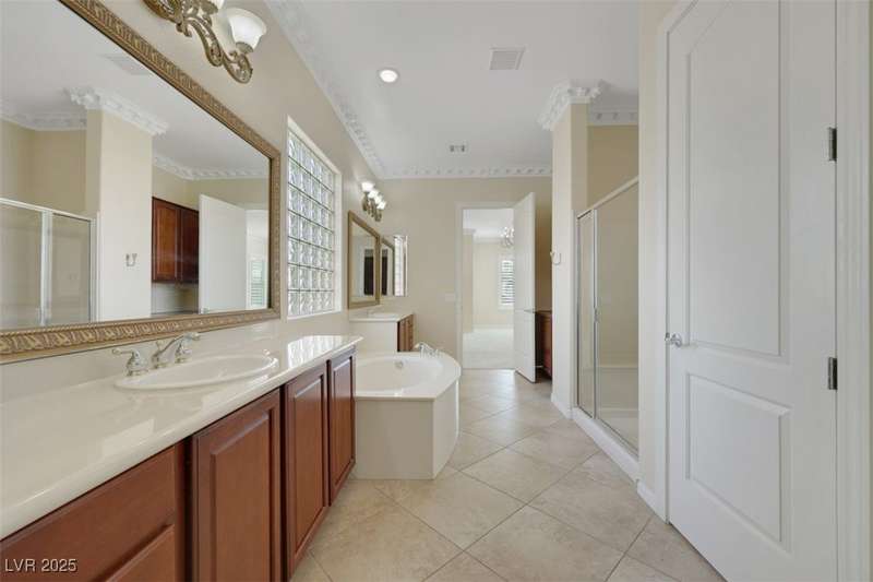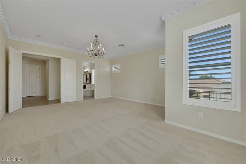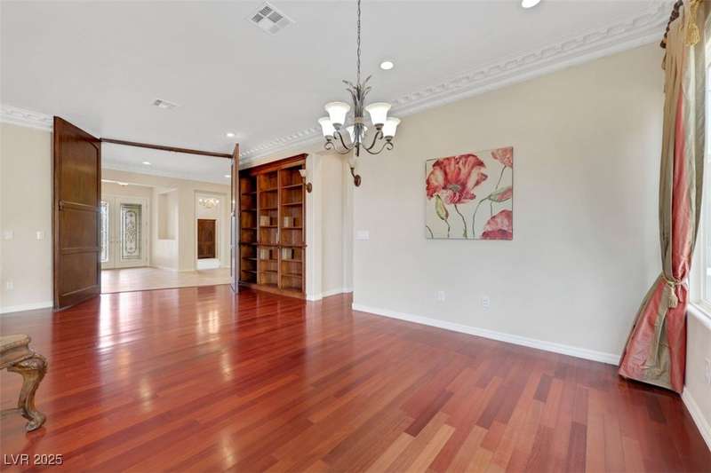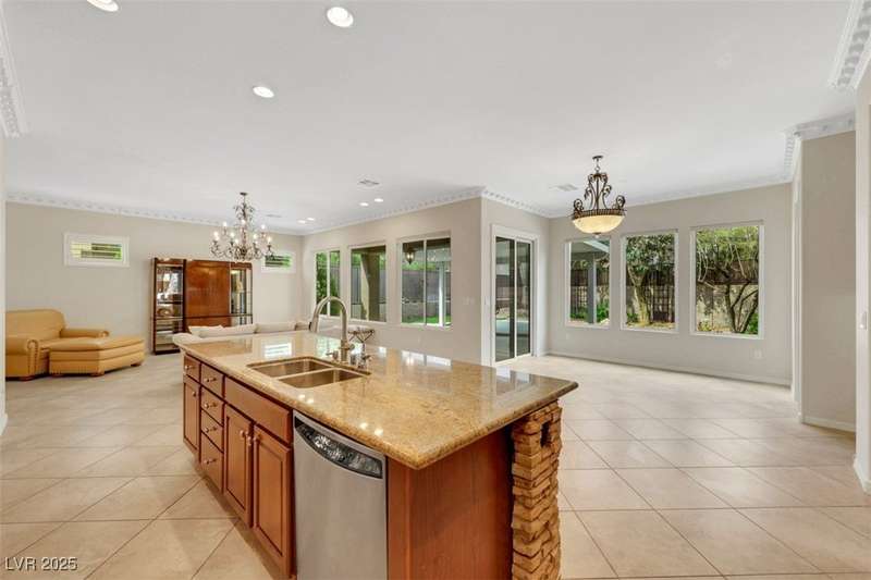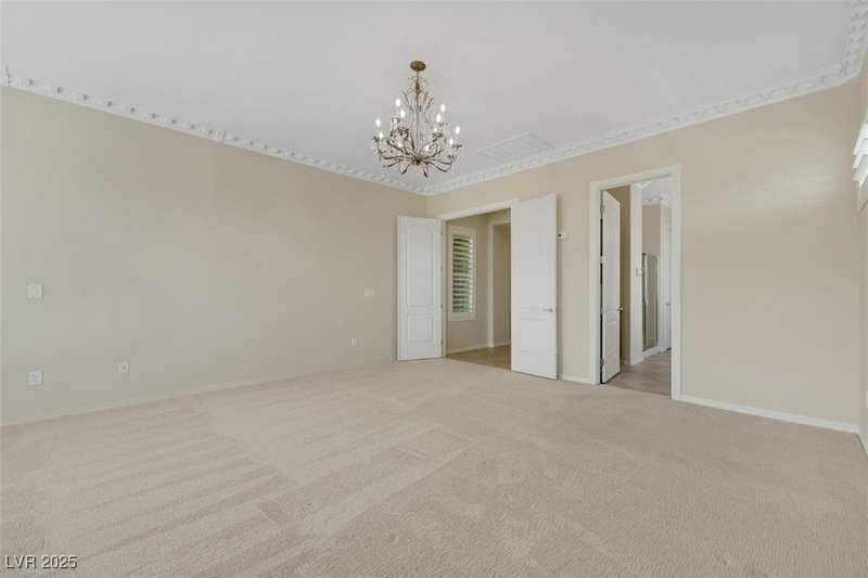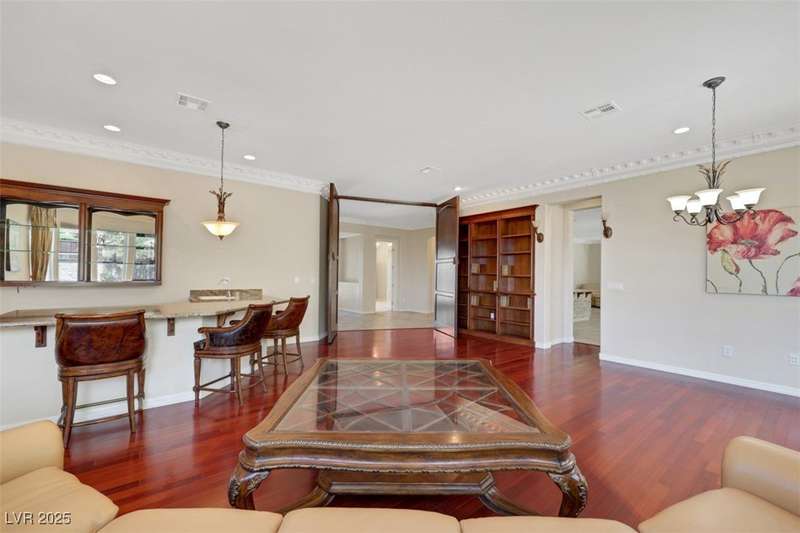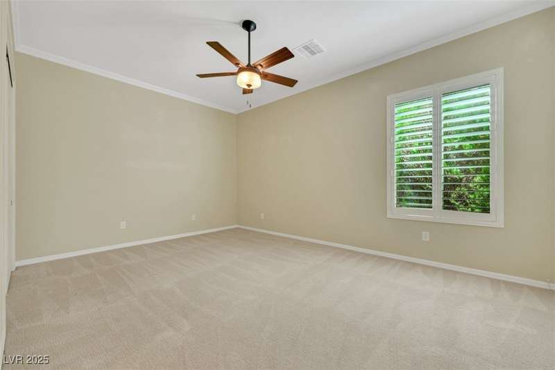 Stunning 2 Bd + Den, 2.5 Ba (3172 sq ft) Charleston model on a quiet interior street in the heart of Sun City Anthem (55+) just blocks away from both Community Centers. Perched on a 9000+ sq ft lot, this home has been beautifully maintained inside & out. Curb appeals starts w/turf & desert landscapes, new exterior paint, front courtyard w/Strip views, water feature, custom glass entry doors & iron security gate. Interior features lots of relaxation, entertainment & dining options w/many designer touches. 10 ft ceilings, custom wooden doors, new paint, built-in bookcases, lighted crown moulding, high-end window coverings, rock & tile backsplash kitchen features, upgraded light/plumbing/fan fixtures, custom closets, SS appliances, custom mirrors. 2nd bedroom has in-suite full bath. Large interior laundry room leads to large 3-car garage. Rear yard is peaceful, private & well shaded w/large patio areas & mature landscaping. Home is completely move-in ready & has low taxes & low HOA fees.