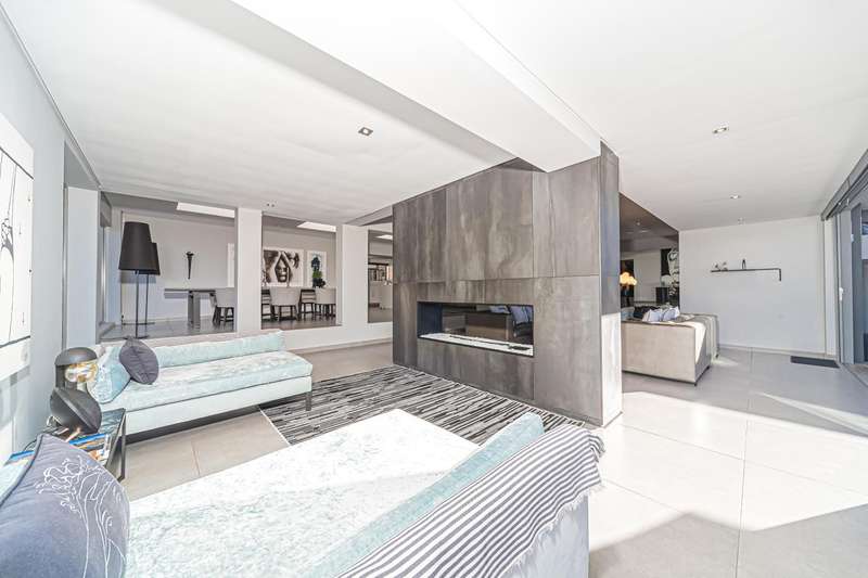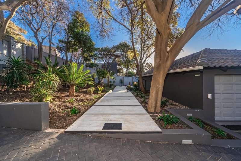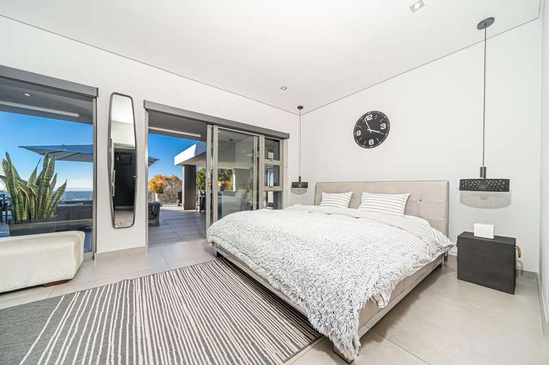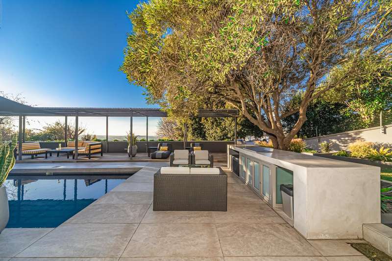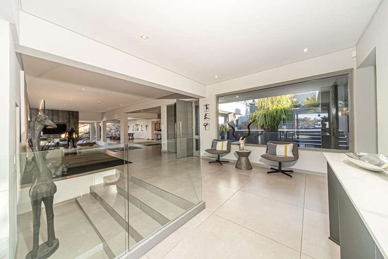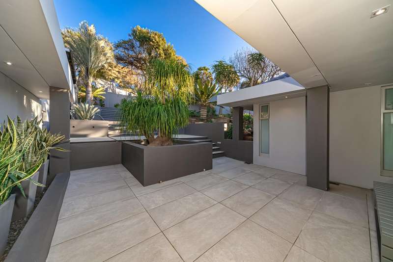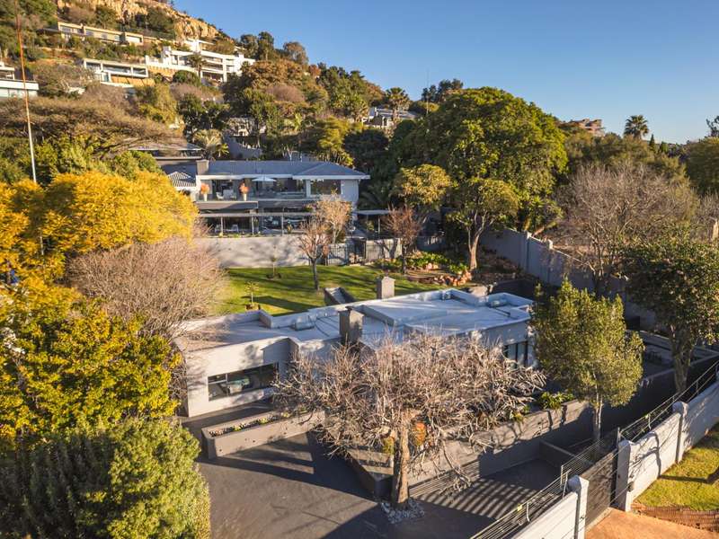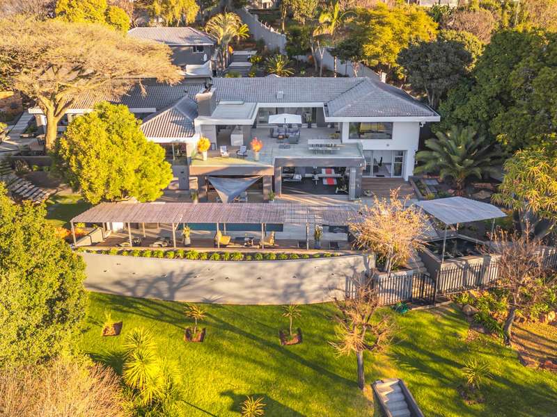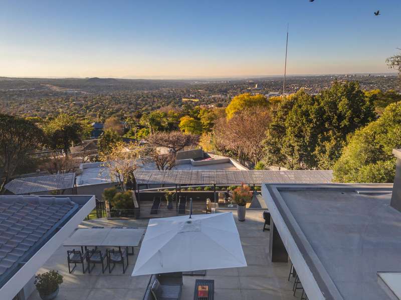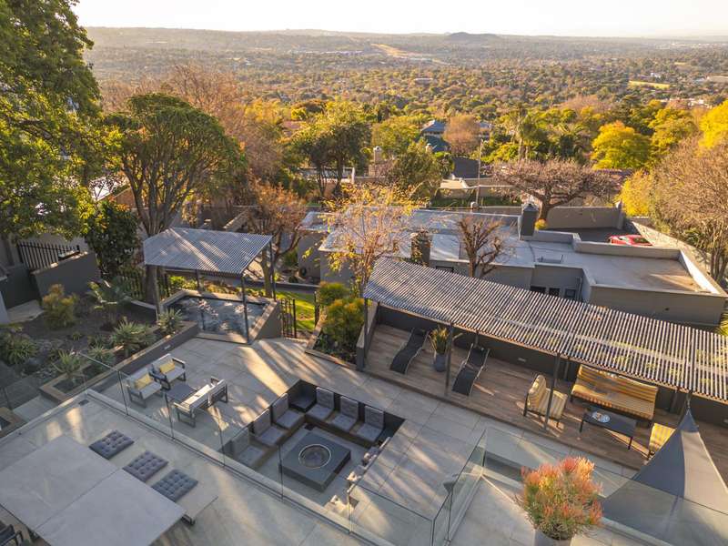 An architectural masterpiece that has 2 homes on the property with stunning sunsets and Magaliesburg mountain views This exquisite property nestled in the heart of Northcliff on Millionaires row offers an unparalleled blend of luxury and space. As you enter you are greeted by a grand entrance and an amazing water feature that was created by the owners from tons of large rocks that were brought in. The garden is surrounded by very large indigenous cycads many years old that lead you to this amazing property where you will find 2 modern homes for the extended family or run an Air B and B from the second home both with their own entrances on 2 separate streets. The home has a borehole with 2 tanks that supply 10 000 litres of water and never be without electricity from the 30 000 KW/hour generator that supplies both houses Features Main house has 4 bedrooms and 4 bathrooms The main bedroom is air conditioned with stunning views and access to the patio and entertainment area. A large walk in closet that houses the camera and security system and a bathroom with bath and shower Second bedroom - Access to entertainment deck en suite bathroom with shower Third bedroom leads from entertainment area with a full bathroom and a private balcony 4th bedroom can be utilized as a study or bedroom as it has a full bathroom as this wonderful home has ample space for another study Bedrooms are tiled and have automatic blinds Kitchen is open plan with lots of workspace on Caesarstone tops, 2 wine coolers and space for a large double door fridge. Top of the range appliances and a large island for extra workspace leading to an open plan lounge and Dining room with fi replaces for warm cozy evenings This home has exquisite light fittings and underfloor heating Large sliding doors that stack completely open and allow for expansive indoor/outdoor entertaining The top deck opens to a built in braai for easy entertaining from the Kitchen and living rooms Sip cocktails from the extensive patio as you look out at the most amazing views of the setting sun and the Magaliesburg mountain. This is a one of a kind home and lends itself to indulge and relax next to the heated pool and Jacuzzi. The second home is a 2 bedroom 2 bathroom home with guest cloakroom. There is a large open plan lounge and modern kitchen and has its own entertainment area. This magnificent property with 2 homes is designed for the discerning family who want to be totally spoilt OFFERS FROM R17M
