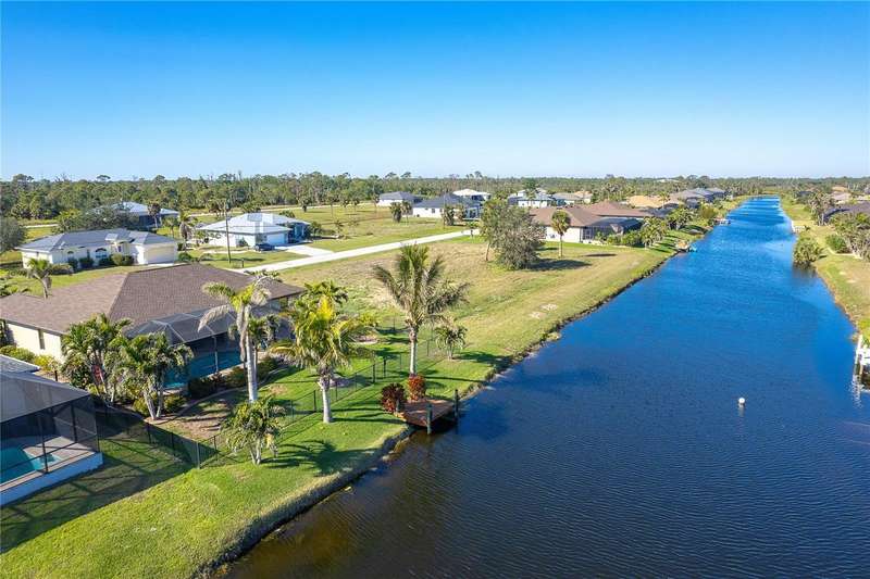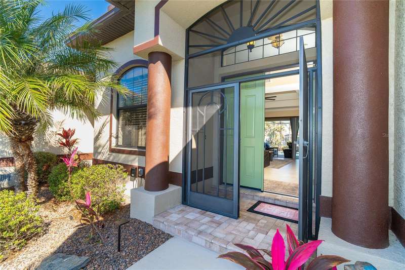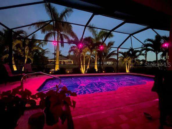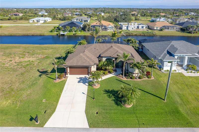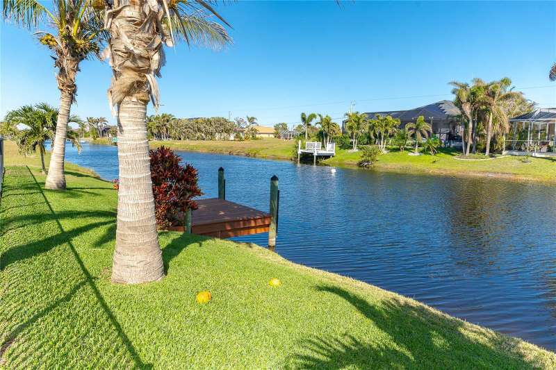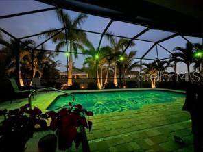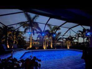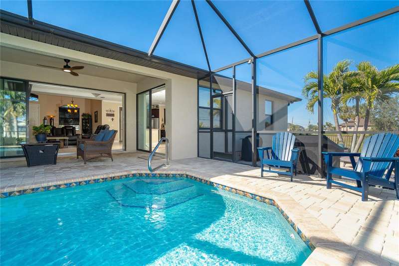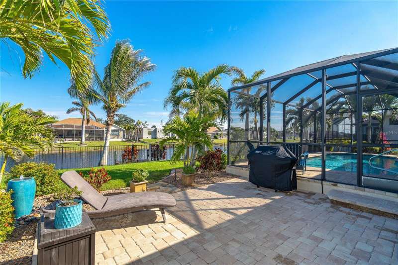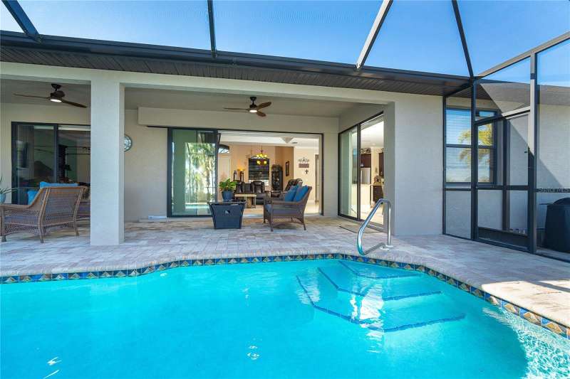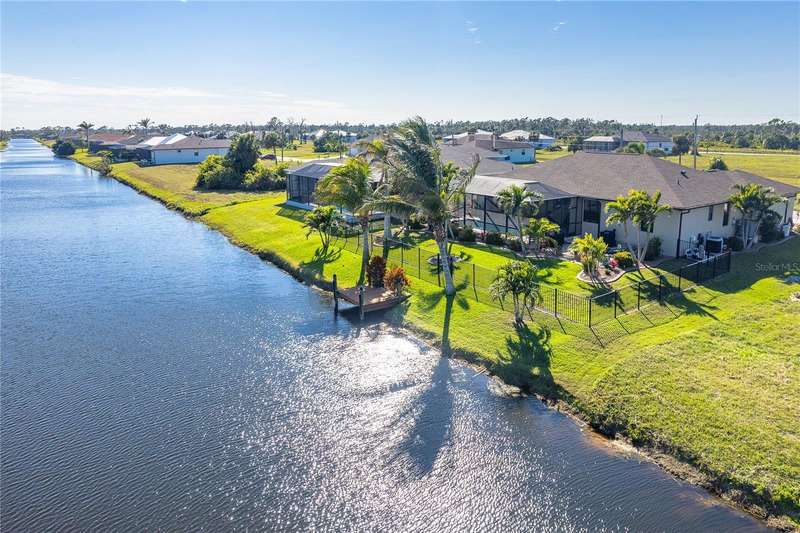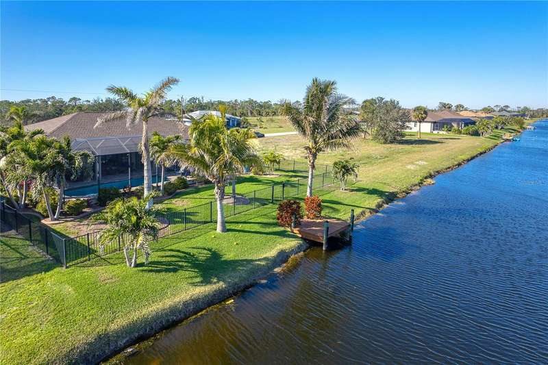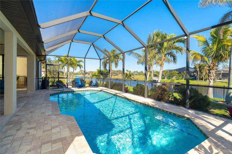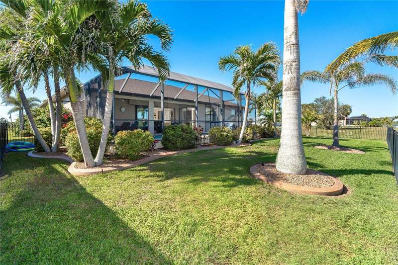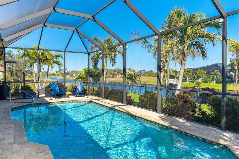 Under contract-accepting backup offers. One or more photo(s) has been virtually staged. This stunning home, built by Vantage Homes, offers a perfect blend of elegance, functionality, and modern convenience. Surrounded by meticulously maintained landscaping with CONCRETE CURBING, stone beds, and landscape lighting, the property also features an efficient in-ground IRRIGATION system that draws water from the canal. Recent upgrades include NEW ROOF, SOFFITS, and GUTTERS in 2023, as well as a NEW POOL PUMP. Outdoor living is enhanced with a paver lanai, SALTWATER POOL WITH HEATER, color-changing pool cage lights, and a spacious patio. The DOCK, equipped with lighting, complements the fenced backyard for added privacy. Inside, luxury abounds with granite countertops, crown molding, tray ceilings, 5 ½-inch baseboards, INSULATED INTERIOR WALLS, and 8-FOOT INTERIOR DOORS. The home boasts 12x24 tile in main areas, luxury vinyl flooring in bedrooms, and modern appliances, including a refrigerator, washer/dryer, and stand-up freezer. Additional conveniences include a screened front porch, EV outlet, generator outlet with panel interlock, water softener, whole-house vacuum system, and surge protection on all electrical panels. This home truly has it all!