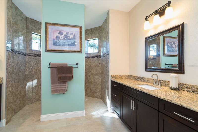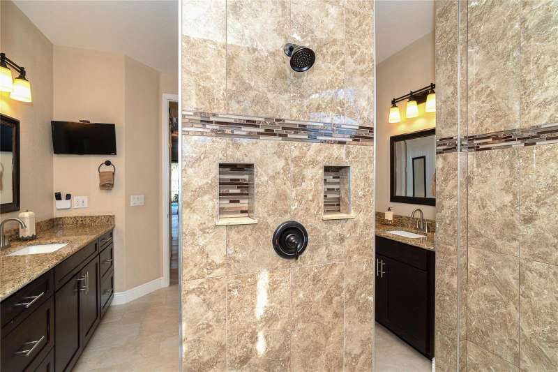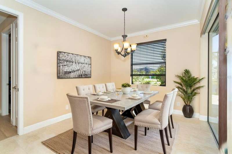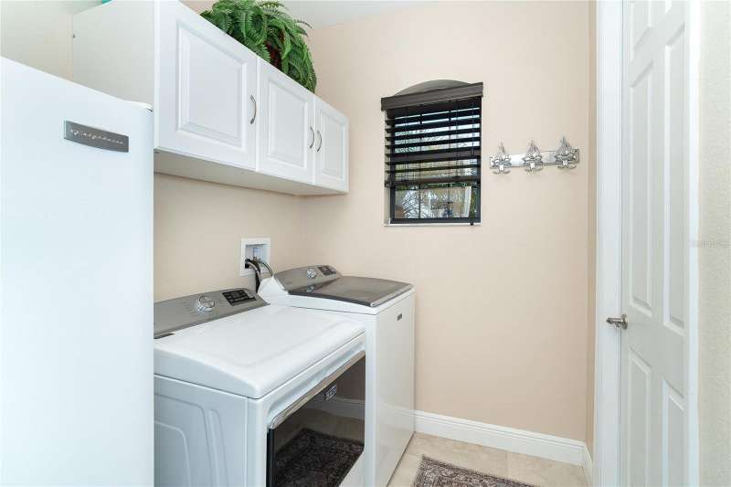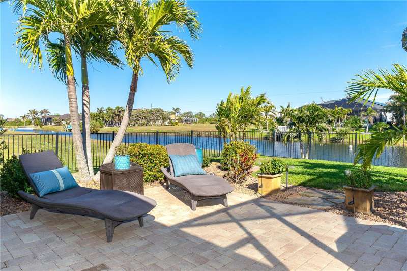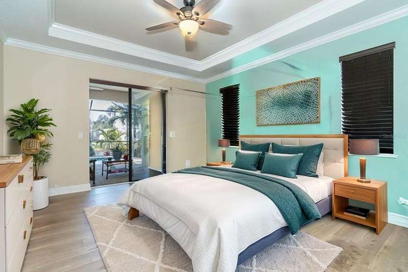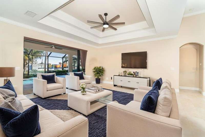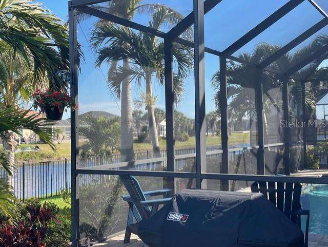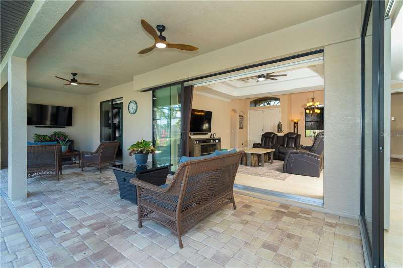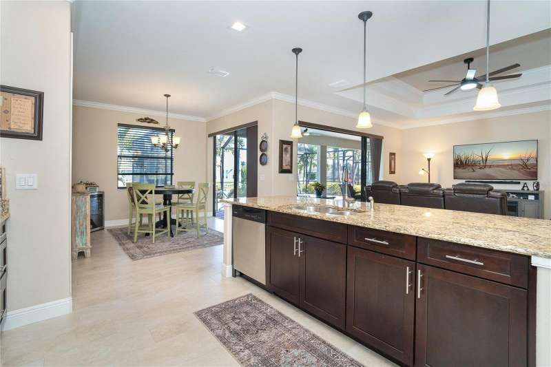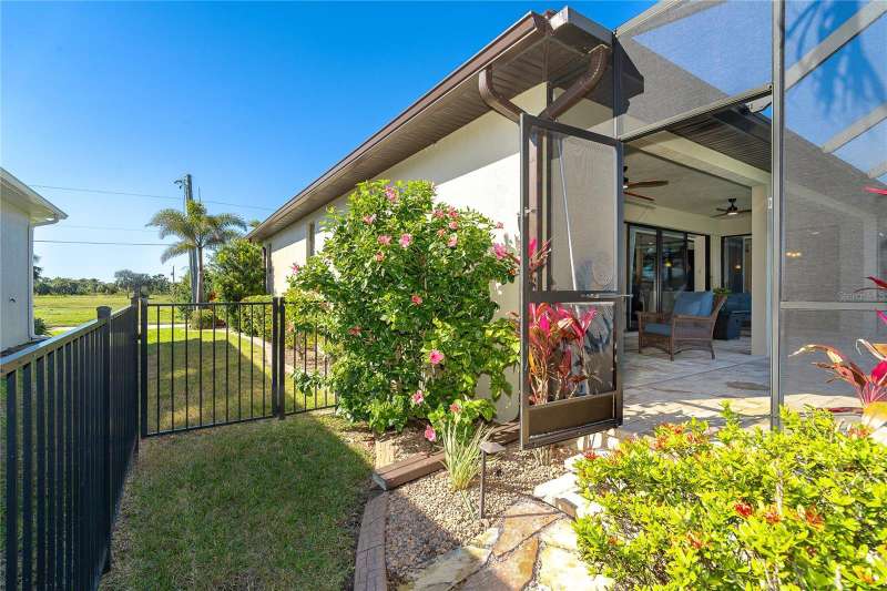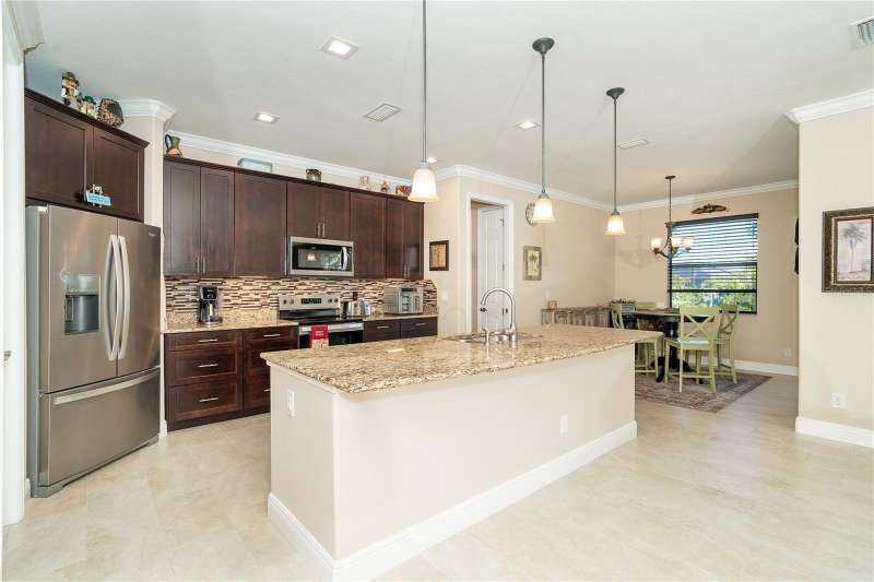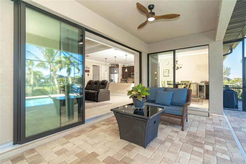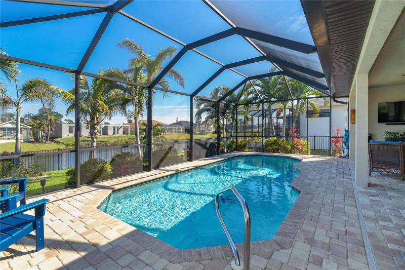 Under contract-accepting backup offers. One or more photo(s) has been virtually staged. This stunning home, built by Vantage Homes, offers a perfect blend of elegance, functionality, and modern convenience. Surrounded by meticulously maintained landscaping with CONCRETE CURBING, stone beds, and landscape lighting, the property also features an efficient in-ground IRRIGATION system that draws water from the canal. Recent upgrades include NEW ROOF, SOFFITS, and GUTTERS in 2023, as well as a NEW POOL PUMP. Outdoor living is enhanced with a paver lanai, SALTWATER POOL WITH HEATER, color-changing pool cage lights, and a spacious patio. The DOCK, equipped with lighting, complements the fenced backyard for added privacy. Inside, luxury abounds with granite countertops, crown molding, tray ceilings, 5 ½-inch baseboards, INSULATED INTERIOR WALLS, and 8-FOOT INTERIOR DOORS. The home boasts 12x24 tile in main areas, luxury vinyl flooring in bedrooms, and modern appliances, including a refrigerator, washer/dryer, and stand-up freezer. Additional conveniences include a screened front porch, EV outlet, generator outlet with panel interlock, water softener, whole-house vacuum system, and surge protection on all electrical panels. This home truly has it all!