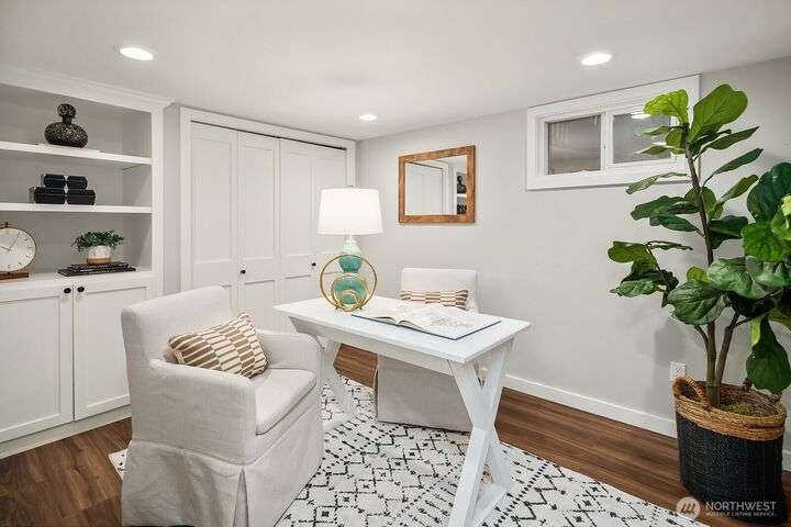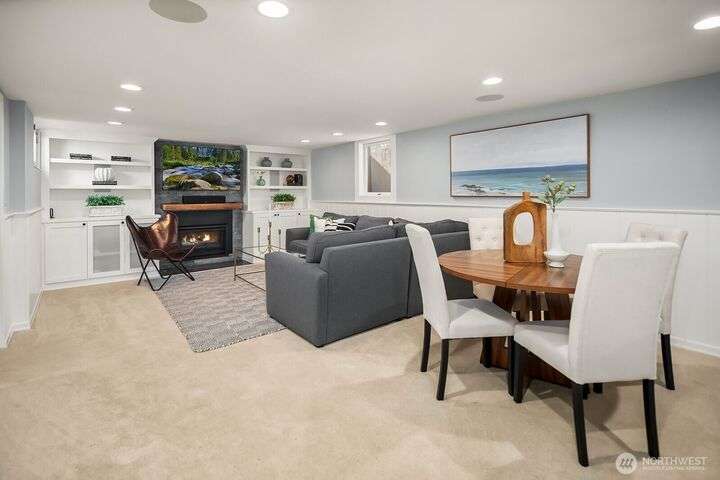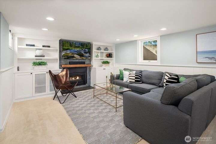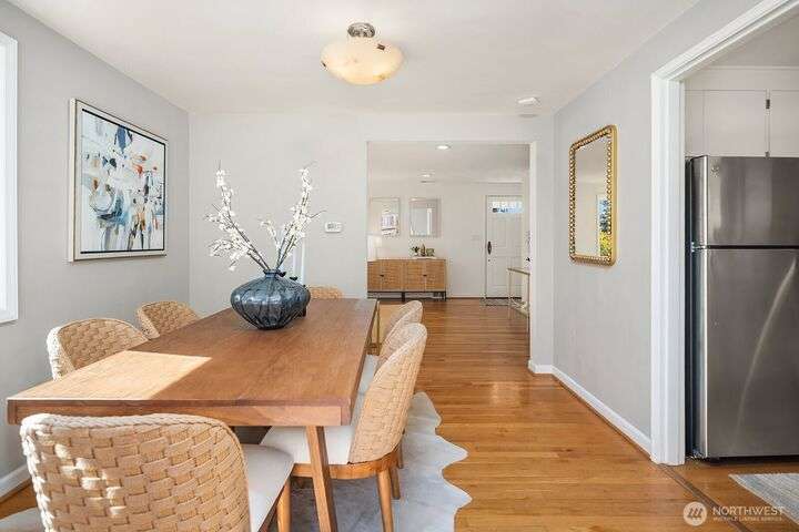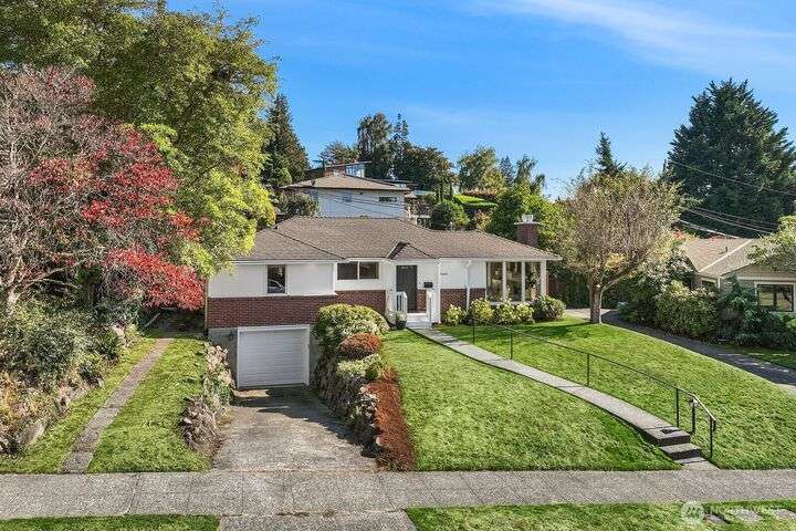 Contemporary updates blend w/ mid-century elegance in this Belvedere Terrace home, perfectly situated on an expansive, sun-drenched lot. The living room, bathed in natural light from its floor-to-ceiling windows, is anchored by a marble fireplace & rich hardwood floors. The dining room seamlessly opens to an inviting deck, ideal for entertaining. The kitchen is equipped w/ SS appliances, brushed brass hardware, & Corian countertops. Three generous bedrooms & an updated bath complete the main. The lower level offers a private retreat, including a remodeled family room w/ wet bar, a nonconforming bedroom or office, a second marble bath, a laundry room & a one-car garage. Soak in NE Seattle living w/ territorial views in this ideal location!