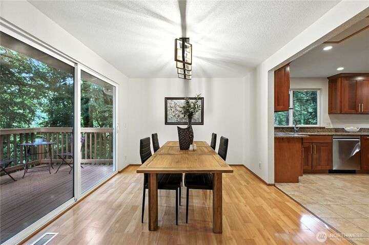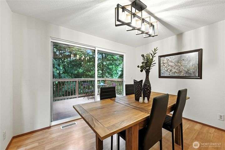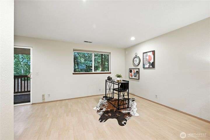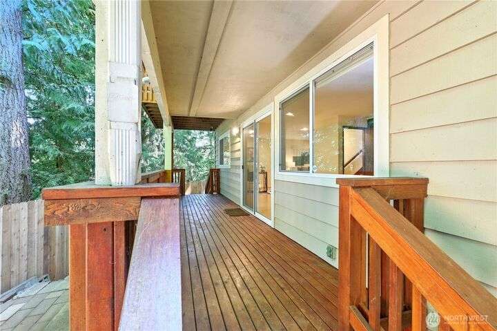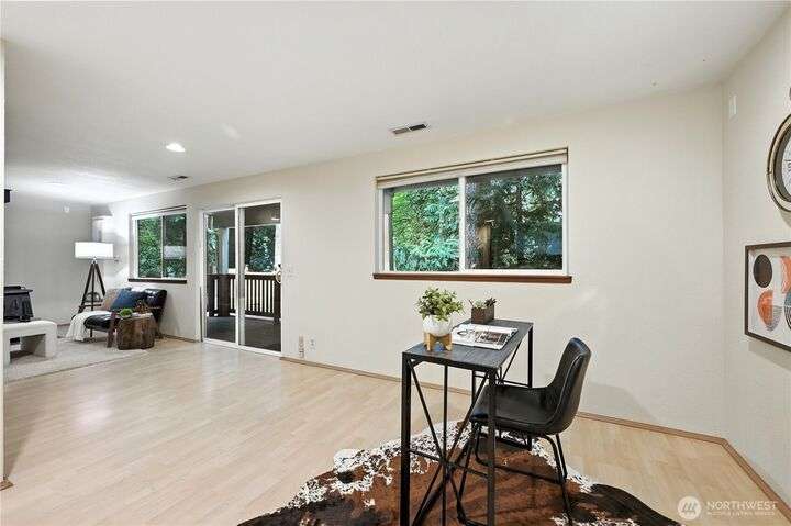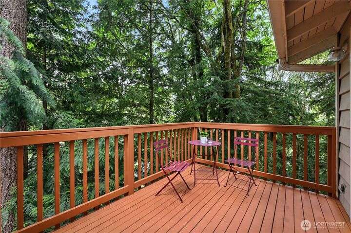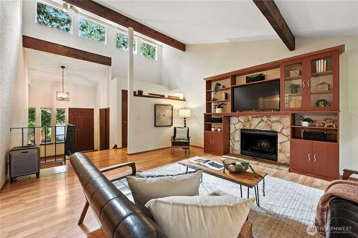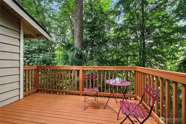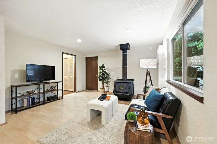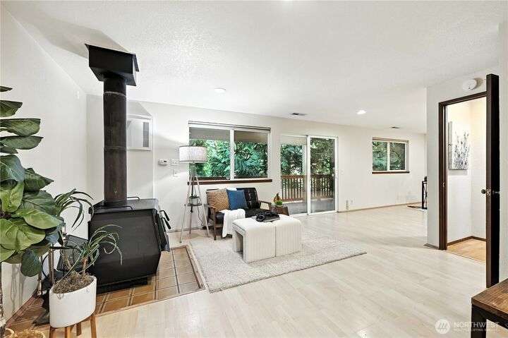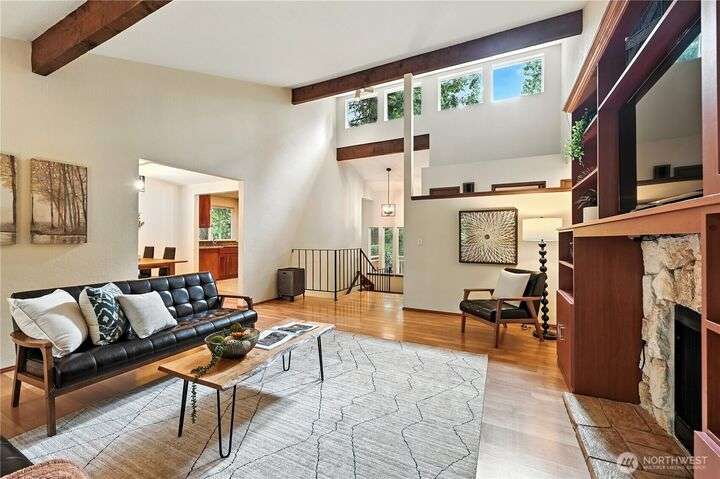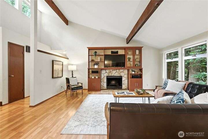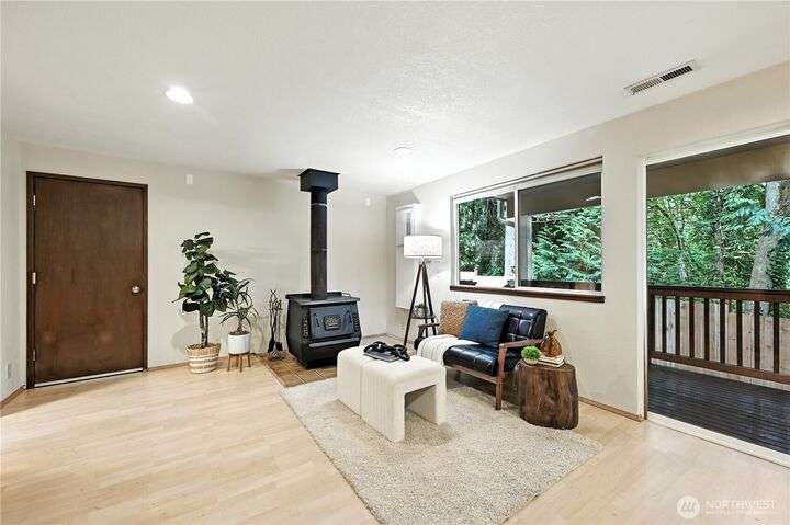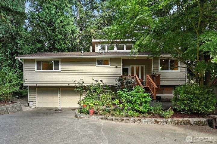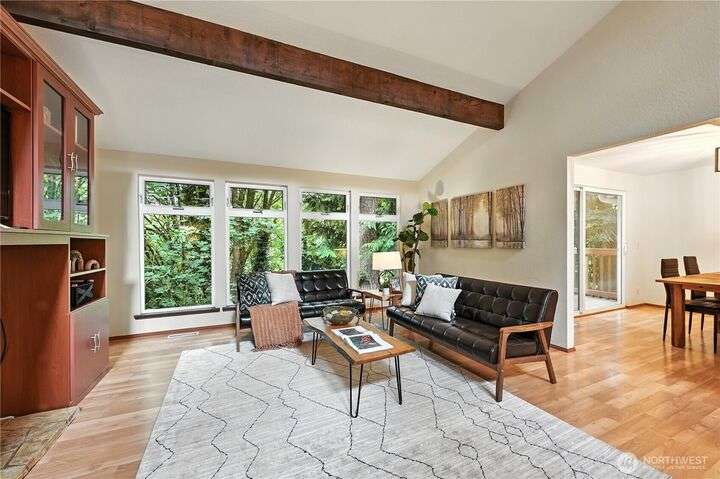 Perched above a wooded expanse, this Lake Forest Park sanctuary feels like a modern treehouse—where forest views, birdsong, and soothing sounds from McAleer Creek invite daily connection with nature. Vaulted ceilings and light-filled spaces offer peace and perspective. Chef’s kitchen w/granite counters NEW stainless appliances. Primary suite w/walk-in closet. Two more bedrooms & full bath on main. Finished daylight basement w/family/4th bedroom, wood stove, ¾ bath, new LG washer/dryer. New gas furnace, New tankless water heater, ERV ventilators, R-30 insulation. Garden space modernized shed & attached 2-car garage, near the LFP Town Center, Metro-Access. Lake WA beach rights via LFP Civic Club. Highly regarded Shoreline SD. Pre-Inspected!