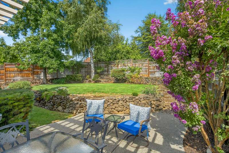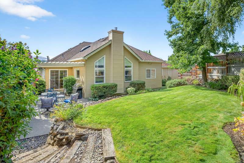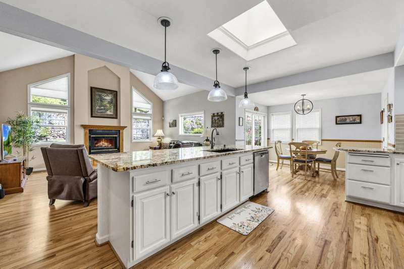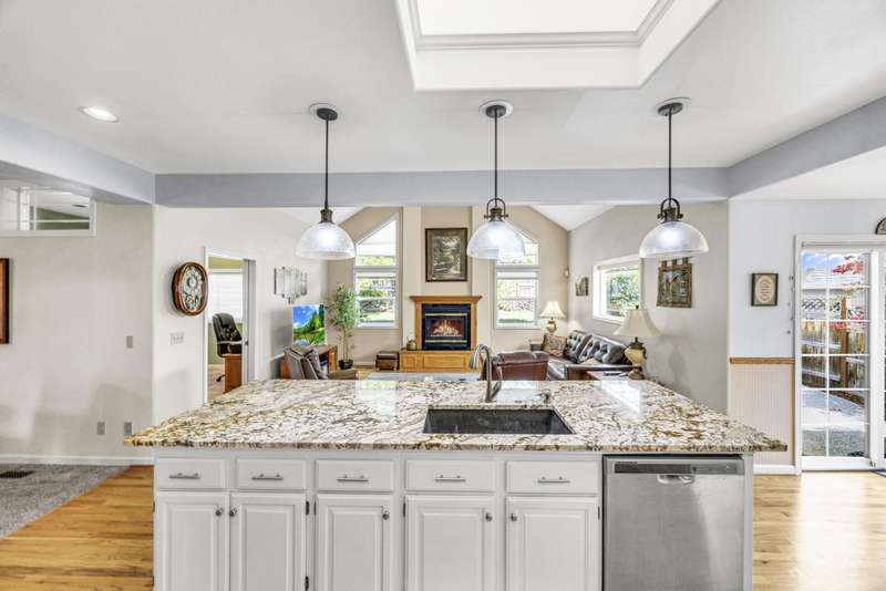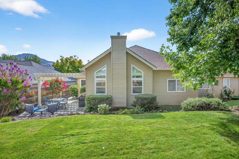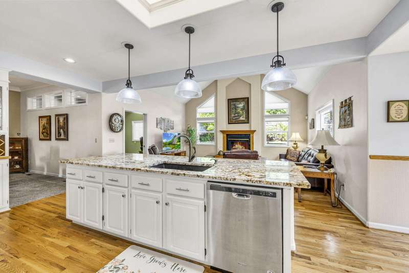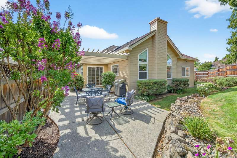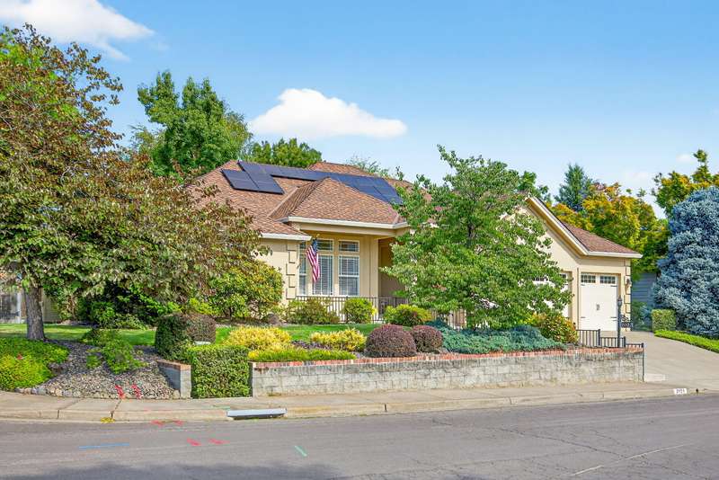 This beautifully maintained single-level home offers a timeless and functional layout. Inside, you'll find both a formal living room and a separate family room, a dedicated office, and an open-concept island kitchen with a generous walk-in pantry. Hardwood flooring runs throughout the main living areas. The bathrooms have been updated, with the primary bath featuring a large and beautiful walk-in shower, dual sinks, and heated floors. The spacious primary suite includes vaulted ceilings, a small fireplace and walk-in closet. Energy efficiency is a highlight—paid free and clear, the solar panels keep the average electric bill at $18 or less. The home also includes a durable 50-year roof, a newer HVAC system, and two brand-new garage doors with openers. Enjoy the private backyard retreat with a charming pergola-covered patio, perfect for outdoor entertaining.