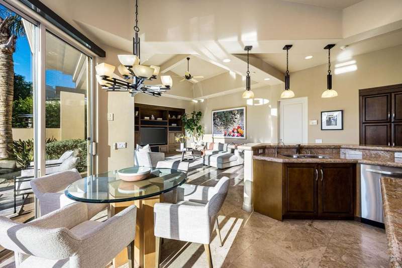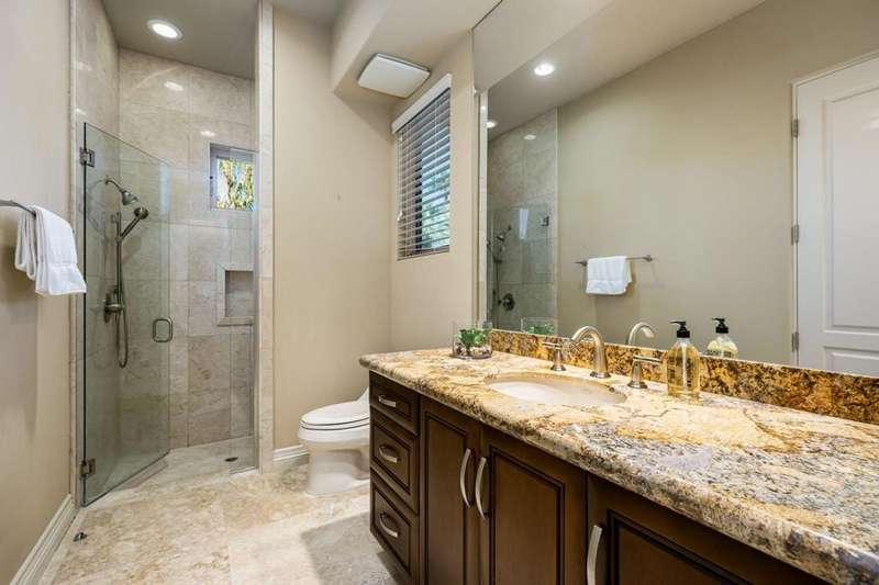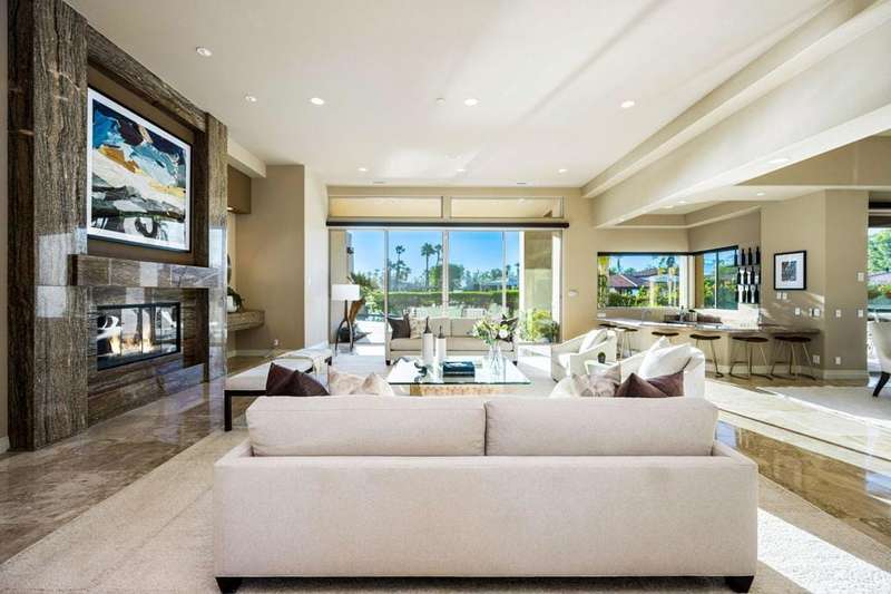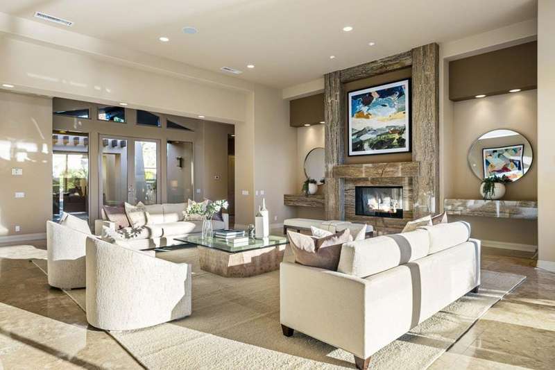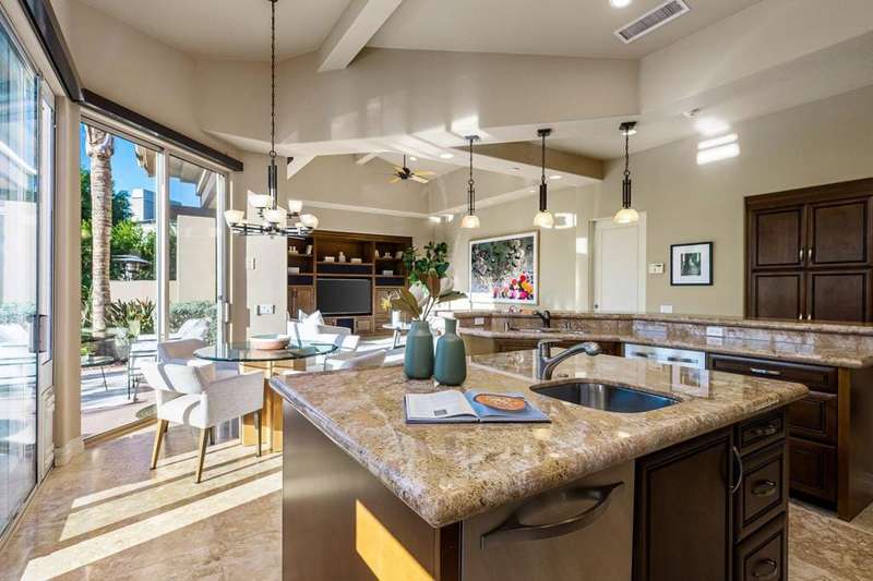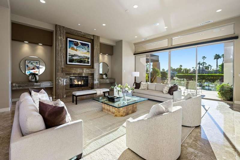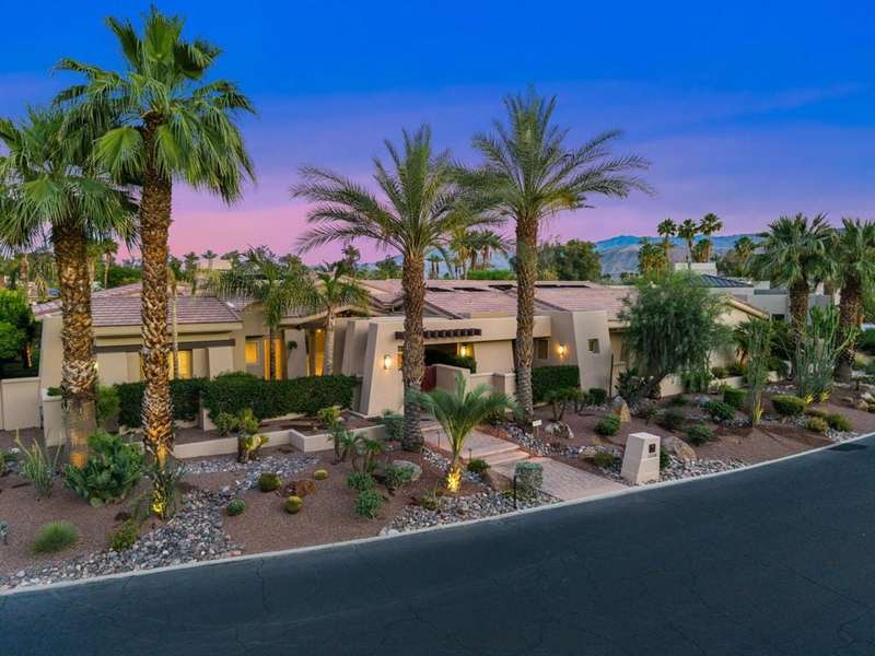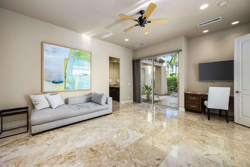 Custom Santa Fe Contemporary with Stunning Lakeside Setting and Grand Indoor and Outdoor Entertaining Spaces on .43 Acres in Coveted Fairway Estates. Custom Desert Landscaping Leads you to a Gated Courtyard with Architectural Beams and Double Glass Door Entry. Great Room with Soaring Ceilings, Walls of Glass, Stone Flooring, Floor to Ceiling Fireplace, Entertainer's Bar and Formal Dining with Built-in Buffet all with views of the Lake Terrace. Gourmet Chef's Kitchen with Granite Countertops, Stainless Appliances, Social Island with Counter Seating Open to Media Room with Built-in Entertainment Wall. Kitchen and Media Room open to the Lakeside Terrace for easy indoor/outdoor living and also contain an office area and nearby entertainer's bar. The Primary Suite includes a Large Bedroom with high ceilings, walls of glass, Retreat Area with fireplace and a Spa Bath with Double Vanities, Toilets and Walk-in Closets as well as a spa tub and large marble clad shower. 2 guest bedrooms with ensuite bathrooms, walk-in closets and Outdoor Patio Space. Outside you will find covered Outdoor Living Room and Dining Room, Expansive Terrace with Pool and Spa and Built-in BBQ Island with Bar Seating all with lakeside and mountain views. Owned Solar, Automatic Shades, Side Load 3 Car Garage - it's all here. Come home to your own Custom Desert Lakeside Retreat!