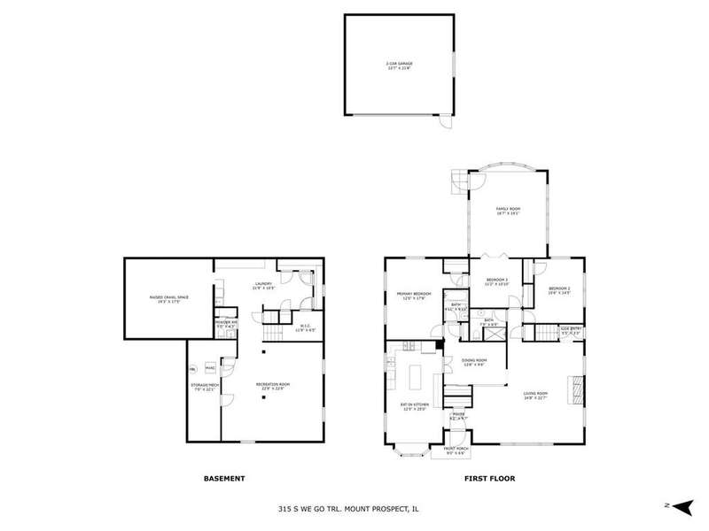 Welcome home! This 3 bedroom, 2.1 bathroom RANCH in the We Go Park neighborhood of Mt. Prospect just hit the market after 67 years of pride in ownership. This home boasts over 2200 sq. ft. above grade with a full finished basement (1100 sq. ft) and a raised crawl space. Step inside to the warmth of the over-sized living room with fireplace, big picture window, and space for entertaining. The adjacent dining room is open to the living room, providing that line of sight to playtime, game time, or relaxation. The kitchen is HUGE with a center island, coffee/wine bar, solid oak cabinets and an eat-in area. The bay window in the kitchen with bench storage completes the look. You'll find 3 good-sized bedrooms with hardwood floors, and 2 bathrooms that have been well-maintained over the years. A garden room (or family room) is off of bedroom 3, but can easily be converted into a massive primary suite, overlooking the greenery of the beautiful backyard. In the basement, drywall, newer carpet, and an open plan leaves plenty of room for an entertainment system, sofa, toys, tables, and whatever your heart desires. The laundry room has countertop space galore, more storage closets than you'll need, and is light and bright. This home has been lovingly cared for and it truly shows. Well-maintained and clean, it is move-in ready with opportunities to make it your own. Hardwood flooring in bedrooms, dining room, and living room. Lots of potential with this home and the location is stellar. Furnace and AC less than 6 years old. 2 blocks from Mt. Prospect Golf Club, 1 block from Lincoln MS, 1 mile to Metra station, and all that downtown MP has to offer. And less than 1 mile to Melas Park. Perfect location. Award winning District 57 (Westbrook/Lions and Lincoln MS) and Prospect High School. Check it out!
