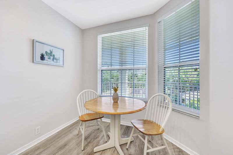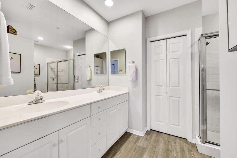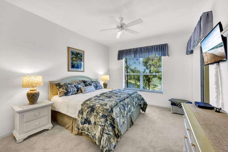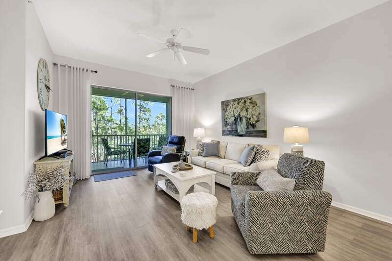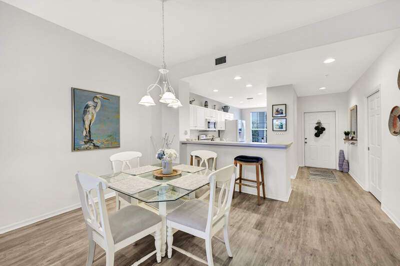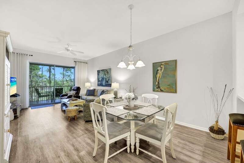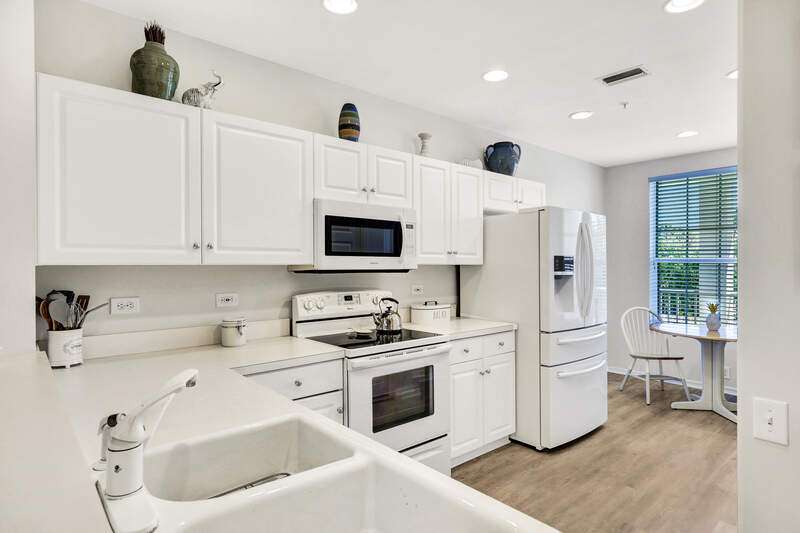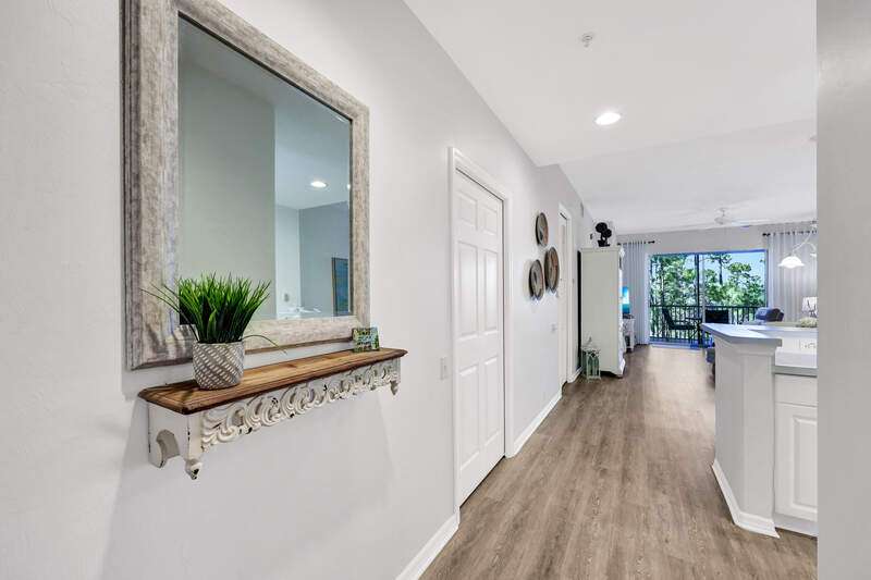 Enjoy long views of the 11th hole and two lakes from this third floor Hampton model. Just steps to one of the 3 satellite pools. Make this very well-maintained condo your own. It has higher ceilings and vinyl plank flooring in the kitchen, living areas and bathrooms. You will appreciate the many community amenities offered including bundled golf, with no waiting list to play, 3 satellite pools, a state-of-the-art fitness center with optional classes, massage services and physical therapy, and Har-Tru tennis courts where you can also play bocce and pickleball. Enjoy al fresco dining at the renovated Terrace Cafe as well as casual and fine dining, or a drink with friends at the recently refreshed clubhouse. The main pool area/activities complex is currently under construction, with a new pool and bocce courts and is expected to be completed by the spring of 2025. There are no special assessments for residents currently. Vanderbilt Country Club is very social with many organized activities and golf groups.