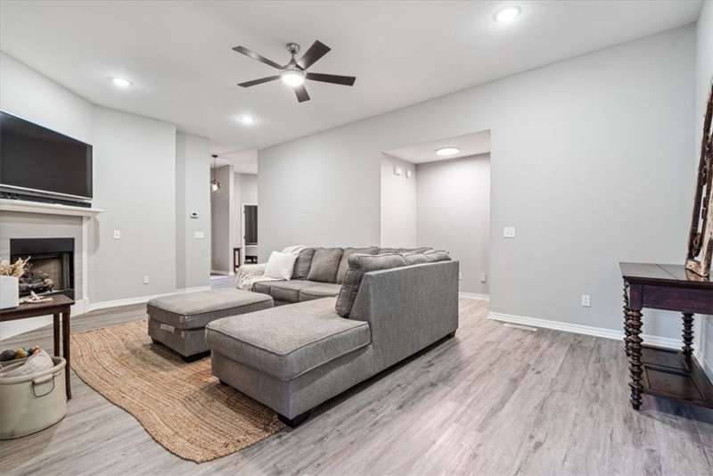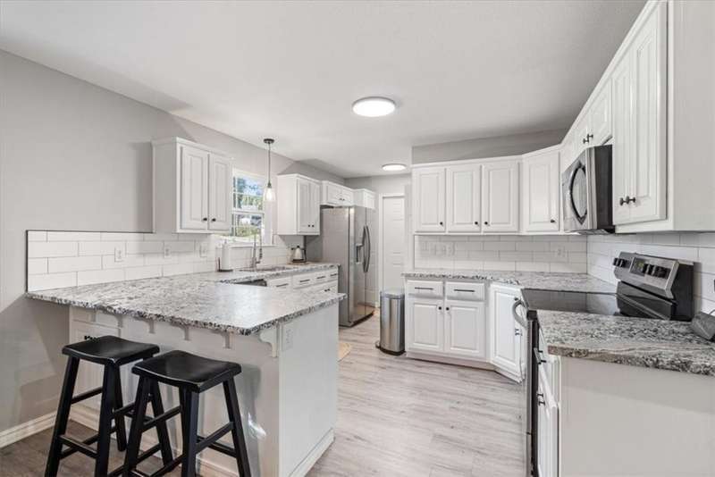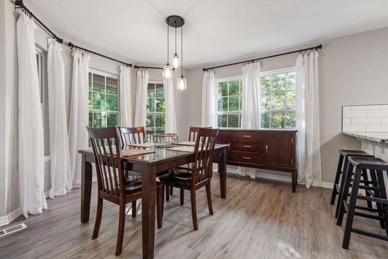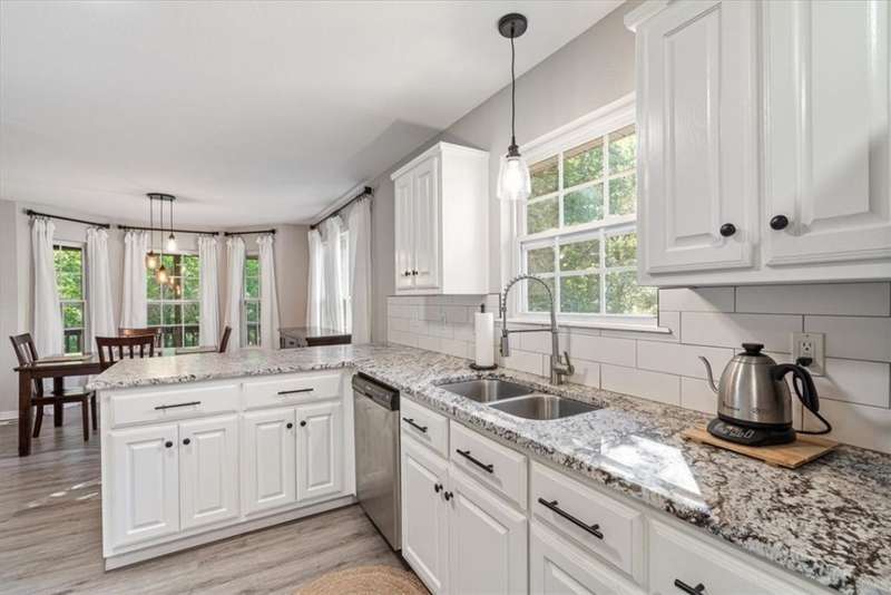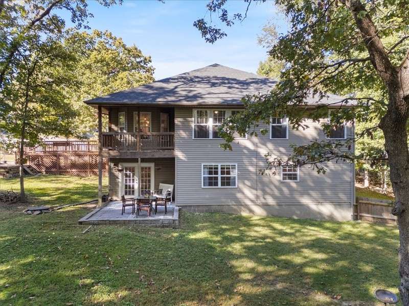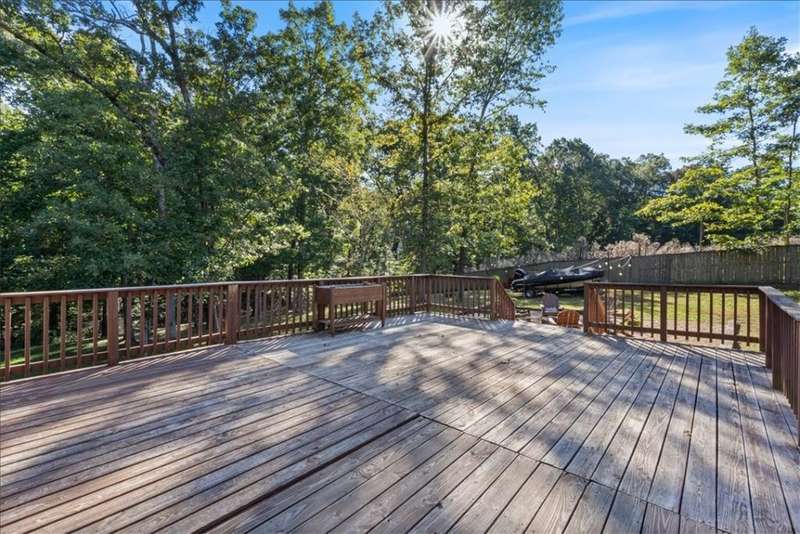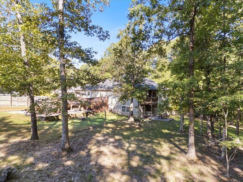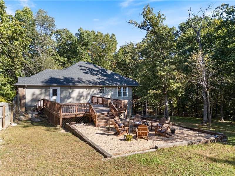 Beautifully situated on two wooded lots at the end of a quiet cul-de-sac, this 4-bedroom, 3-bath home offers 2,774 sq ft of inviting space and privacy just down the road from Back 40 Trail access. The main level features an open living room with fireplace, a spacious kitchen with stainless appliances, bar seating, and dining area, plus a flexible office with deck access. The split-bedroom layout includes a spacious primary suite with dual closets, whirlpool tub, and separate shower, along with a second bedroom and full guest bath. The walk-out basement provides an additional full kitchen, large secondary living area, two bedrooms, and a full bath ideal for guests, extended family, or a home studio. Outdoor spaces include a fire pit and seating area surrounded by trees, offering a peaceful setting for entertaining or relaxing. On sewer, double lot, and ready to enjoy!