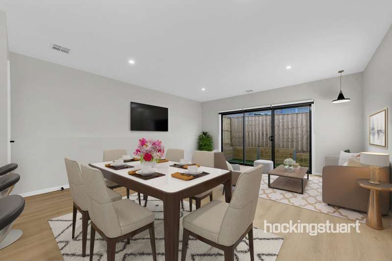Embrace the perfect blend of style and comfort with this beautifully designed home, ideal for first-time buyers and astute investors. Thoughtfully crafted with modern living in mind, this delightful residence offers three well-appointed bedrooms, delivering effortless convenience in a welcoming setting. Step inside and be greeted by the warmth of elegant floorboards, leading you through the inviting open-plan living, dining, and kitchen area. Designed with practicality and charm, this space is perfect for both relaxed evenings and entertaining guests, complemented by quality finishes that enhance its contemporary appeal. Stay comfortable year-round with refrigerated heating and cooling, ensuring the perfect temperature no matter the season. The master bedroom is a peaceful retreat, complete with a walk-in robe and a stylish ensuite featuring a vanity for added luxury. The additional bedrooms, each fitted with built-in robes, provide cozy and functional spaces for family or guests. A well-equipped laundry adds everyday convenience, offering easy outdoor access to a compact yet low-maintenance outdoor space-ideal for quiet moments of fresh air. Situated in a highly sought-after location, this home is just moments from Edgars Creek Primary and Secondary Schools, making school drop-offs a breeze. Nearby, Aurora Village offers a vibrant selection of shops, cafés, a medical center and fitness facilities, ensuring all your lifestyle needs are met. With easy access to the Hume Freeway for a stress-free commute, plus a dedicated parking space, this charming modern home is a wonderful opportunity not to be missed. Contact Love Sharma 0430 534 802