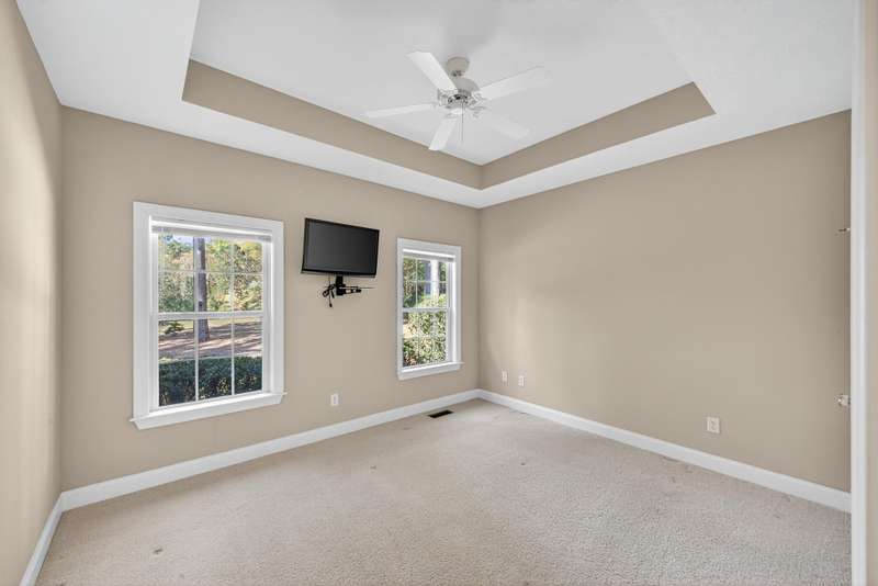 This is a custom built Wolfe home - one owner. Home is perfectly placed on ½ ac to take advantage of the open space, nature trail and a private pond which borders the property. You'll enjoy the beautiful views of pond with fountain and open space throughout the year. The floor plan offers a semi-open concept with great room and formal dining area. Great room features trey ceilings, recessed lighting, and French doors leading to sunroom. Another set of French doors lead to office. The formal dining area is enhanced with picture frame paneling, and a cherry-colored hardwood floor border. The updated kitchen offers granite countertops, stainless appliances, stone tiled backsplash, pantry, cabinets with pull-out shelving, snack bar and 9 x 12 breakfast area. The primary bedroom is a spacious 20 x14 with trey ceiling. The primary bath offers double sinks, granite countertops, a walk-in glass shower, separate tub, private water closet area and his & her walk-in closets. A second bedroom, a second full bath and laundry, are on the opposite side of the first floor. On the second level is the 3rd bedroom/bonus room with a full bath, a large clothes closet, and storage area. The second level is serviced by a mini-split HVAC for efficiency. Also serviced by its own mini-split is the 17 x 20 sunroom which displays a stamped concrete floor and full wall glass windows to enjoy the back park-like setting. A backyard stamped concrete patio offers an outdoor area with natural gas for grilling. Castlesteads Drive is located in ''Aiken's Choice'' Cedar Creek. Amenities include golf, tennis, swimming, pickleball, community center, walking trails, nature trails, mini parks, and ponds. County taxes only.