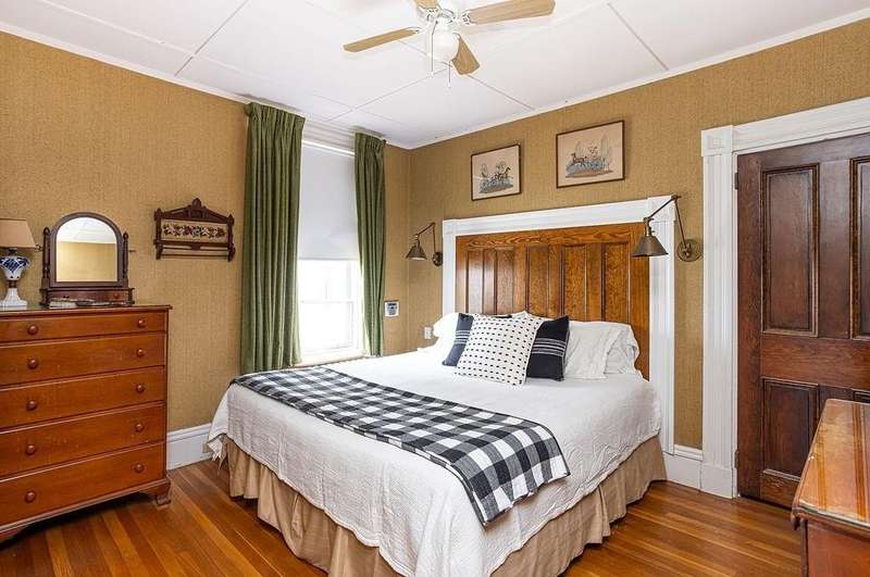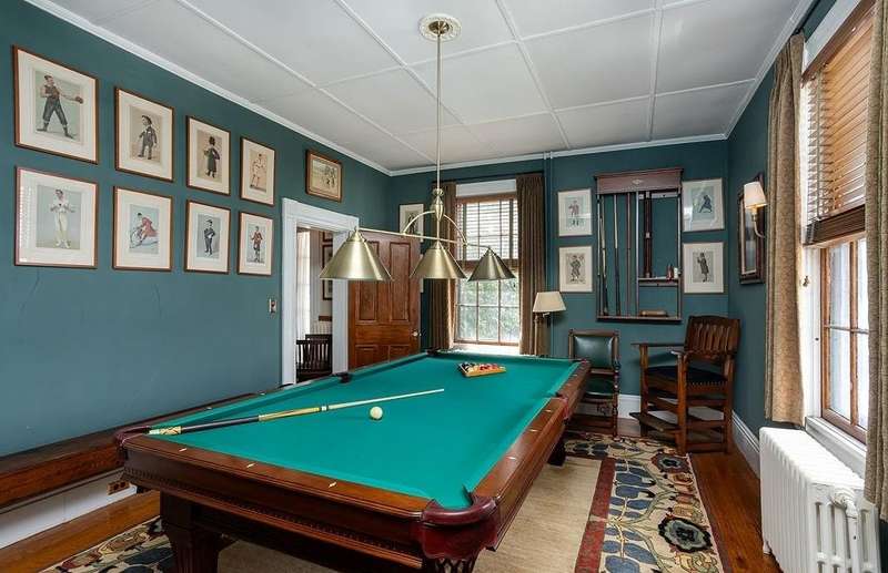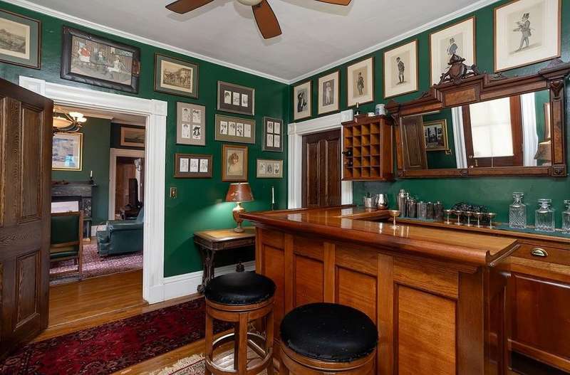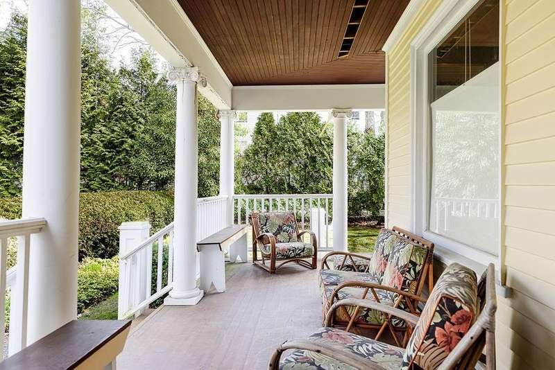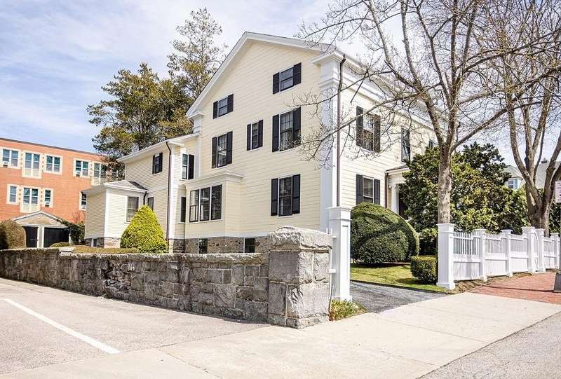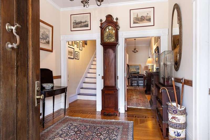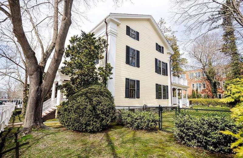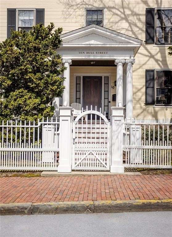This stately Greek Revival is a commanding presence on Bull Street. Nestled among mature trees in a coveted in-town location, it offers grand proportions and period craftsmanship rarely found today. Built in 1842, Ten Bull St showcases a gracious central foyer, double parlors, a handsome library, three fireplaces, and a club-style bar. Soaring ceilings, oversized windows, and wide hallways reflect the refined aesthetic of mid-nineteenth-century Newport. The recently renovated kitchen, features a center island, quality appliances and a beverage refrigerator. Upstairs, a flexible layout includes parlor, den, office, three bedrooms, and a small kitchen—ideal for extended stays or creative reconfiguration. The third floor offers two additional bedrooms, a full bath, a cedar closet and unfinished space with potential. A gym, full bath and sauna are located in the basement. The 16,270 sq ft yard is partially fenced, with ample room for a pool, gardens, or outdoor entertaining. A two-car detached garage and additional parking are located behind the house at the end of a long gravel driveway. While some updates may be desired to restore it to its full glory, this distinguished property offers high style within easy walking distance to Newport's harbor, shops and restaurants and attractions.