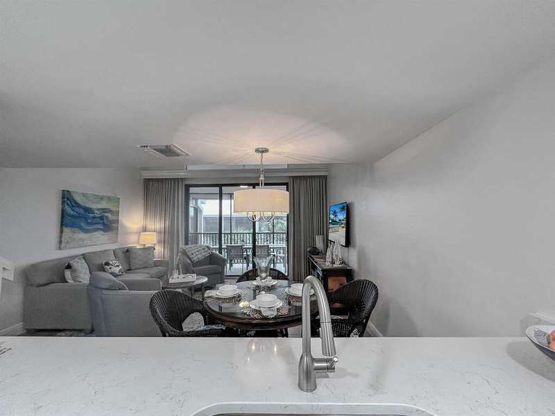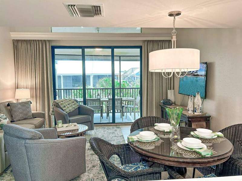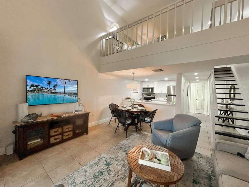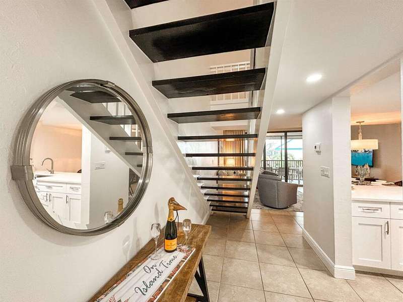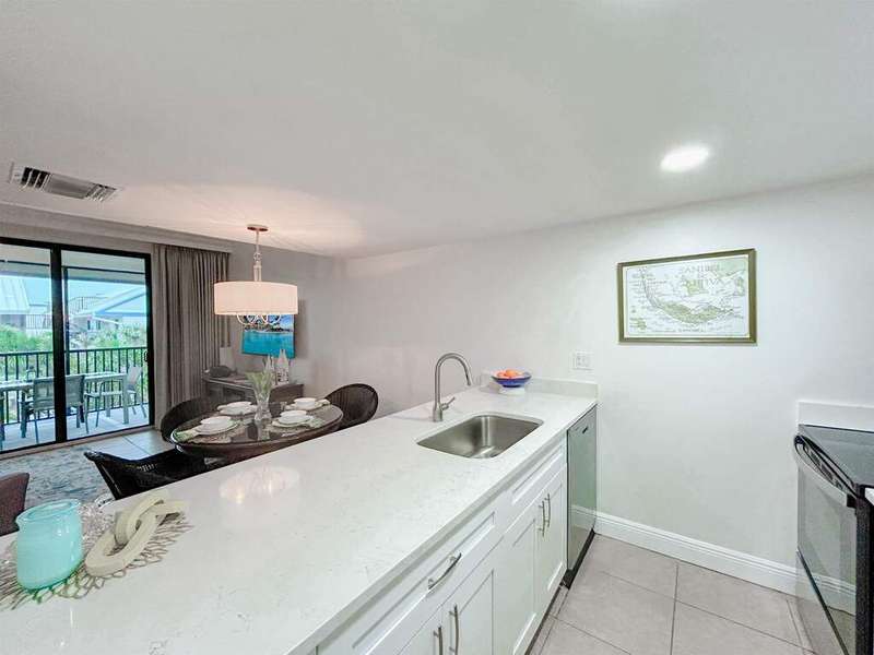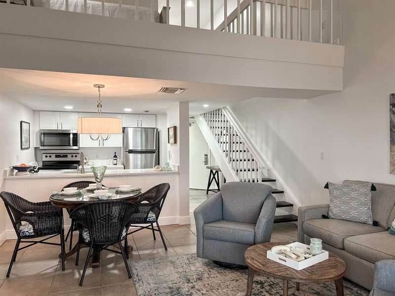 Located behind the gates of South Seas Resort, the exclusive Captiva Resort Villas community offers a serene coastal retreat with a sundeck, pool, gazebo featuring a outdoor dining area, and BBQ facilities. Nestled within the southern enclave, just steps from the beach, this renovated top-floor, two-story villa overlooks a lush courtyard and tropical vegetation. The open-concept design showcases quartzite countertops, white shaker cabinetry, and tile flooring in living areas, all complemented by stylish coastal decor and furnishings. Natural light pours in through impact sliding glass doors and a large picture window, while the screened lanai provides a perfect spot to enjoy the island breeze. The lower level hosts a private guest ensuite, while the upper level boasts a spacious primary ensuite, creating an ideal layout for both relaxation and entertaining. Experience resort-style living in this beautifully appointed villa, where modern elegance meets coastal charm.