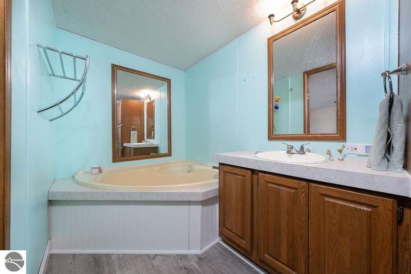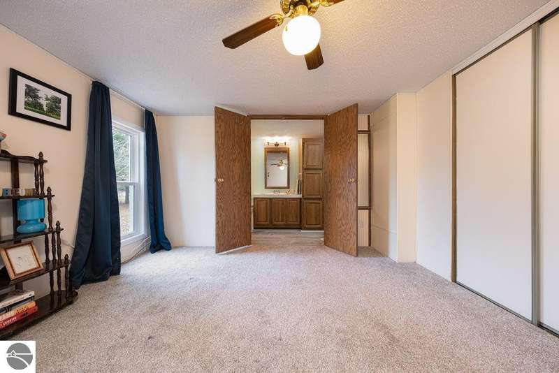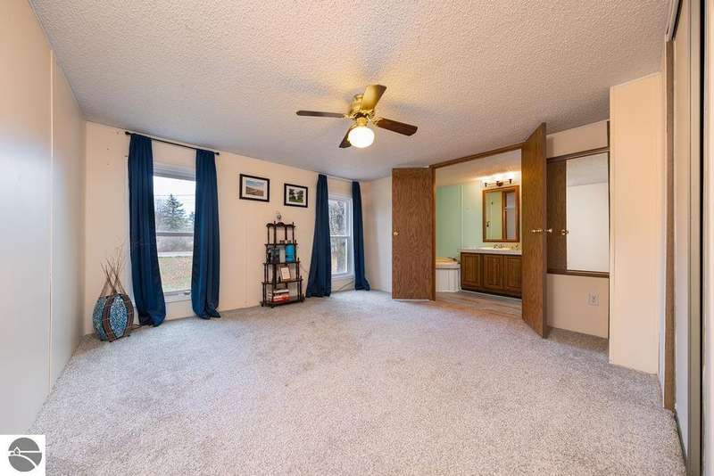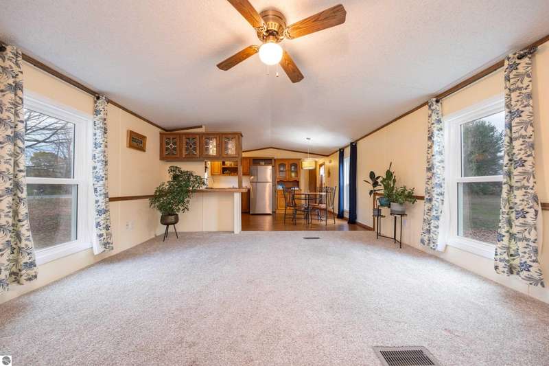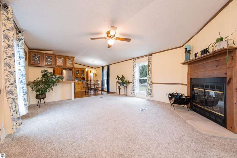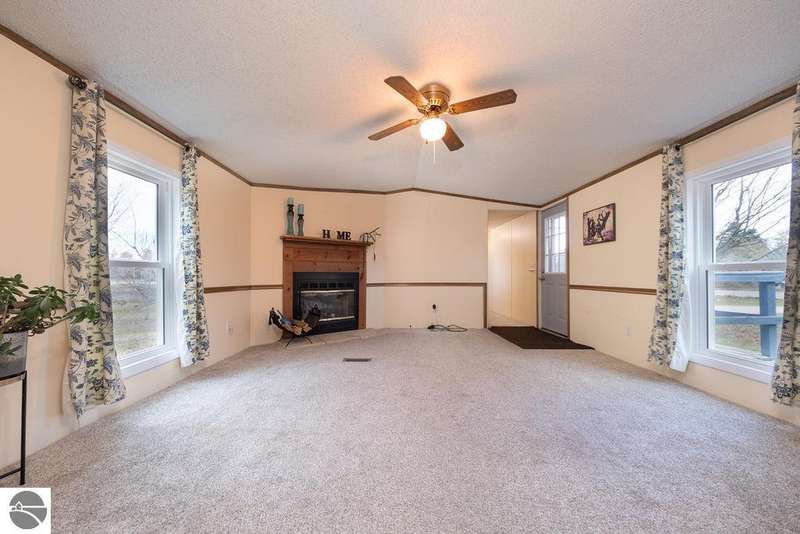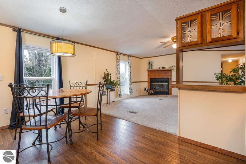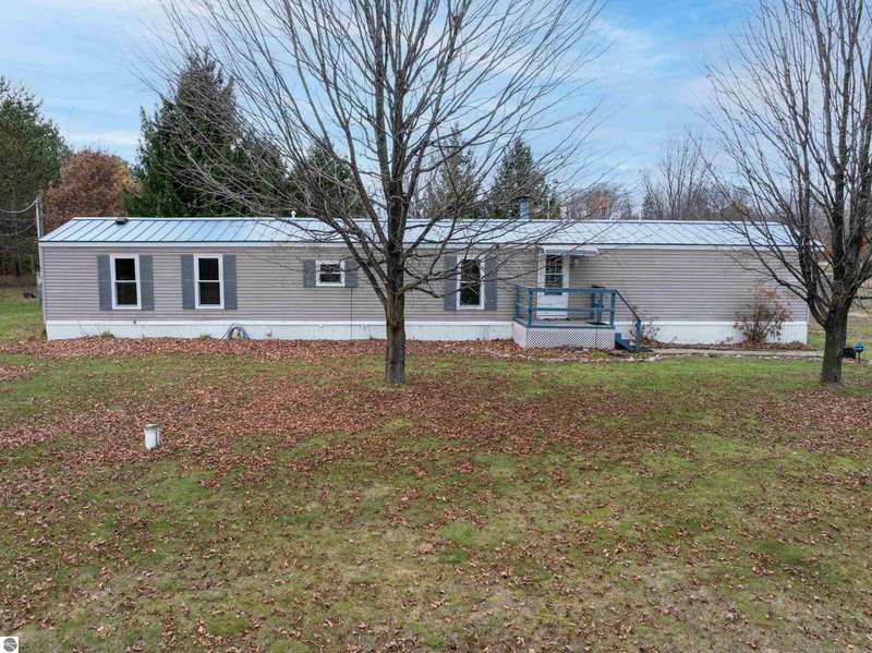 Extensively updated and well cared for, this 3 bedroom, 2 bath HUD home offers comfortable living on 1.3 acres just minutes from Interlochen amenities and summer concerts at Kresge Auditorium. Recent improvements include a new well pump (2023), metal roof (2017) with a 50-year transferable warranty, new furnace and water heater (2017), A/C (2019), and a top-of-the-line iron filtration system for the well (2020). The home also features a 50-amp exterior outlet for RVs, all new appliances (2017), and a wood-burning fireplace. Spacious bedrooms, an inviting layout, and a newly paved road add to the appeal. Outdoors, you'll enjoy a back deck over looking countryside views, garden area, young fruit trees including a Peach tree, Montmorency cherry, and Northern Spy apple. There are bluebird boxes around the property to add to the peaceful, nature setting. Affidavit of affixture on file. Welcome home!