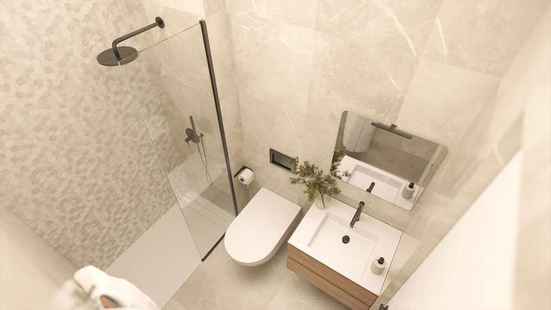 The apartments for sale in Torrevieja, Alicante are available as studios, 1-bedroom, or 2-bedroom units, featuring one or two bathrooms and living spaces ranging from 40 to 80 m². The interiors boast bright, open-plan layouts, pre-installed air conditioning, and thermal underfloor heating in the bathrooms. Also, modern and elegant finishes ensure both comfort and style.