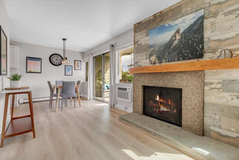 Stylish updates and a convenient location make this two-bedroom condo at the center of Boulder a great find! Enter a warm and welcoming space with wide-plank floors atop an open concept plan, centered around flatiron peekaboos, with a wood burning fireplace. Your updated kitchen offers modern finishes, appliances, and quartz counters, and opens to your private patio balcony- as ideal for morning coffee or evening relaxation as for container gardening. Two comfortable bedrooms share a full bath, with flexibility for guests or a home office. Residents enjoy access to an indoor saline pool, tennis courts, well appointed gym and community center. Close to trails, parks, shopping, dining, and public transportation, this North Boulder condo combines comfort and lifestyle in a sought-after setting.