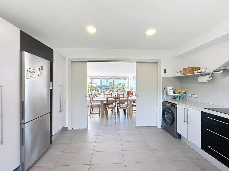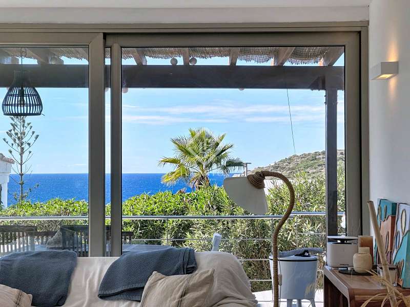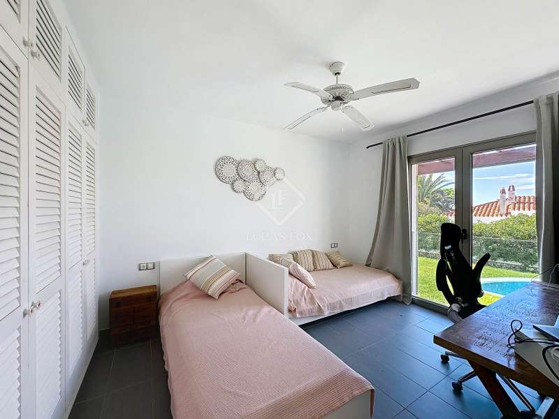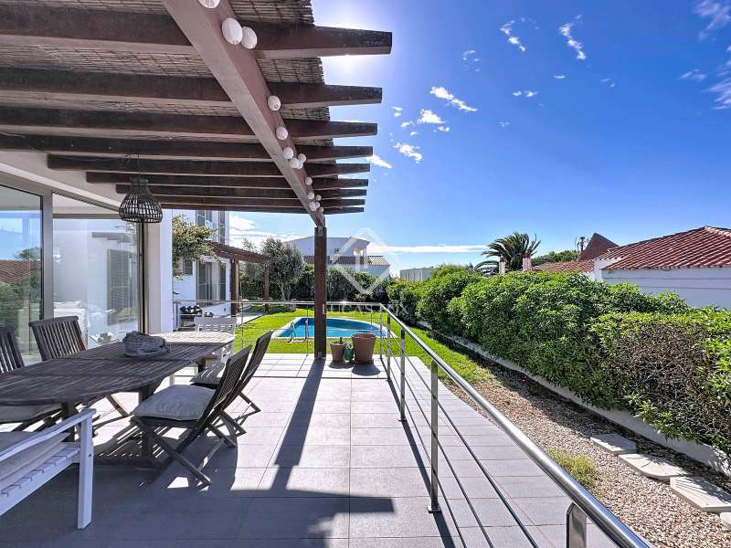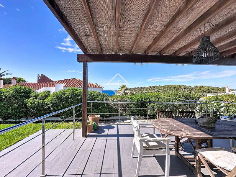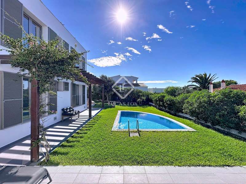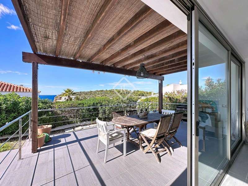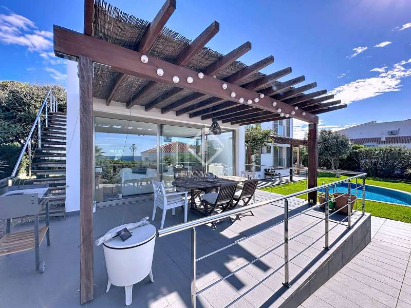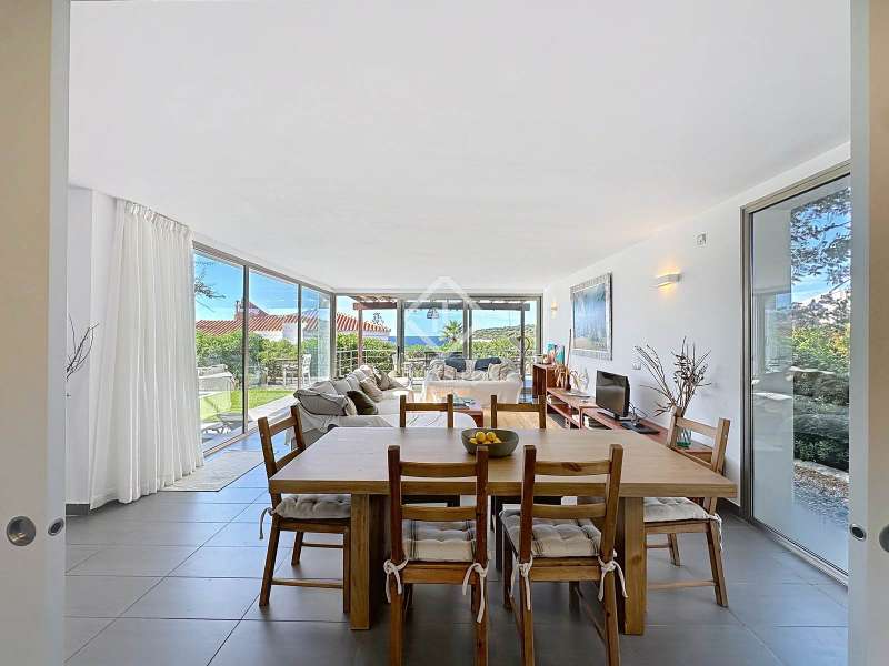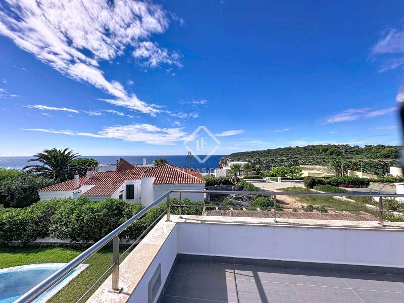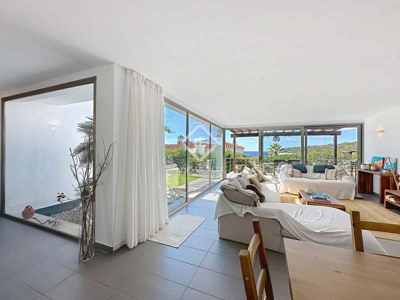 Lucas Fox presents this magnificent contemporary villa on the second line from the sea, situated in an elevated position on the south coast of Menorca, with spectacular views of the Mediterranean and distant views of the island of Mallorca. The property, with 299 m² built on a plot of 744 m², offers a modern design, energy efficiency and comfort, making it ideal as a permanent residence, as well as for tourist investment. The interior is remarkably bright, with large floor-to-ceiling windows spanning several sides and offering sea views from almost every room. It features four spacious bedrooms and three bathrooms, ideal for comfortably accommodating two families. The villa has a valid tourist license, making it an excellent investment opportunity, thanks to its great potential for profitability during the summer season. Exterior, a beautifully landscaped garden with automatic irrigation surrounds the property, along with a private swimming pool. The main terrace offers views of the sea and the island of Mallorca on the horizon. Among its features are heating, air conditioning, solar panels, an alarm system and a large underground garage with capacity for two vehicles. The Es Canutells area is one of the most appreciated on the island for its natural environment, its beautiful beach, its sea caves and the many water activities it offers, such as kayaking or snorkeling. An exceptional property that combines luxury, sustainability and an incomparable natural environment.