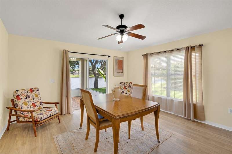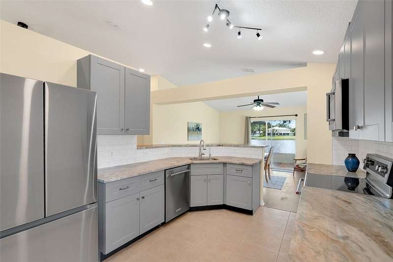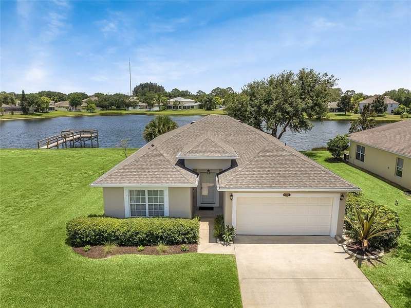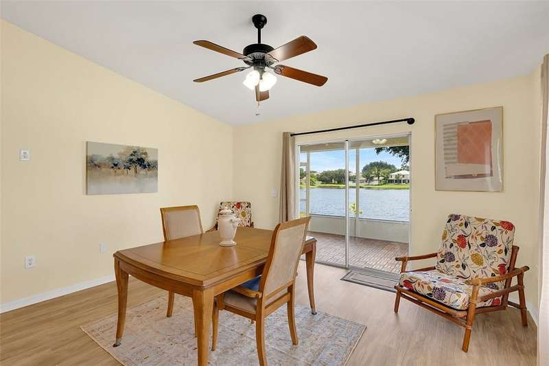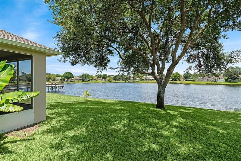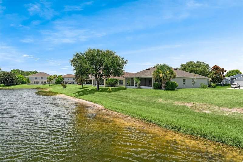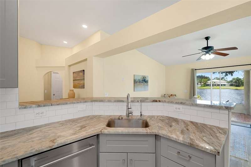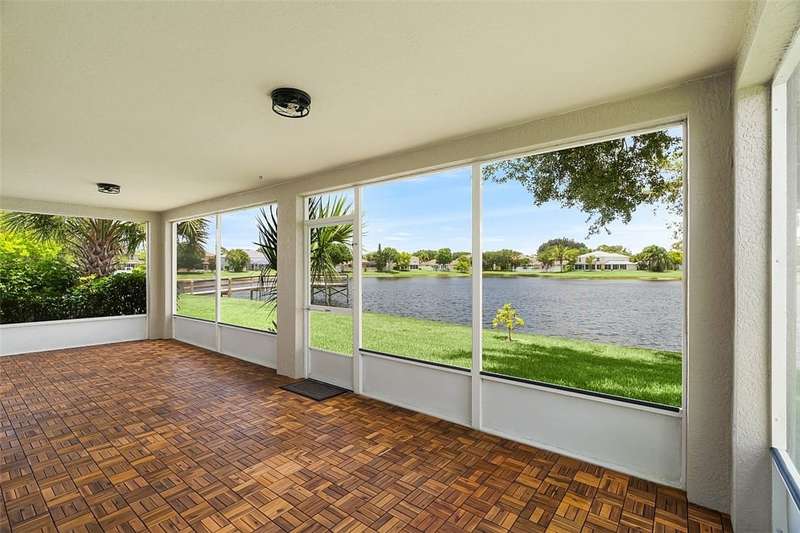 Lakefront living in the gated community of Lakes at Sandridge! This 4bd/2ba home features a flexible open-concept floorplan, expansive water views, a beautifully updated kitchen w/ stone counters, ss KitchenAid appliances, new cabinets, and tile backsplash. Interior features include high, vaulted ceilings, updated primary closet + storage, and bath with a modern tiled shower. Enjoy the screened patio + a 2022 Roof! HOA fees are under $77/month and under $1,100/year for insurance. Why settle for builder-grade finishes and high expenses? A must-see value in a desirable neighborhood! Rm sz apprx.