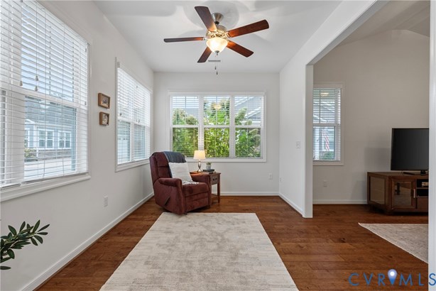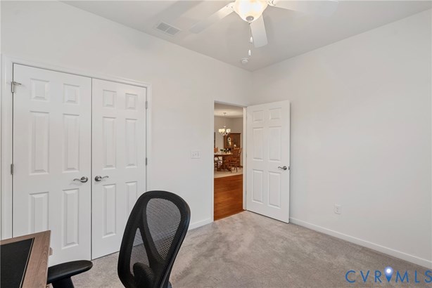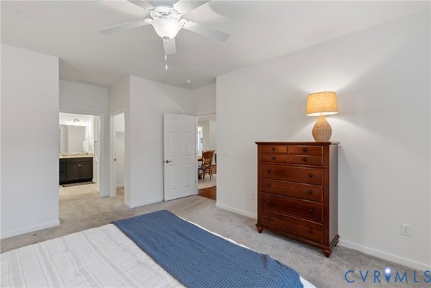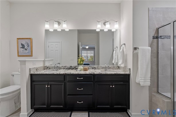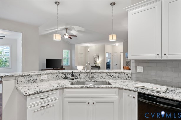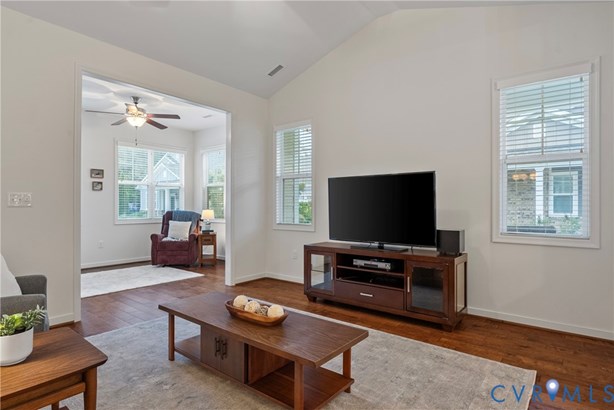 An elegant Villa for sale in Midlothian’s Premier 55+ Community, the Villas at Dogwood! Discover a beautifully maintained villa that blends comfort, style, and convenience—all just minutes from Route 288, shopping, dining, and top medical facilities. This three-bedroom, two-bath home is designed for effortless living and feels brand new. When you step inside this gorgeous home you immediately notice the vaulted ceilings in the living area and gleaming hardwood floors throughout most of the main spaces. The open floor plan seamlessly connects the living room, dining room and kitchen, creating the perfect setting for both everyday living and entertaining. The chef’s kitchen features granite countertops, tile backsplash, bar seating, and a pantry, perfectly laid out to prep meals. In addition, enjoy the sunroom off the living area that invites you to relax with a good book or a cup of coffee. The luxurious primary suite is a true retreat, complete with two walk-in closets and a spa-like bath offering a walk-in tile shower, double adult-height vanity, and tile flooring. There are two additional bedrooms that offer ample closet space and good natural light with ceiling fans and lights. Both bedrooms are adjacent to a spacious full bath and a tub/shower combination. Upstairs, an un-finished second-floor storage area for added convenience off the garage. Additional features include a two-car garage a relaxing covered front porch. Every detail showcases the quality and care that set this home apart. A welcoming 55 and over community encourages both relaxation and connection, this villa offers the perfect balance of luxury living and everyday practicality. The community offers a clubhouse with a fitness center, scenic lake, walking trails and a gazebo area to relax.