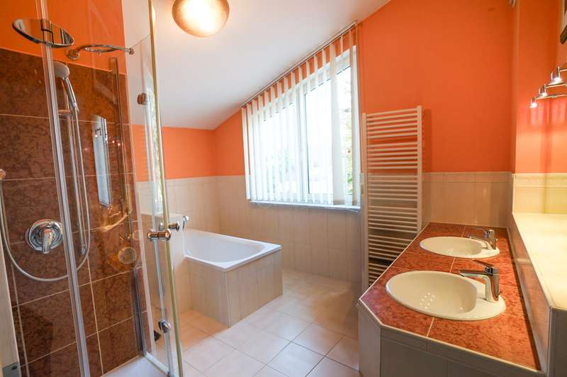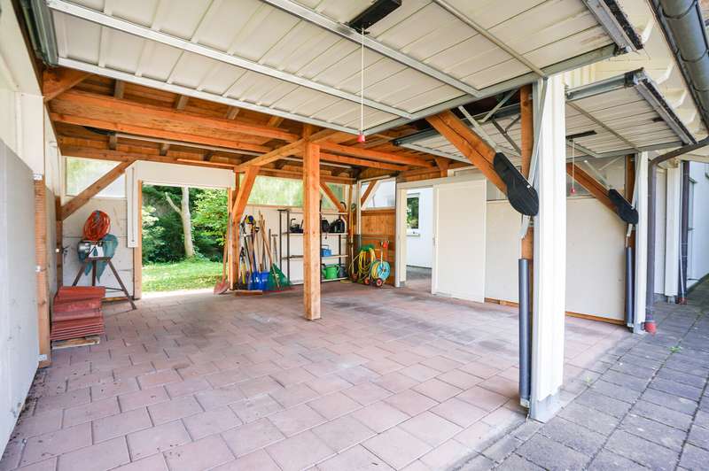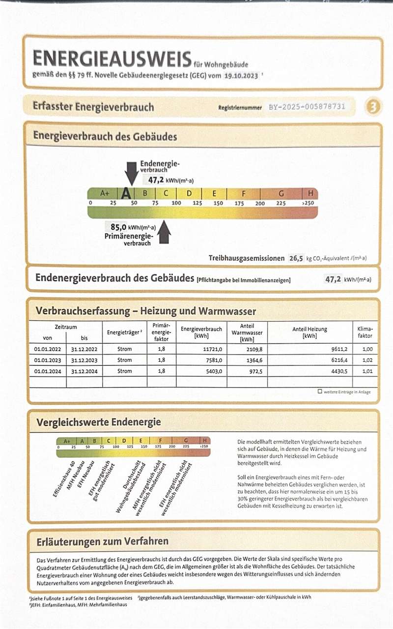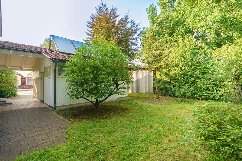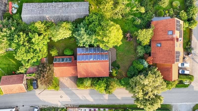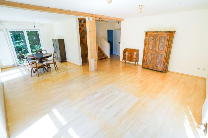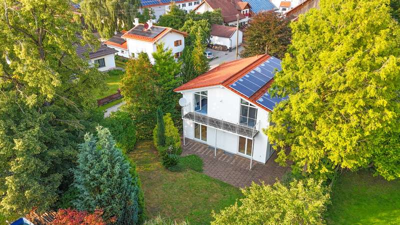 This detached house combines high-quality construction, energy-efficient technology and a well thought-out room concept - ideal for families who want to live healthily and sustainably. The exposé pictures were taken on 06.08.2025 around 18:30. Individual objects were subsequently removed using AI to create a tidy presentation. No changes were made to the structural substance or the actual condition of the property. The images therefore still correspond to the actual situation. The house was built in 2000 using traditional half-timbered construction. The approximately 27 cm thick exterior walls made of spruce construction timber and the controlled living space ventilation with heat recovery create a consistently pleasant and healthy indoor climate. Heating is provided by a modern air-to-water heat pump, supplemented by a photovoltaic system and solar thermal energy - a forward-looking energy concept that saves operating costs and demonstrates environmental awareness. With a living area of approx. 130 m² (including 1/3 of the terrace), the house offers enough space for the whole family. On the first floor, you will find a guest WC, a practical checkroom niche and the kitchen with natural stone worktop. The light-flooded living room with four floor-to-ceiling windows offers direct access to the terrace and impresses with its brightness and spaciousness. The staircase leads to the well-kept, tiled basement, which is also heated. Four usable rooms are available here: a workshop/hobby room (approx. 21 m²), a storage room (approx. 12 m²), a laundry room (approx. 12 m²), and a technical/heating room (approx. 12 m²). Upstairs there are three bright bedrooms and a stylish daylight bathroom with double washbasin, shower, free-standing bathtub and WC. A balcony of approx. 9 m² connects the two children's rooms and extends the living comfort into the open air. Particularly impressive is the up to 3.8 m high attic with high-quality rock wool insulation (18 cm) - a real highlight for lovers of airy rooms. Outside, the sunny west-facing terrace invites you to enjoy cozy barbecue evenings. The approx. 380 m² garden offers plenty of space for playing, relaxing and gardening. The offer is rounded off by a spacious double garage and additional parking spaces in the traffic-calmed 30 km/h zone directly in front of the house. The surrounding nature - with the mountains in the immediate vicinity - invites you to enjoy relaxing walks and a variety of leisure activities. Come and see this special home for yourself during a viewing. We look forward to your inquiry!