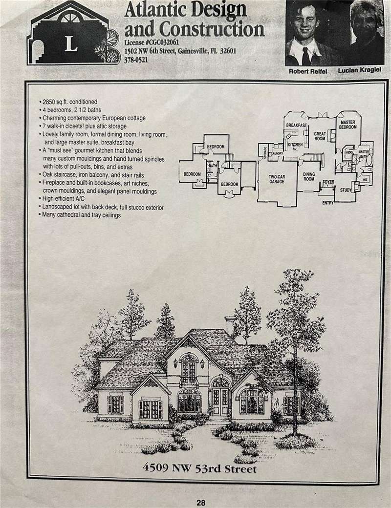 Welcome to this stunning former Parade of Homes Cover Home! Built by Atlantic Design, this French Country 4-bedroom, 2.5-bathroom home is located in the desirable Huntington neighborhood of Gainesville. As you step through the front door, you're greeted by a warm and inviting foyer that sets the tone for the rest of the home. Just off the foyer, a flexible sitting room offers the perfect space for a home office, reading nook, or creative studio. The formal dining room is ideal for hosting large gatherings and connects seamlessly to the chef’s kitchen through a hallway with a generous walk-in pantry. The kitchen is a dream, featuring an island with countertop seating, ample counter space, sensor faucet, and a bright breakfast nook surrounded by windows. The spacious living room boasts cathedral ceilings, tons of crown molding, a cozy fireplace, and elegant French doors that open to the backyard, perfect for indoor-outdoor living and entertaining. A conveniently located half bath serves guests with style and ease. The first-floor primary suite is a true retreat, with stunning ceiling details, abundant natural light, and direct access to the backyard patio. The luxurious en-suite bathroom offers a spa jacuzzi tub, walk-in shower, dual vanities, and two spacious walk-in closets. Walk up using the custom iron stair railing to upstairs where you’ll find three generously sized bedrooms, each with large walk-in closets and flexible space for guests, hobbies, or work-from-home needs. These bedrooms share a well-appointed full bathroom with a tub/shower combo and a double sink vanity. Step outside to your private backyard oasis, complete with a deck and a charming gazebo, perfect for relaxing or entertaining under the stars. You even have a 2 plus car garage with a work shop area. An abundance of storage closets, and even walk up attic with tons of storage space. Updates include a 2024 Roof and 2020 A/C. Don’t miss your chance to own this thoughtfully designed iconic home on a very private lot that has inspired even artists to paint it! All walkable to Starbucks, One Love Cafe, Farmer's Market, restaurants, UF Health, and more! All currently zoned for A rated schools (Meadowbrook, Fort Clarke, and Buchholz). Schedule your showing today!