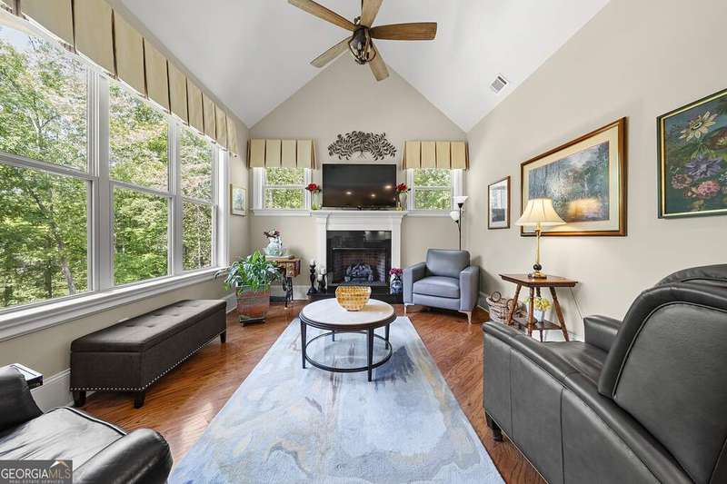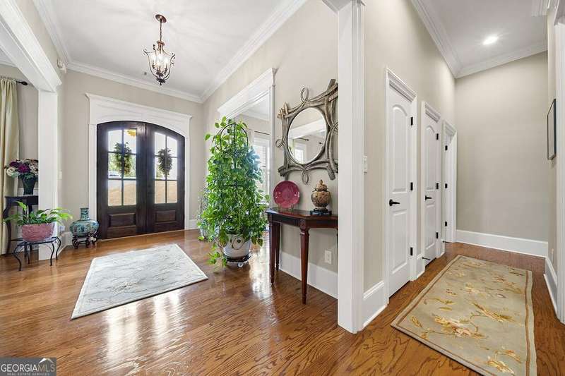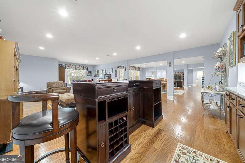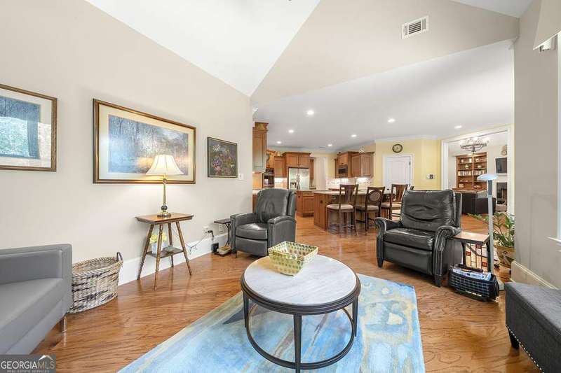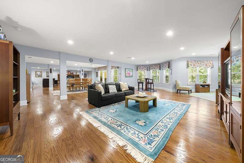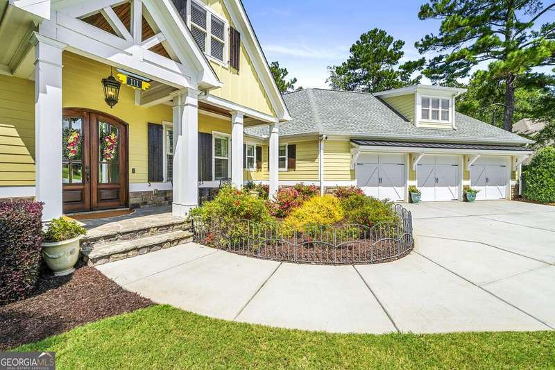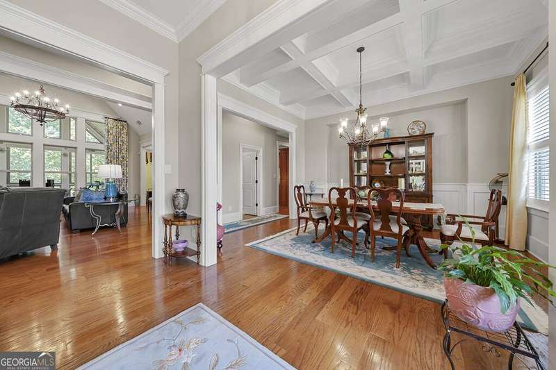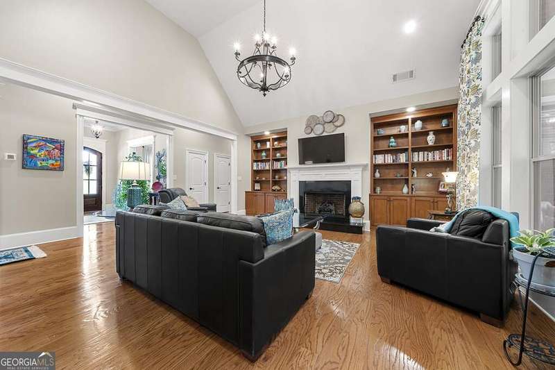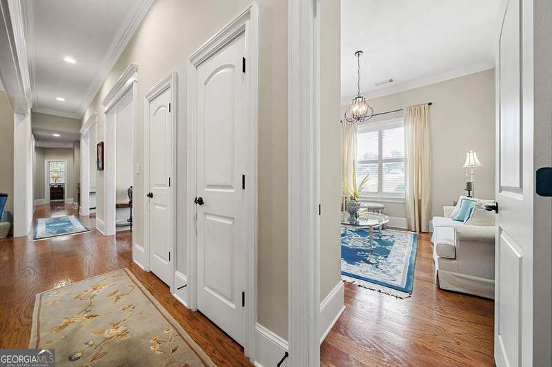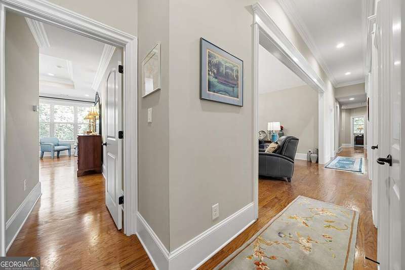 Tucked away at the end of a quiet cul-de-sac, this beautifully maintained ranch with a finished basement offers 1.22 acres and 200 feet of serene lakefront living. With approximately 6,556 square feet, including both finished and unfinished space, this home combines timeless craftsmanship with modern comfort. A flagstone front porch welcomes you inside through elegant wood and glass double doors into a light-filled foyer. To one side, a formal dining room features a coffered ceiling and wainscoting. On the other side, a versatile flex room provides space for an office, sitting room, or reading nook. The vaulted family room, complete with fireplace and built-ins, flows into the kitchen, which is designed with custom cabinetry, stainless steel appliances, a double oven, gas cooktop, pull-out spice racks, walk-in pantry, and an island. The adjoining keeping room, breakfast nook, and sunroom with a stained-wood vaulted ceiling and motorized custom shades all offer sweeping views of the lake. The primary suite is a retreat of its own, with a tray ceiling, sitting area with lake view, and a bathroom featuring an expansive dual sink vanity, a whirlpool tub, a walk-in shower filled with natural light, and a generous walk-in closet. Two additional bedrooms with a Jack-and-Jill bath, a powder room, and a well-equipped laundry room complete the main floor. The finished basement extends the living space with multiple open areas for entertaining, a kitchenette, office, dining area, large full bath, and ample storage. It also includes a storm-safe sitting room and a large unfinished space with shelving for seasonal decor. An oversized three-car garage and a whole-house water filtration system add convenience, while the community amenities include two lakes, a dock, pool, tennis courts, clubhouse, and 24-hour fitness center. Bring your kayaks, canoes, or fishing gear and enjoy life on the water. Just minutes from Trilith Studios, Trilith's boutique shops and restaurants, Piedmont Wellness Center, and with easy access to Fayetteville, Peachtree City, Piedmont Hospital, and the Atlanta airport, this home offers both tranquility and convenience. Be sure to view the 3D virtual tour link to fully appreciate everything this property has to offer.