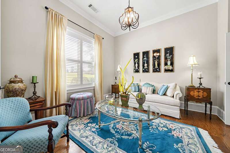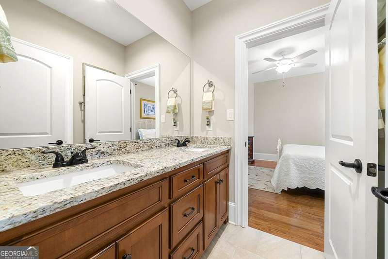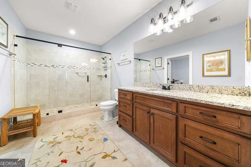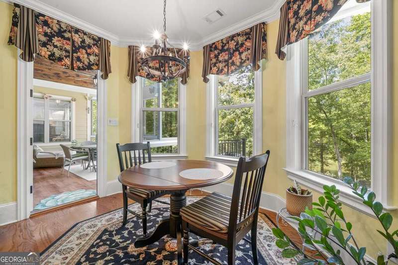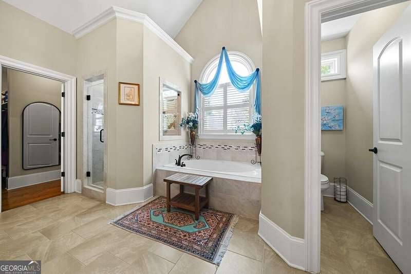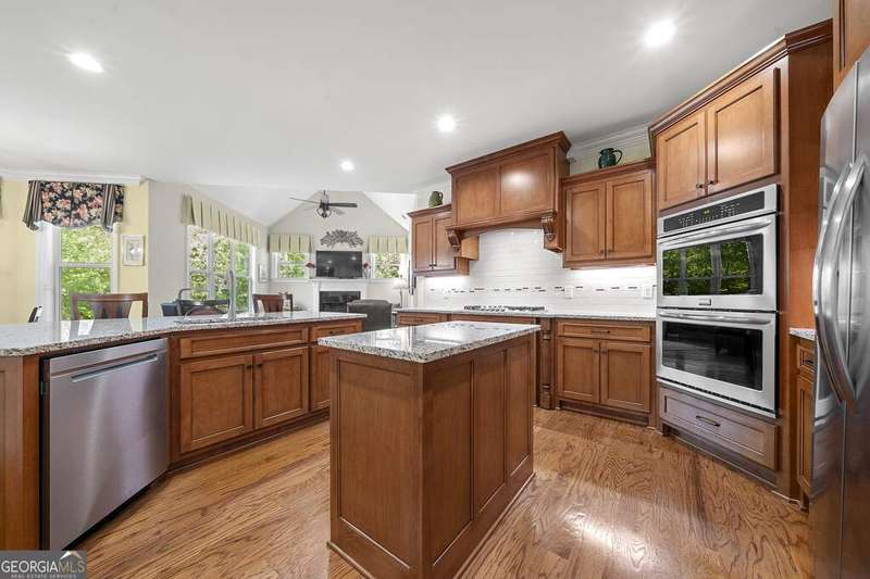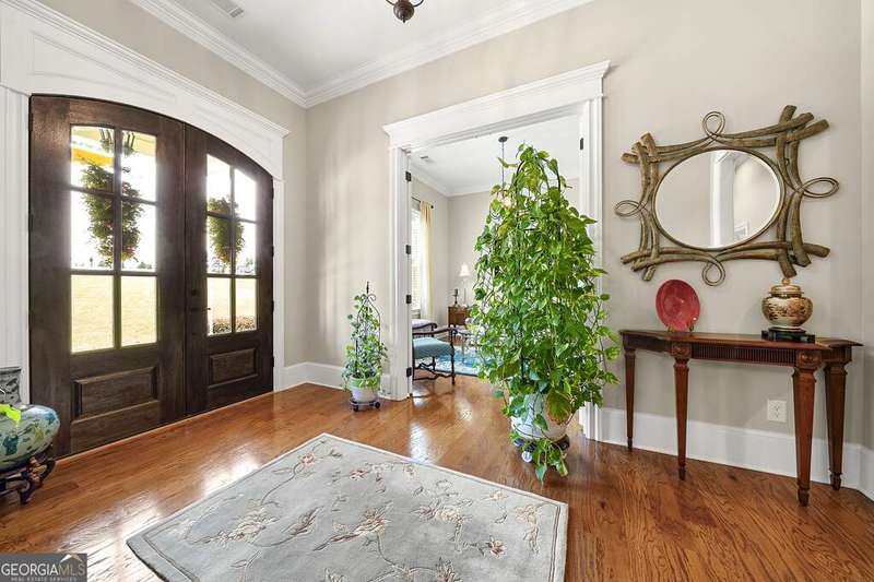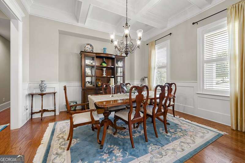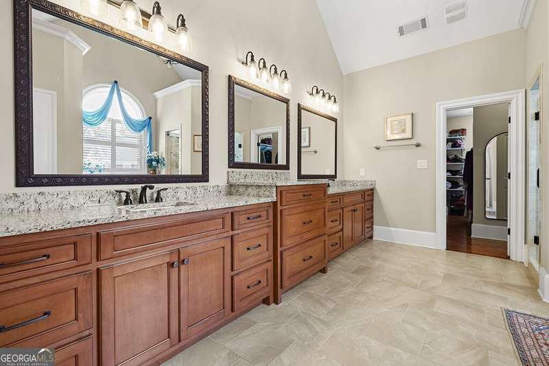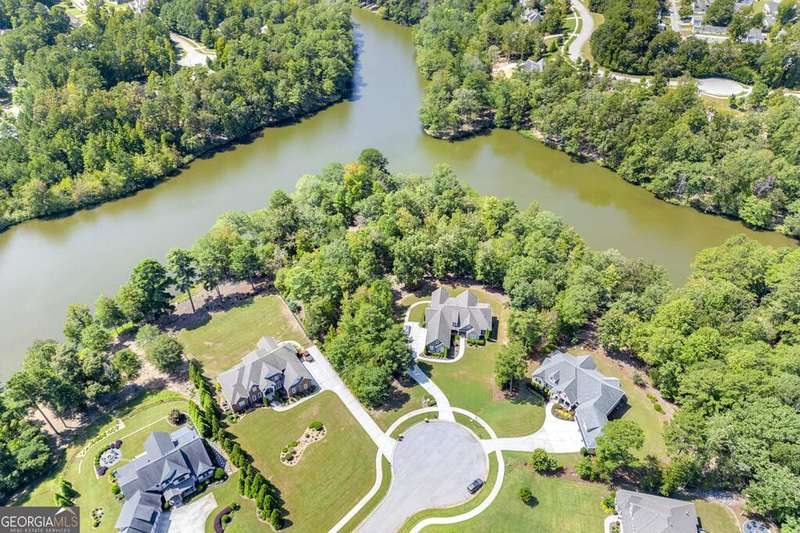 Tucked away at the end of a quiet cul-de-sac, this beautifully maintained ranch with a finished basement offers 1.22 acres and 200 feet of serene lakefront living. With approximately 6,556 square feet, including both finished and unfinished space, this home combines timeless craftsmanship with modern comfort. A flagstone front porch welcomes you inside through elegant wood and glass double doors into a light-filled foyer. To one side, a formal dining room features a coffered ceiling and wainscoting. On the other side, a versatile flex room provides space for an office, sitting room, or reading nook. The vaulted family room, complete with fireplace and built-ins, flows into the kitchen, which is designed with custom cabinetry, stainless steel appliances, a double oven, gas cooktop, pull-out spice racks, walk-in pantry, and an island. The adjoining keeping room, breakfast nook, and sunroom with a stained-wood vaulted ceiling and motorized custom shades all offer sweeping views of the lake. The primary suite is a retreat of its own, with a tray ceiling, sitting area with lake view, and a bathroom featuring an expansive dual sink vanity, a whirlpool tub, a walk-in shower filled with natural light, and a generous walk-in closet. Two additional bedrooms with a Jack-and-Jill bath, a powder room, and a well-equipped laundry room complete the main floor. The finished basement extends the living space with multiple open areas for entertaining, a kitchenette, office, dining area, large full bath, and ample storage. It also includes a storm-safe sitting room and a large unfinished space with shelving for seasonal decor. An oversized three-car garage and a whole-house water filtration system add convenience, while the community amenities include two lakes, a dock, pool, tennis courts, clubhouse, and 24-hour fitness center. Bring your kayaks, canoes, or fishing gear and enjoy life on the water. Just minutes from Trilith Studios, Trilith's boutique shops and restaurants, Piedmont Wellness Center, and with easy access to Fayetteville, Peachtree City, Piedmont Hospital, and the Atlanta airport, this home offers both tranquility and convenience. Be sure to view the 3D virtual tour link to fully appreciate everything this property has to offer.