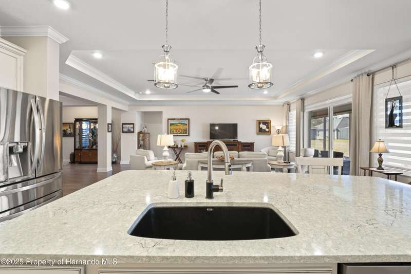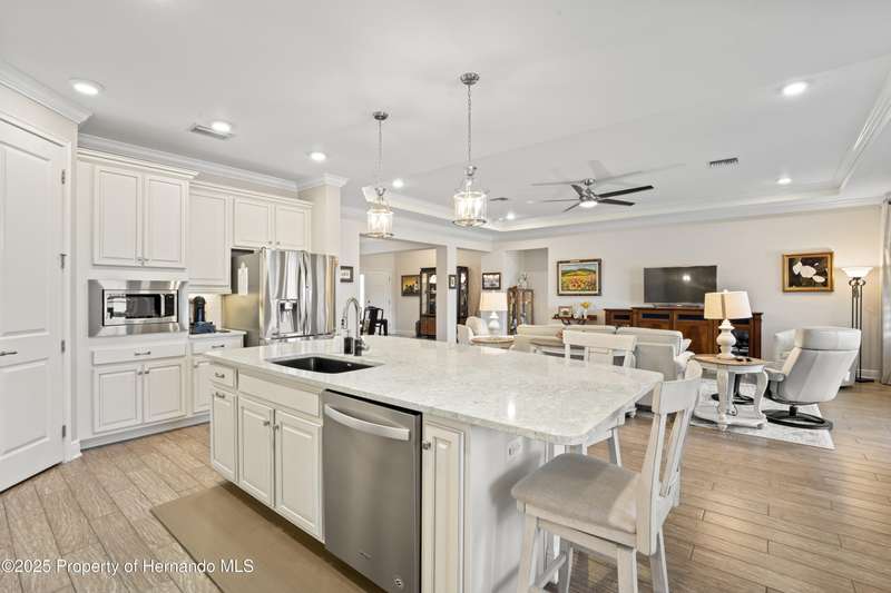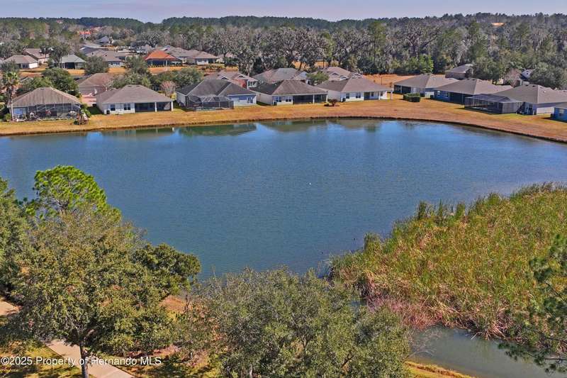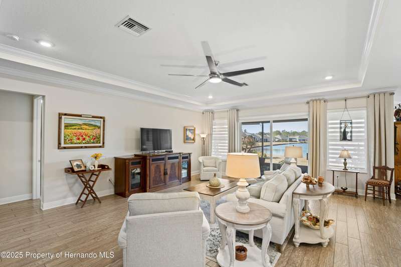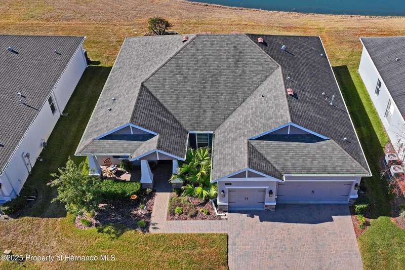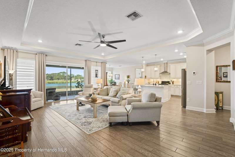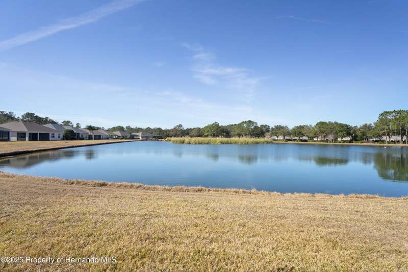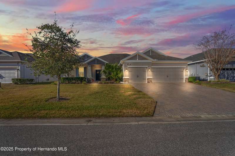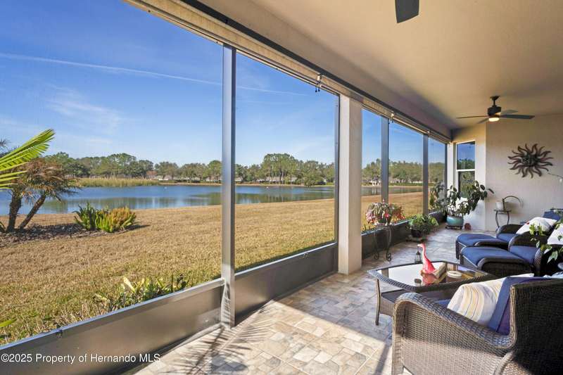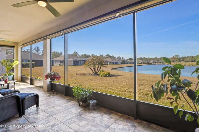 Still time to close by end of year and qualify for homesteading tax credit in Florida if this is your primary home! Immaculate Lakefront Home in The Cascades at Southern Hills - 55+ Community New! Homeowner is providing the initiation charge for a Sports Social Membership at Southern Hills Plantation Club. This includes 6 rounds of golf (and a guest if so desired), fitness center, tennis and pickleball courts, the pool at the country club and country club access including dining and all lifestyle functions. 2500 dollar Credit given at closing. Nearly new and move-in ready, this stunning 2-bedroom + office/3rd bedroom home offers high-end finishes, thoughtful upgrades, and beautiful sunset views over a serene lake. The chef's kitchen features a gas range with wall-mounted hood, intricate tile backsplash, under-cabinet lightin g, 42'' cabinets, walk-in pantry, Cambria quartz countertops, large island with composite sink, and built-in microwave. Open-concept living with tray ceilings, crown molding, 6'' baseboards, tile floors (carpet in bedrooms), ceiling fans throughout, and custom window treatments (Silhouette shades & faux wood blinds). Primary suite includes two walk-in closets and a spa-like bath with granite double vanity and walk-in shower. Guest bath also features granite finishes. French doors open to a flexible office/3rd bedroom. Enjoy outdoor living on the extended, covered, and screened lanai with retractable mechanical shades and pond views. Additional features: Three garage doors for cars/golf cart Attic storage with garage access Utility sink and cabinets in garage Water softener system & generator outlet Gas water heater & Sentricon pest control system Washer & dryer included Mature landscaping with front/back irrigation maintained by the HOA. HOA also includes cable, internet, heated pool, clubhouse access, and a full calendar of social activities. Optional membership to Southern Hills Country Club available. Fully pavered driveway. This pristine home offers comfort, elegance, and an active lifestyle-all in a beautifully maintained community.