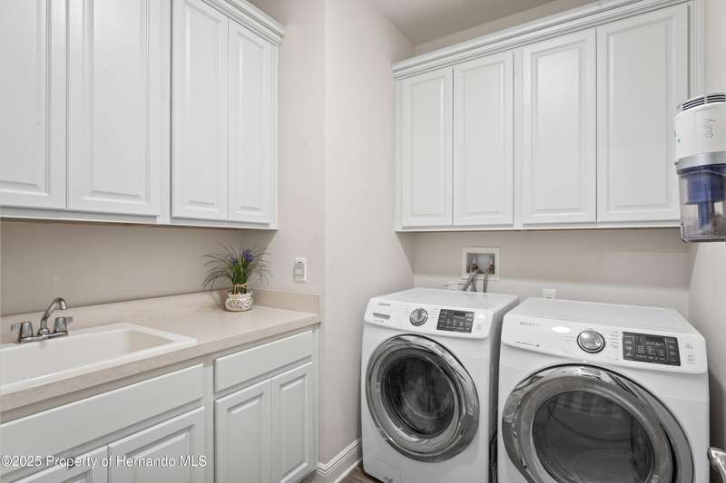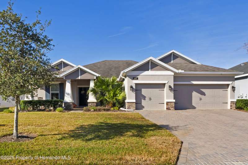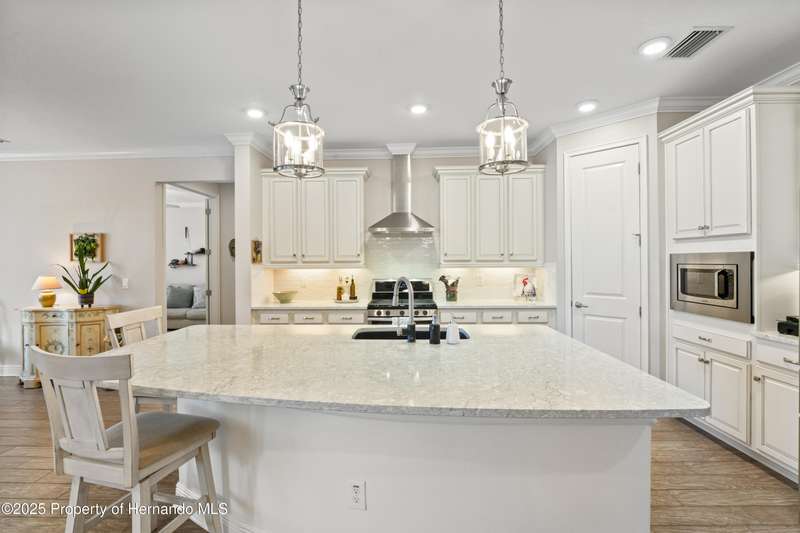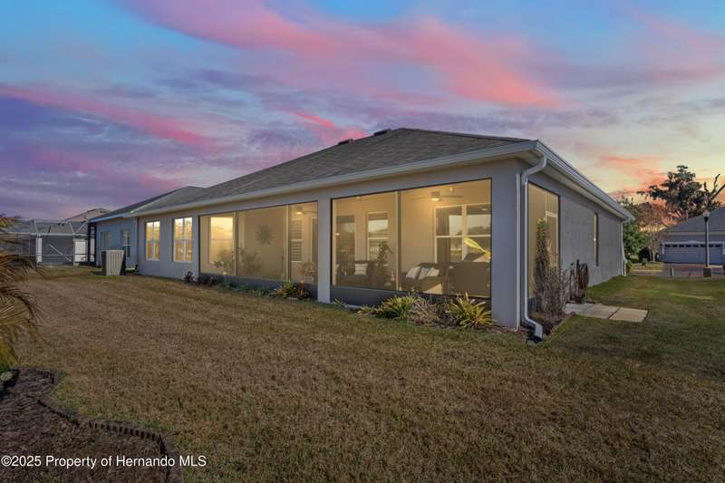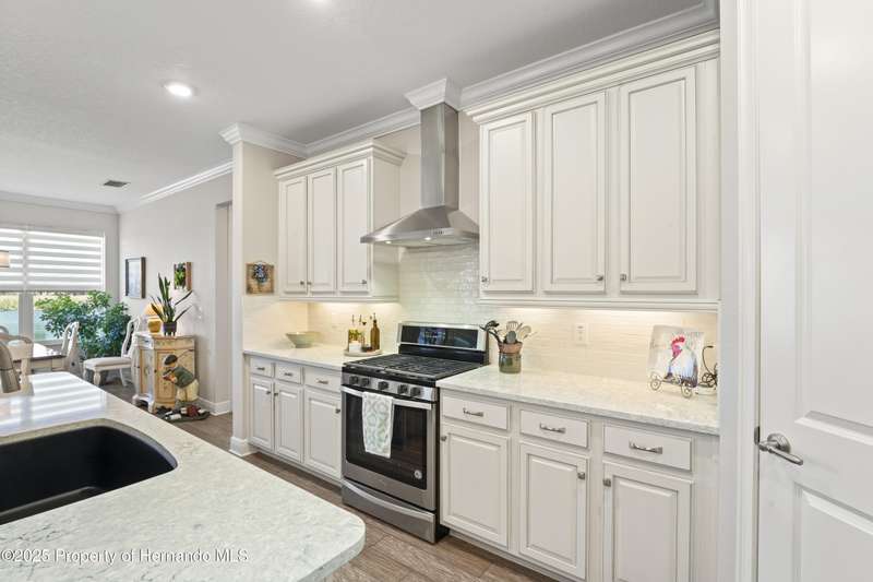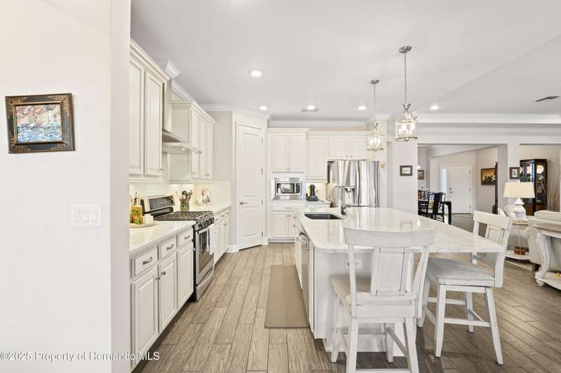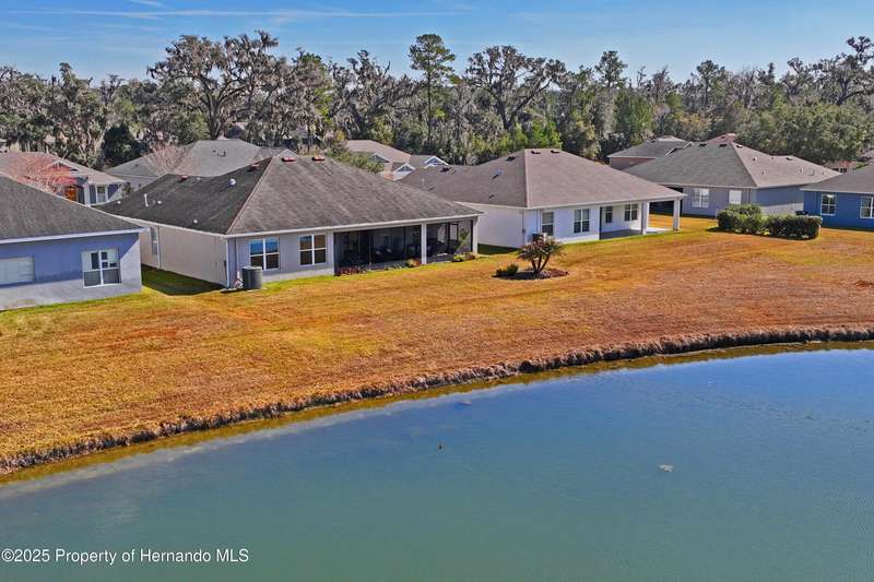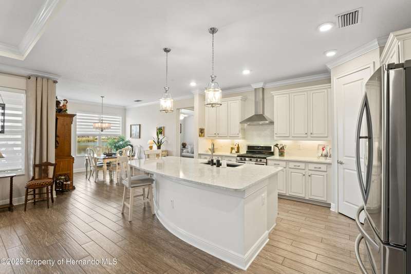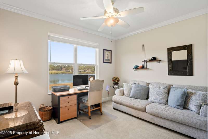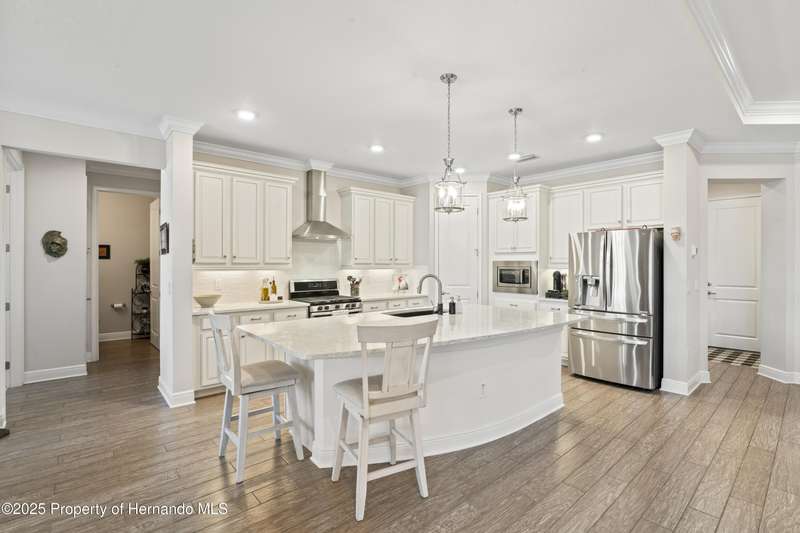 Still time to close by end of year and qualify for homesteading tax credit in Florida if this is your primary home! Immaculate Lakefront Home in The Cascades at Southern Hills - 55+ Community New! Homeowner is providing the initiation charge for a Sports Social Membership at Southern Hills Plantation Club. This includes 6 rounds of golf (and a guest if so desired), fitness center, tennis and pickleball courts, the pool at the country club and country club access including dining and all lifestyle functions. 2500 dollar Credit given at closing. Nearly new and move-in ready, this stunning 2-bedroom + office/3rd bedroom home offers high-end finishes, thoughtful upgrades, and beautiful sunset views over a serene lake. The chef's kitchen features a gas range with wall-mounted hood, intricate tile backsplash, under-cabinet lightin g, 42'' cabinets, walk-in pantry, Cambria quartz countertops, large island with composite sink, and built-in microwave. Open-concept living with tray ceilings, crown molding, 6'' baseboards, tile floors (carpet in bedrooms), ceiling fans throughout, and custom window treatments (Silhouette shades & faux wood blinds). Primary suite includes two walk-in closets and a spa-like bath with granite double vanity and walk-in shower. Guest bath also features granite finishes. French doors open to a flexible office/3rd bedroom. Enjoy outdoor living on the extended, covered, and screened lanai with retractable mechanical shades and pond views. Additional features: Three garage doors for cars/golf cart Attic storage with garage access Utility sink and cabinets in garage Water softener system & generator outlet Gas water heater & Sentricon pest control system Washer & dryer included Mature landscaping with front/back irrigation maintained by the HOA. HOA also includes cable, internet, heated pool, clubhouse access, and a full calendar of social activities. Optional membership to Southern Hills Country Club available. Fully pavered driveway. This pristine home offers comfort, elegance, and an active lifestyle-all in a beautifully maintained community.