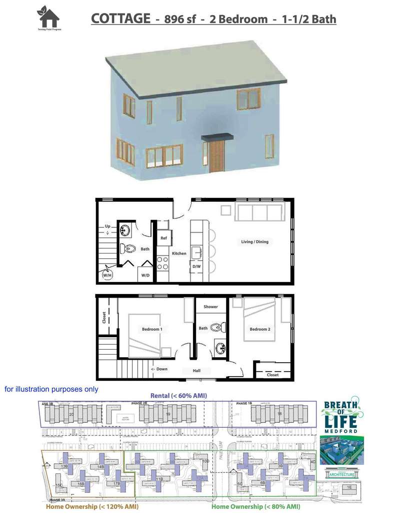 Breath of Life Medford is Oregon's first Net Zero Energy Community with 142 mixed-use units and affordable housing development. The Cottage Floor Plan is a 896sf 2 bedroom 1 1/2 bath home featuring hi-tech building materials and energy efficient construction where true fire-resistant construction meets affordable homeownership security. The Cottage features an open, efficient floorplan designed for comfortable living and peace of mind. Inside, you'll find modern finishes, ample natural light, and vaulted ceiling where our tech panels offer superb acoustic ratings for an open and bright feeling while still offering privacy and energy efficiency. Thoughtfully designed living areas flow seamlessly for both everyday living and entertainment. The Monthly Association fee includes Power, Water/Sewer, High Speed Internet, Garbage, Exterior Landscape and Grounds upkeep.