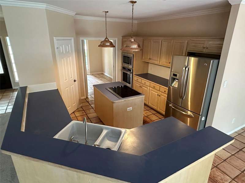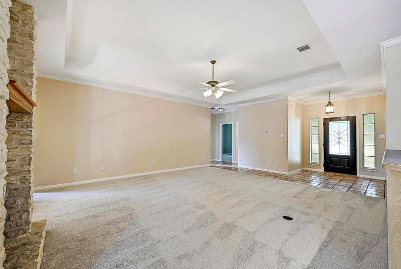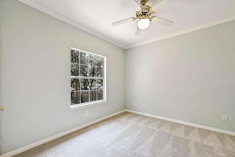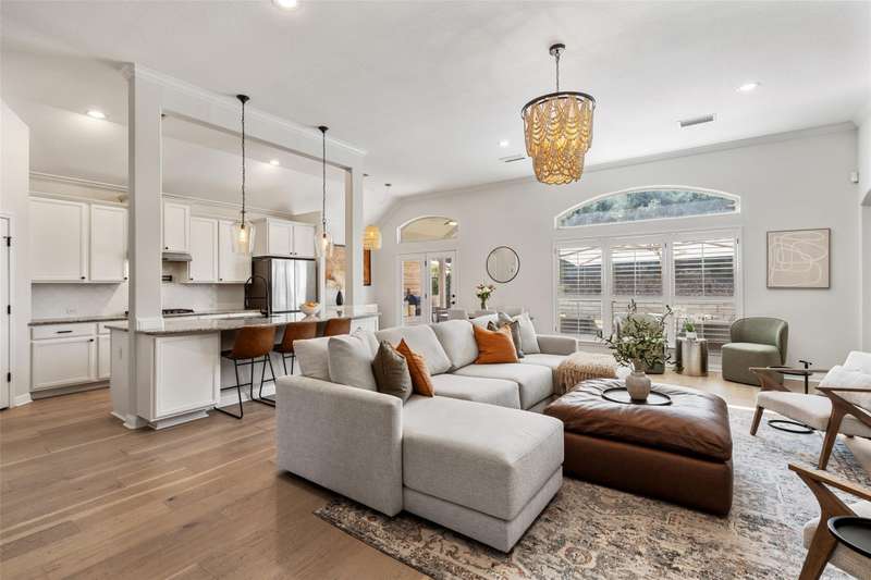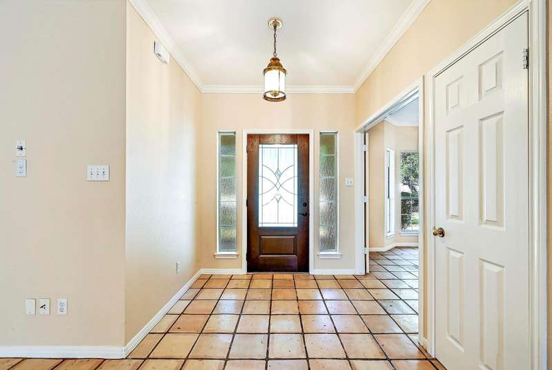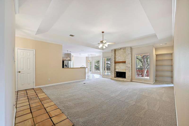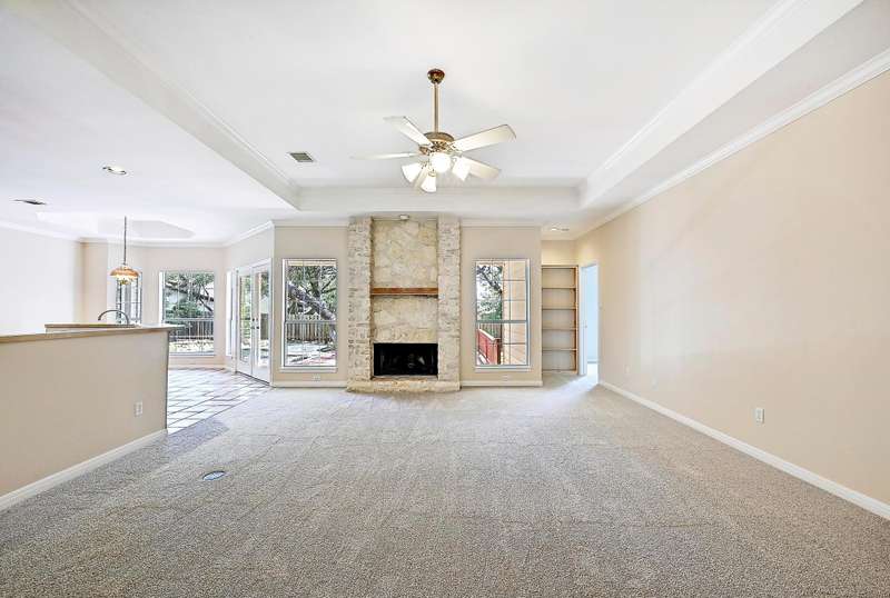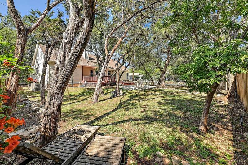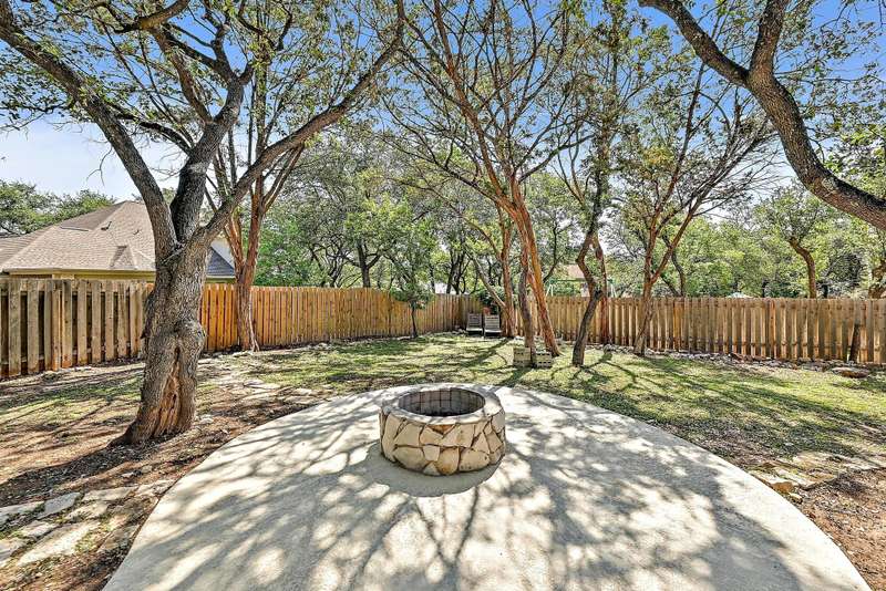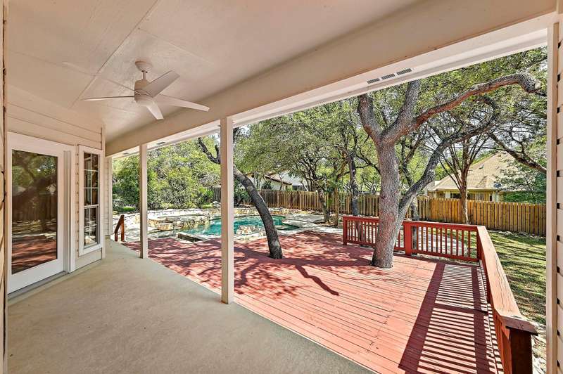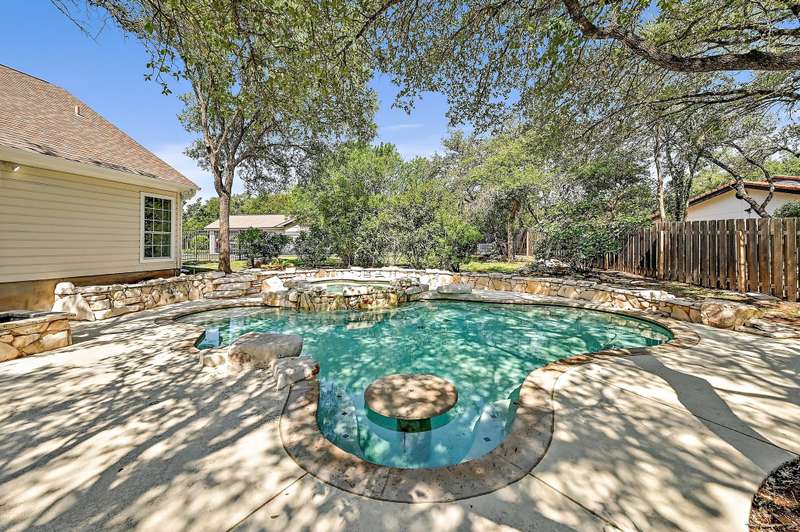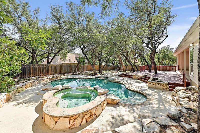 Tucked away in the heart of Lakeway and situated on a quiet street with almost no thru traffic, this hard-to-find single-story, 4-bedroom home with a pool combines comfort and functionality with a layout that works beautifully for everyday living or entertaining. Featuring a generous floor plan and a backyard designed for year-round enjoyment. From the moment you arrive, you're welcomed by a charming stone facade, circular drive, and side-entry garage, all framed by mature trees and a large covered front porch. Inside, the home has been thoughtfully prepared for the market with fresh interior and exterior paint and new carpet. The main living area is the heart of the home, with high ceilings, a fireplace, and serene backyard views that fill the space with natural light. Just off the entry is a second living area that can serve as an additional living room, home office, playroom or formal dining. The kitchen provides plenty of counter space with a center island, breakfast bar, stainless appliances, and a large pantry, all overlooking the breakfast room and main living area to create a seamless open-concept flow. The MIL plan places the primary suite on the west wing of the house, with direct access to the pool, and spa. The ensuite bath features a jetted tub, separate shower, dual vanities, built-in storage, and a walk-in closet. On the opposite wing, you'll find three generously sized secondary bedrooms with ample closet space, and two full baths. An oversized laundry room offers abundant storage with built-in cabinetry, counters with a sink, and a built-in desk or craft nook. Enjoy the large, private backyard with a heated in-ground pool, spa with waterfall feature, covered patio, wood deck, and firepit. Located just minutes from Lake Travis, shopping, dining, award-winning golf, and zoned to the acclaimed Lake Travis ISD and exceptional Lakeway Elementary. This home has it all, offering timeless appeal and the opportunity to make it your own - move-in ready!