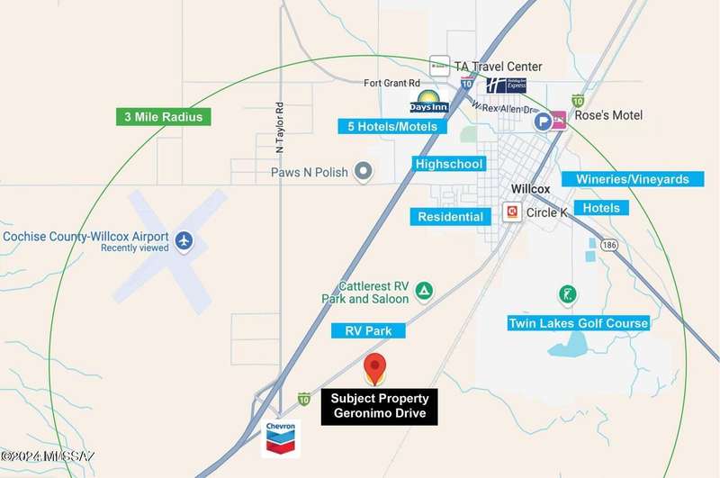 : Perfect property for a new business zoned GB (General Business) with endless potential for the commercial parcel: RV/Boat Storage andPark, warehouse, re-zone to industrial, etc. Owner finance and land leasing available. Great location with easy access from I-10 and close to all amenitiesand residential Willcox. (See map.) Popular tourist route with local wineries and Chiricahua Mtns. Also, a smart long-term investment to hold!