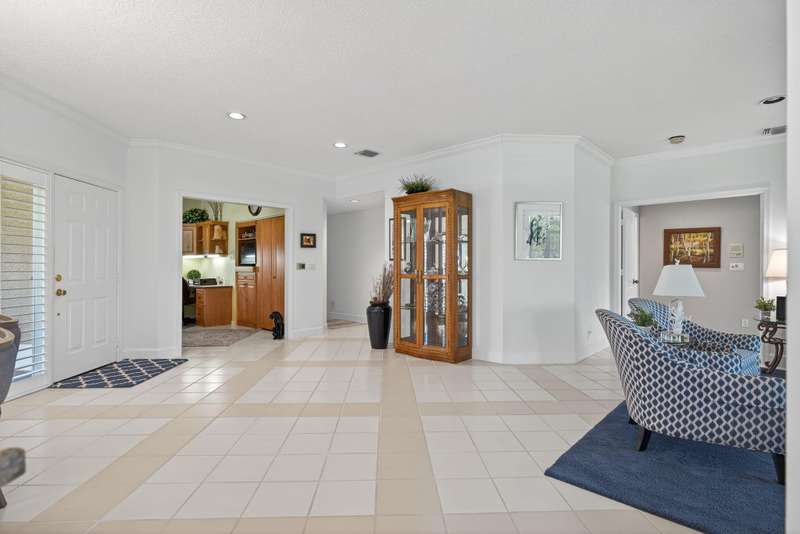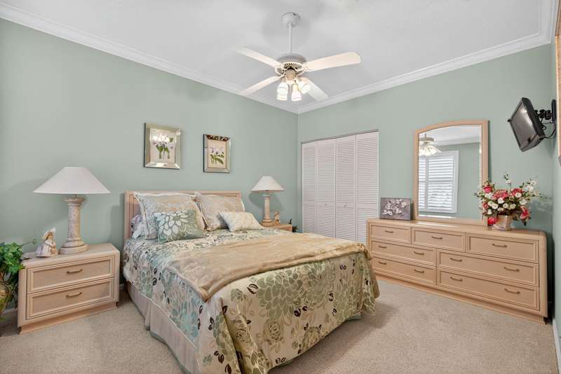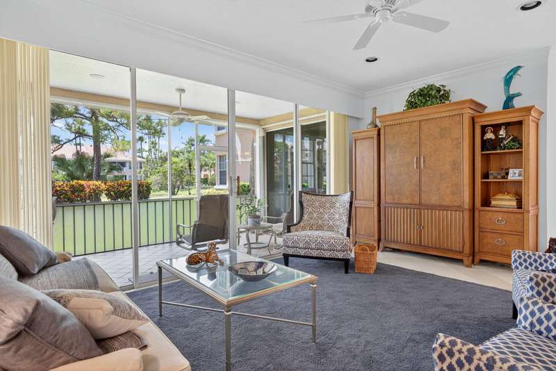 Highly desirable first floor Legends Condo. The entry is adjacent to a peaceful green space. As you enter you are welcomed in with lovely furnishings with the cool modern look of today. Totally remodeled, warm caramel wood kitchen cabinets. luxurious primary suite, sitting area, spacious closet, and sliders to the patio. Views of lovely lake, and warm sunsets. Guest bedroom is situated separately from main living and adjacent to the guest bath. Convertible Den features warm wooden cabinetry, with built in desk and closet. The Legends has always been known for the pleasant atmosphere for full time residents and seasonal as well.